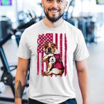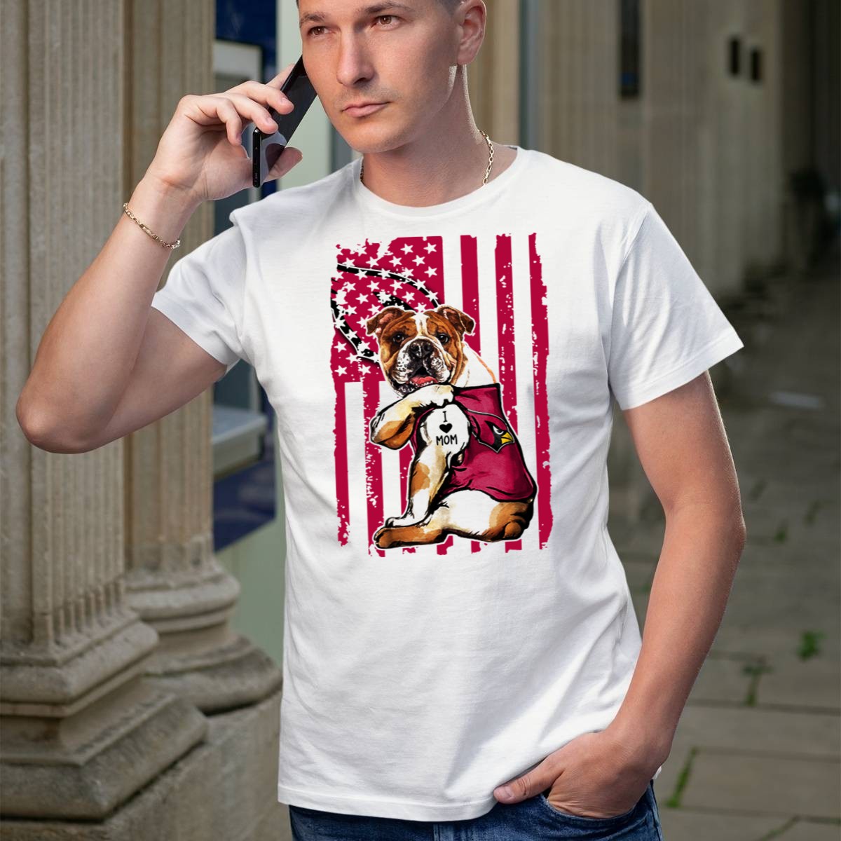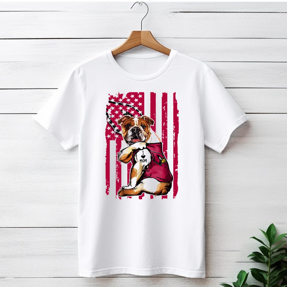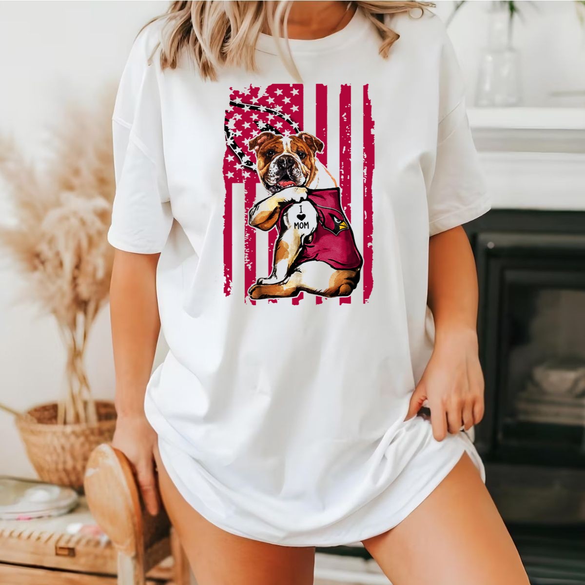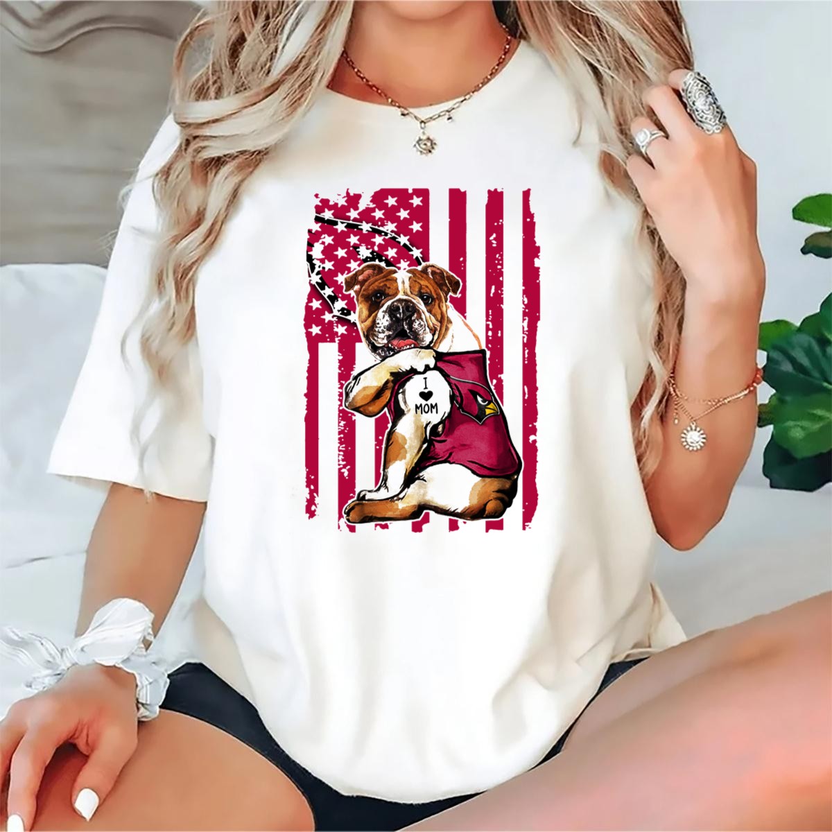 Bulldog in Arizona Cardinals Shirt with I Love Mom Tattoo and American Flag Backdrop T-Shirt