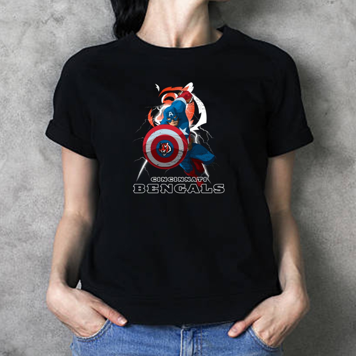 Show your unwavering support for the Cincinnati Bengals with our Captain America Lightning Shield T-Shirt! Perfect for fans who want to blend their love for football and superhero flair, this fan-made design is ideal for casual outings, themed events, or just lounging around. Made in the USA, this shirt not only celebrates your team spirit but also offers a unique style that’s sure to turn heads.