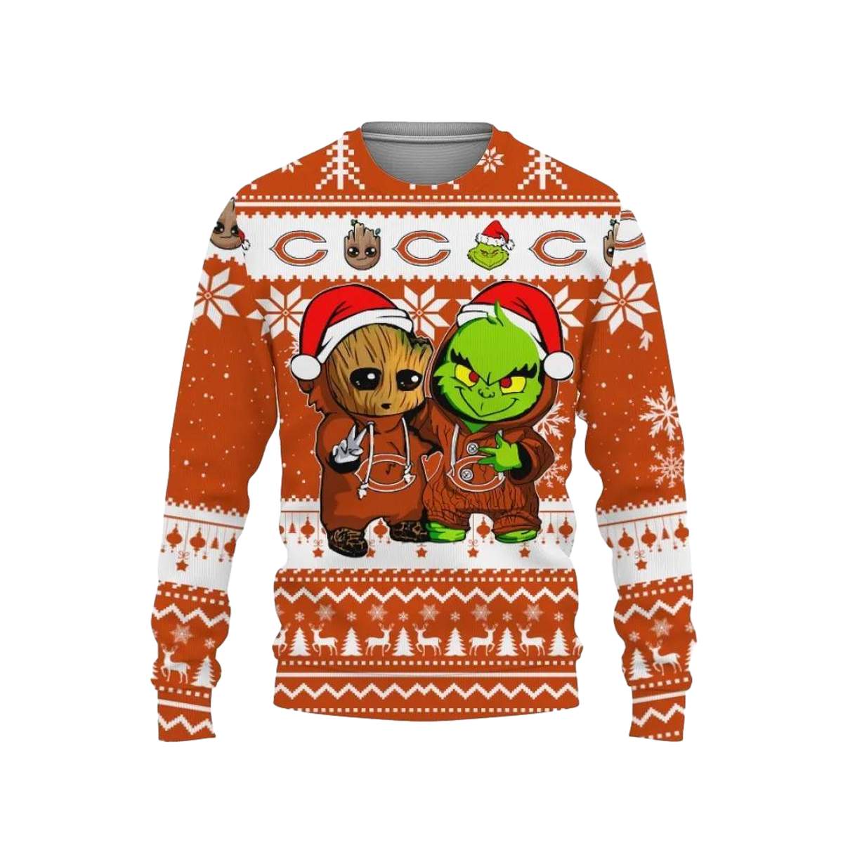 Get ready for the ultimate holiday cheer with our Chicago Bears Baby Groot and Grinch Best Friends Ugly Sweater! Perfect for die-hard Bears fans and lovers of all things festive, this sweater is your go-to for holiday parties, cozy family gatherings, or just lounging at home while sipping hot cocoa. With its playful design featuring two beloved characters, it’s sure to spark smiles and add a dash of fun to your winter wardrobe!
