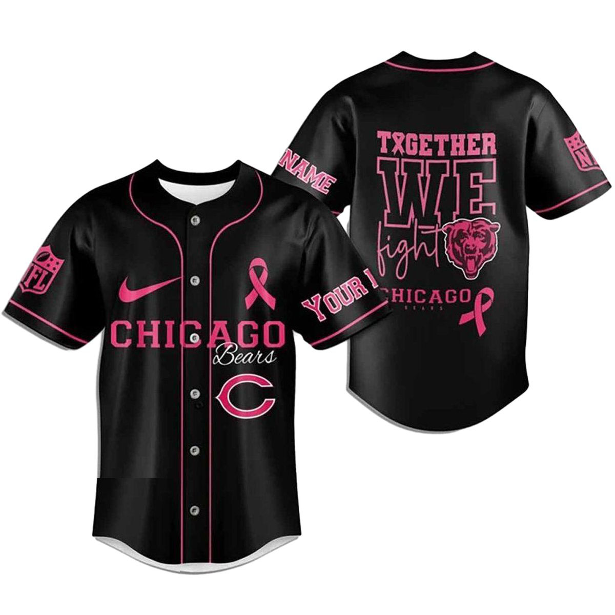 Show your support in style with our custom Chicago Bears Breast Cancer Black Baseball Jersey. Perfect for game days, casual outings, or as part of your team uniform, this jersey combines sporty aesthetics with a meaningful cause, making it a must-have for fans and athletes alike.