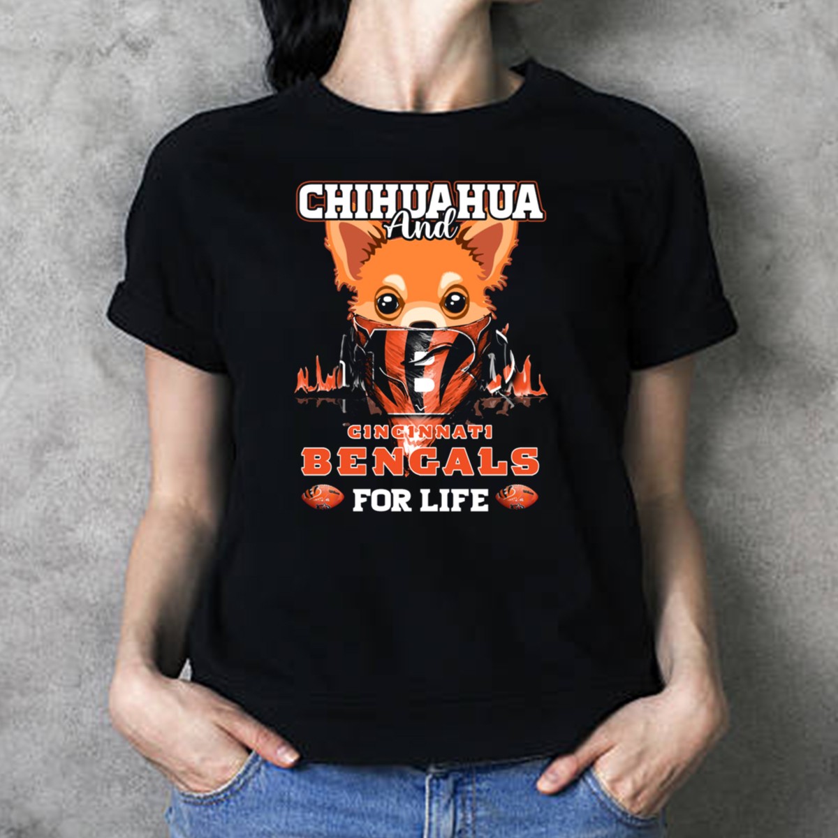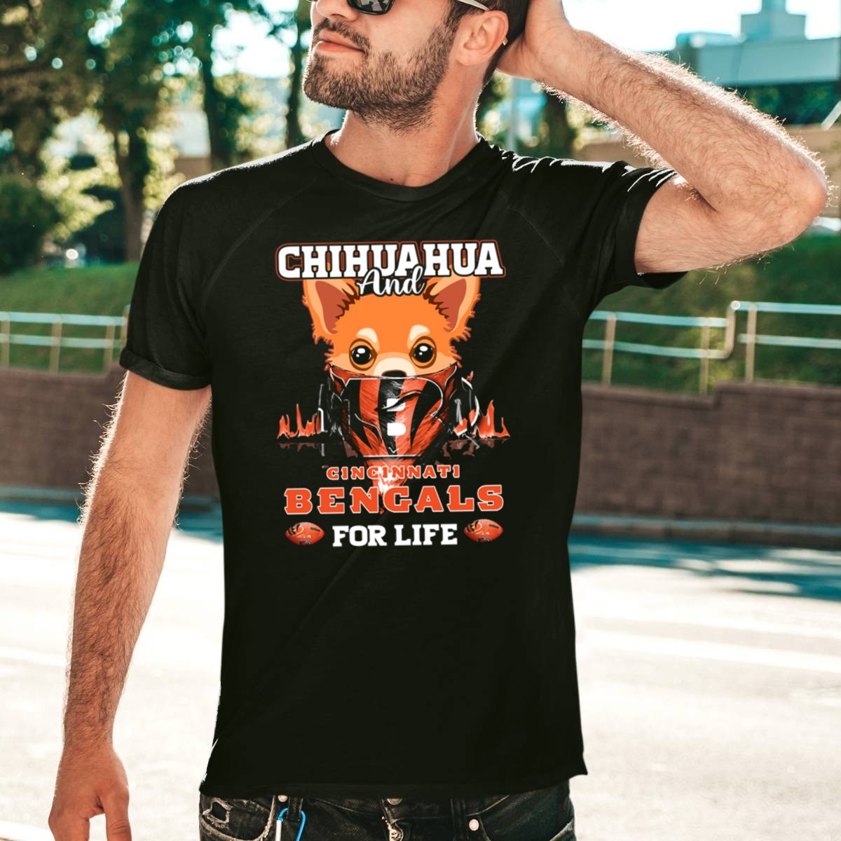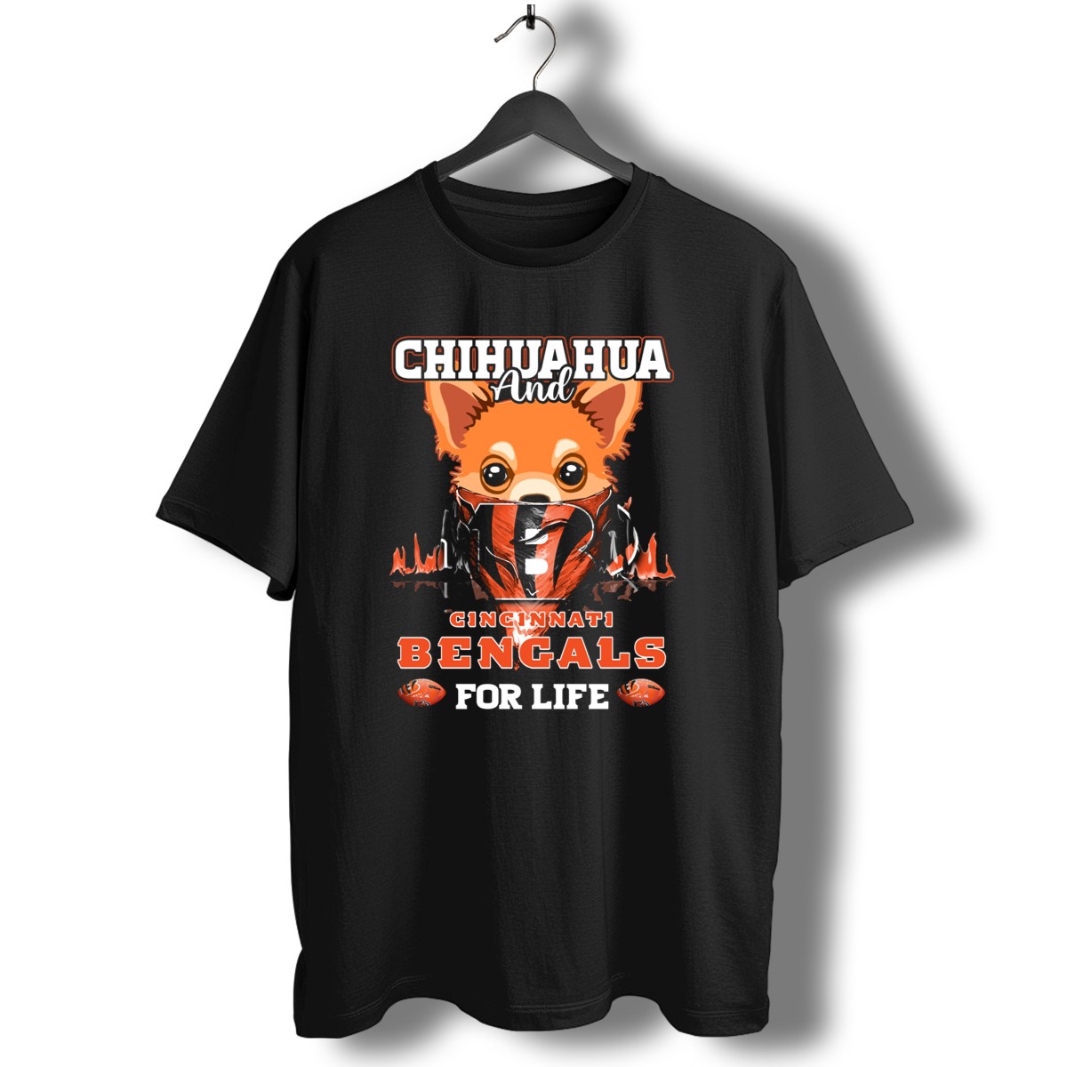 Showcase your love for both your furry friend and your favorite football team with the CHIHUAHUA AND CINCINNATI BENGALS FOR LIFE T-Shirt! This fan-made design is perfect for devoted Bengals fans who can’t get enough of their adorable Chihuahuas. Ideal for casual outings, game days, or themed events, this shirt blends style and comfort effortlessly, making it a must-have addition to your wardrobe.