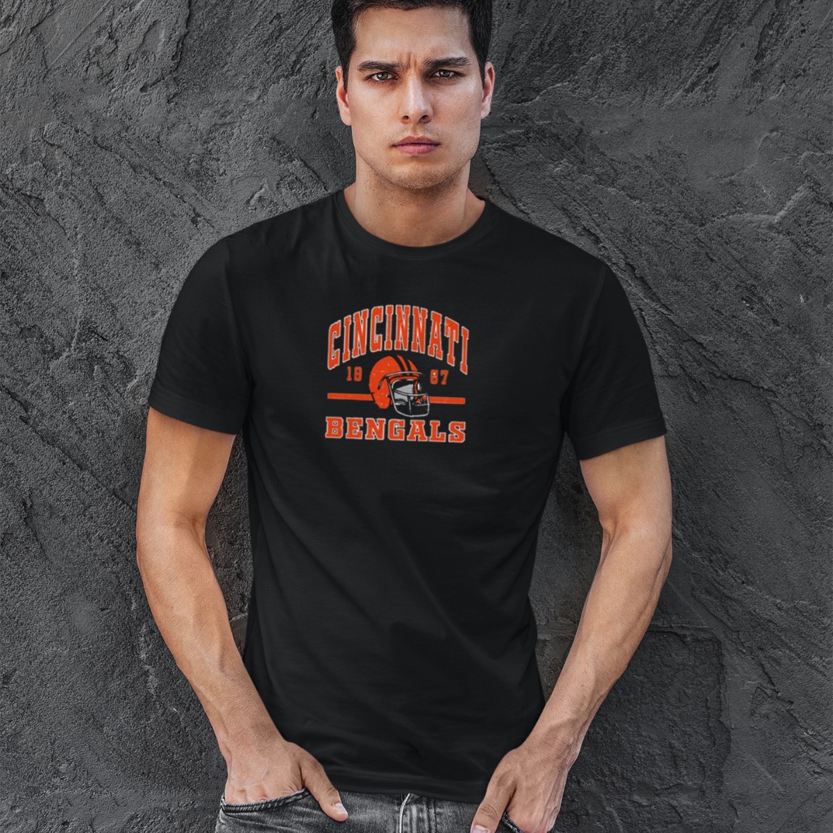 Show your love for the Cincinnati Bengals with our iconic 1967 Football Helmet T-Shirt! Perfect for die-hard fans and casual wearers alike, this shirt combines style and nostalgia, making it an ideal choice for game days, themed events, or just lounging around. With a fan-made design printed in the USA, this shirt captures the spirit of the team while offering comfort and durability for all-season wear.