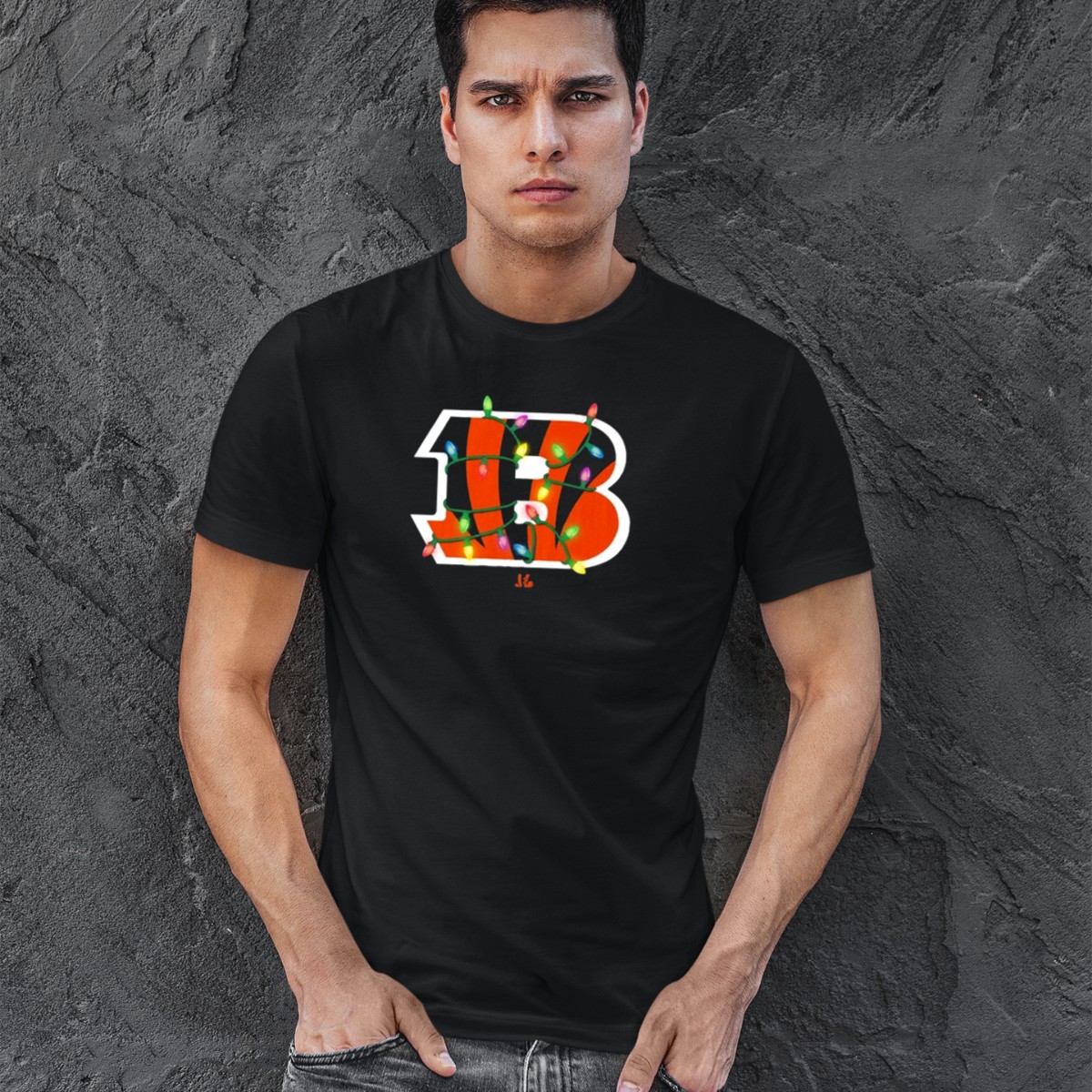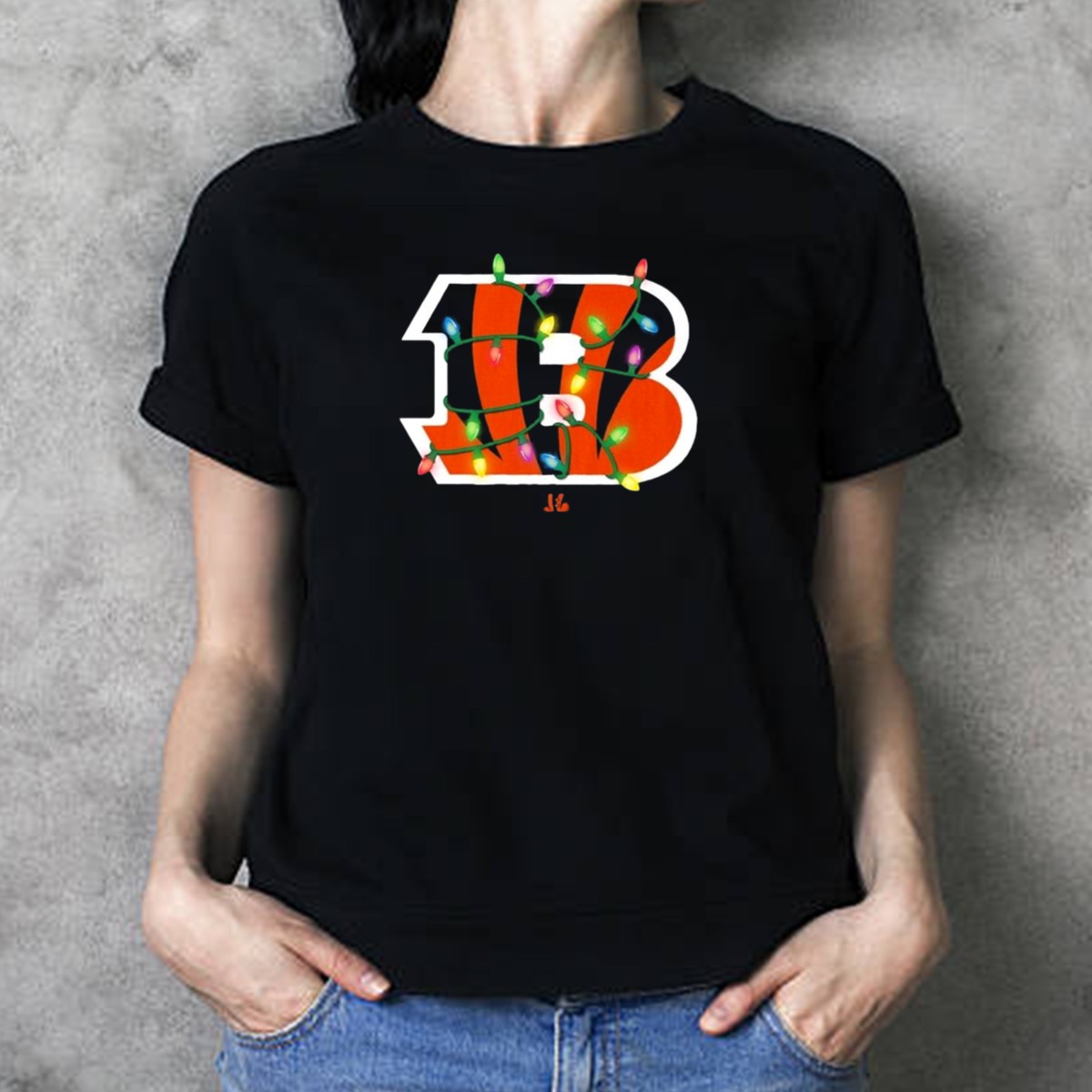 Show off your team spirit this holiday season with our Cincinnati Bengals B Logo T-Shirt adorned with festive holiday lights! Perfect for fans of all ages, this shirt is ideal for casual outings, game days, or themed events. Crafted with love and printed in the USA, it adds a unique touch to your wardrobe while celebrating your favorite team in style.