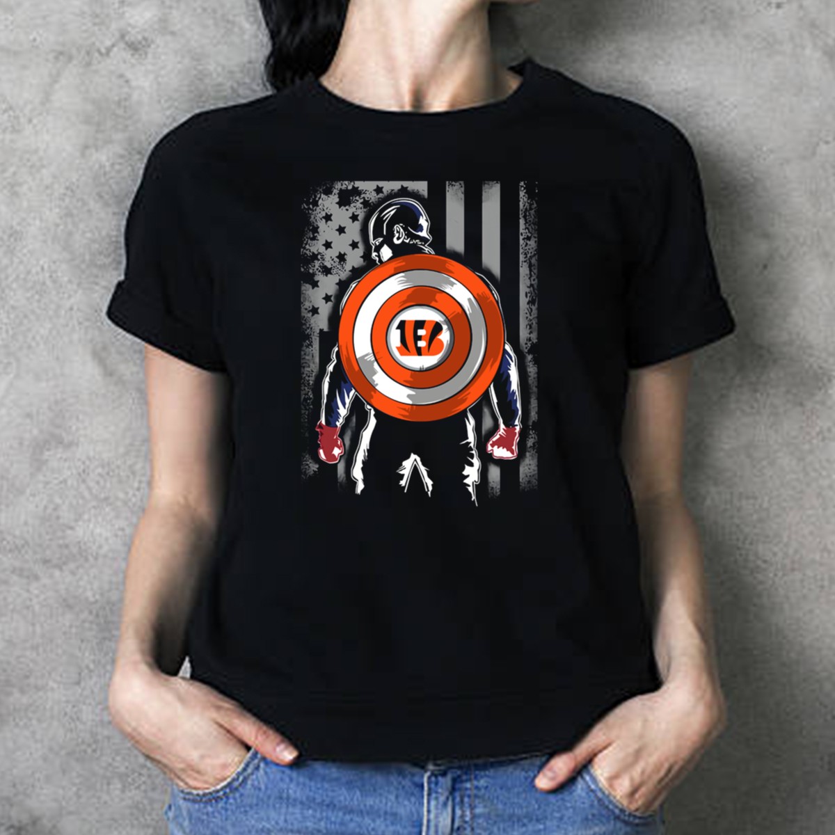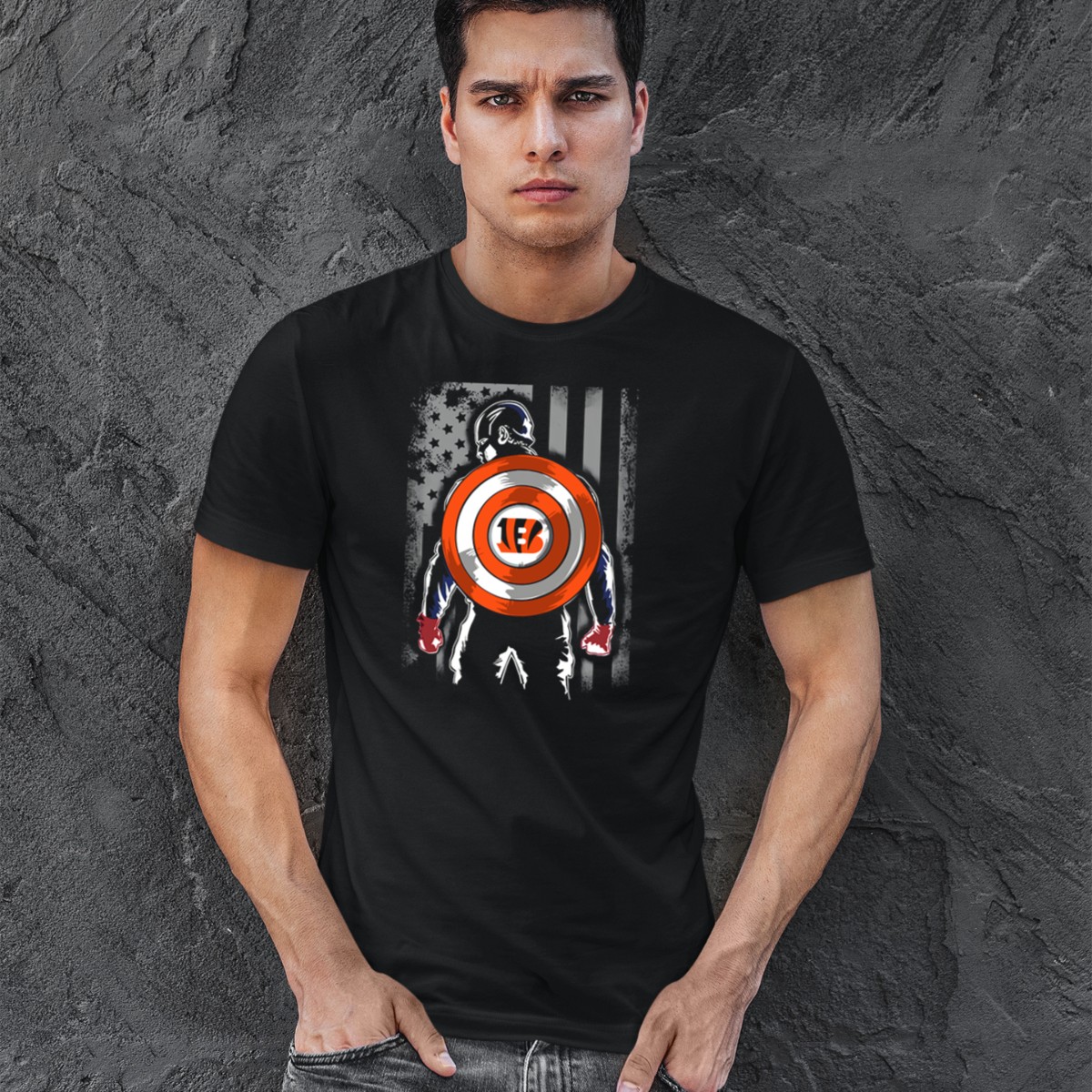 Show your pride for the Cincinnati Bengals with this unique Captain America Shield T-Shirt, perfect for fans who want to combine their love for football and superheroes. Made for casual wear, themed events, or daily outings, this t-shirt is designed for those who want to make a statement while enjoying comfort and style. With its eye-catching graphic printed in the USA, this shirt is not just a piece of clothing; it’s a badge of honor for every dedicated fan.