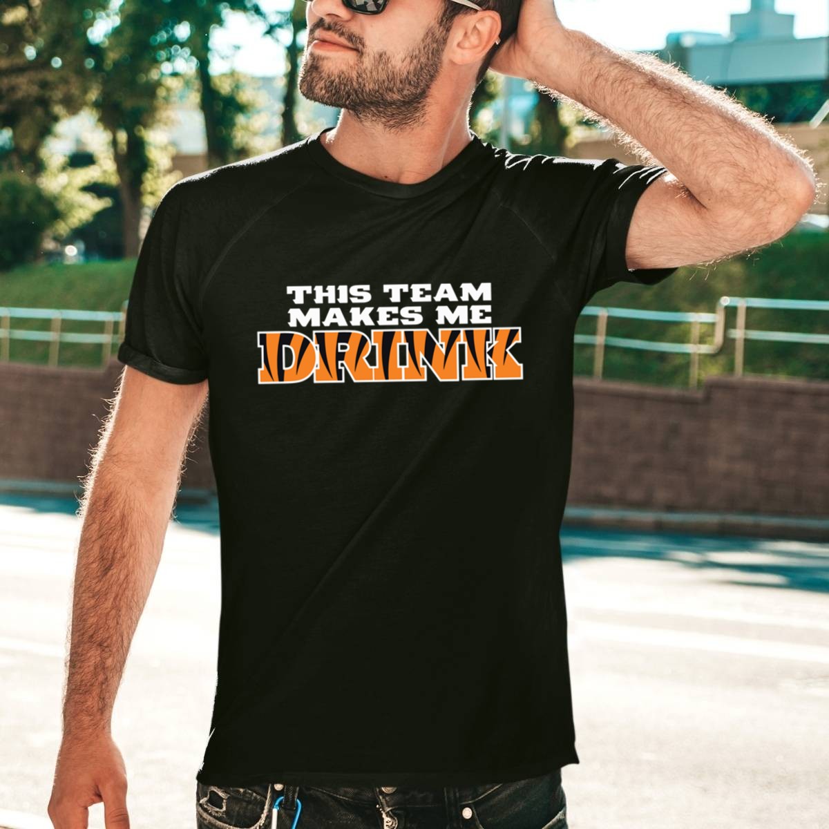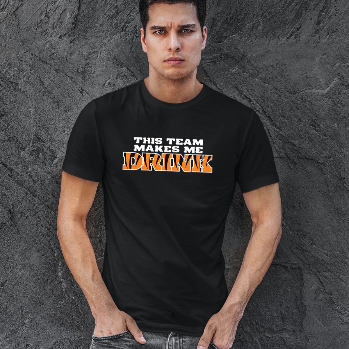 Show your love for the Cincinnati Bengals with this hilarious “This Team Makes Me Drink” T-shirt! Perfect for die-hard fans and anyone looking to add a touch of humor to their game day attire, this shirt is ideal for casual wear, themed events, or just lounging around. Made with a fan-made design and proudly printed in the USA, it combines comfort and style, making it a must-have for any Bengals supporter.