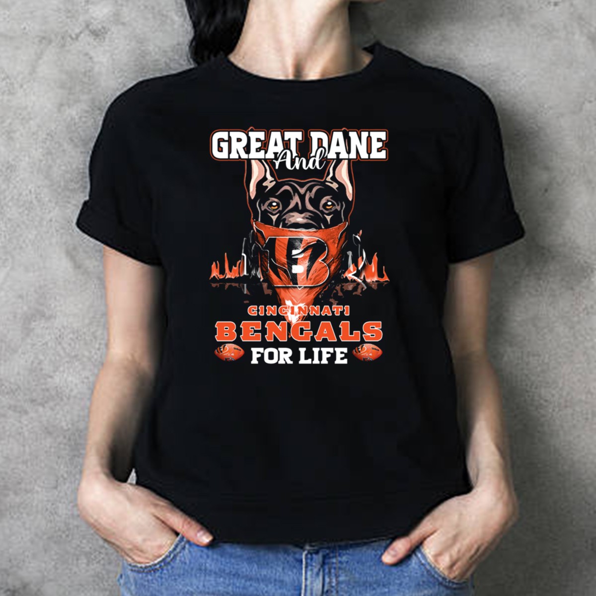Show your love for the Cincinnati Bengals and your furry friend with our Great Dane and For Life T-shirt! This fan-made design is perfect for dog lovers and Bengals fans alike, making it an ideal choice for casual outings, themed events, or simply lounging at home. With its comfortable fit and vibrant print, this shirt lets you showcase your team spirit and passion for your Great Dane all year round.