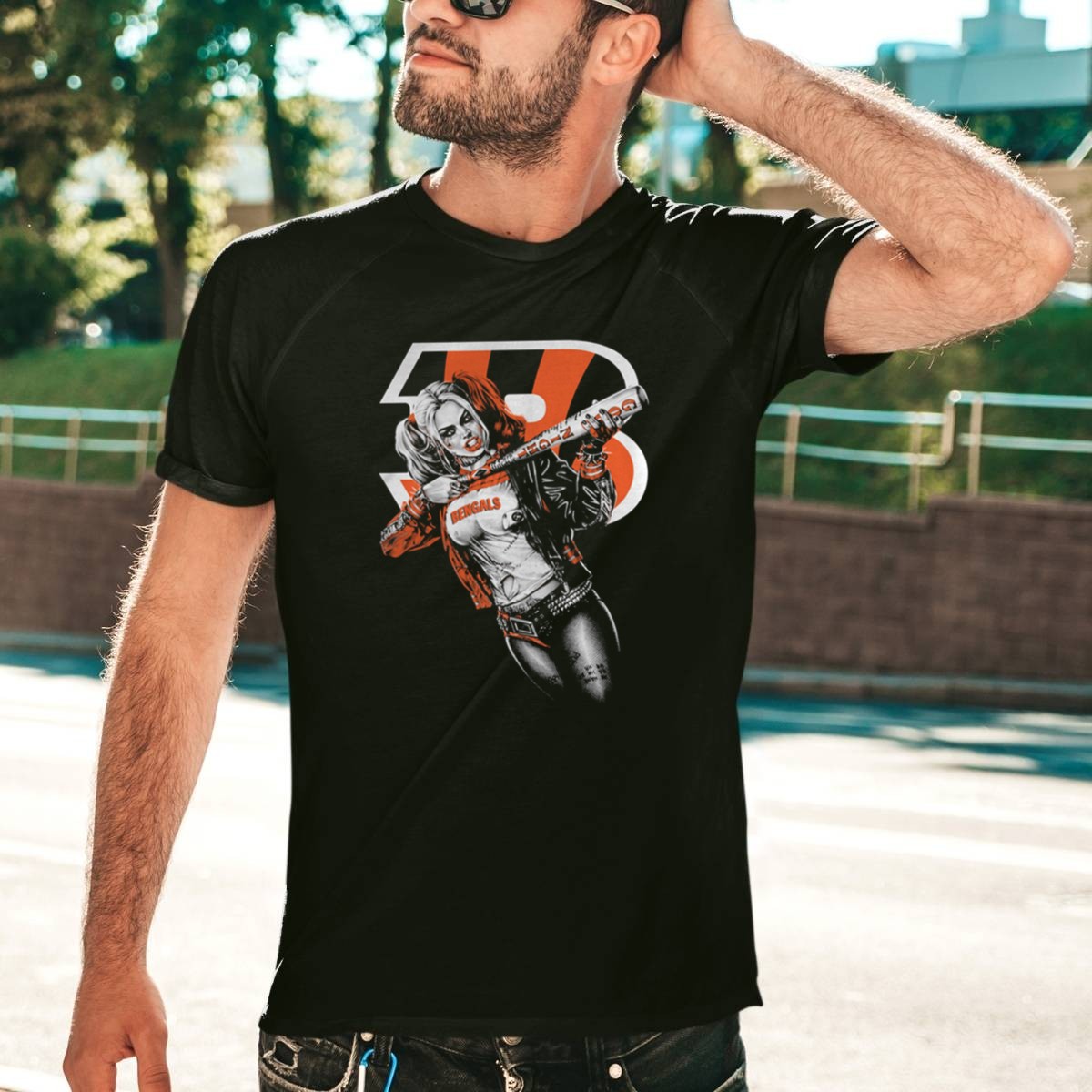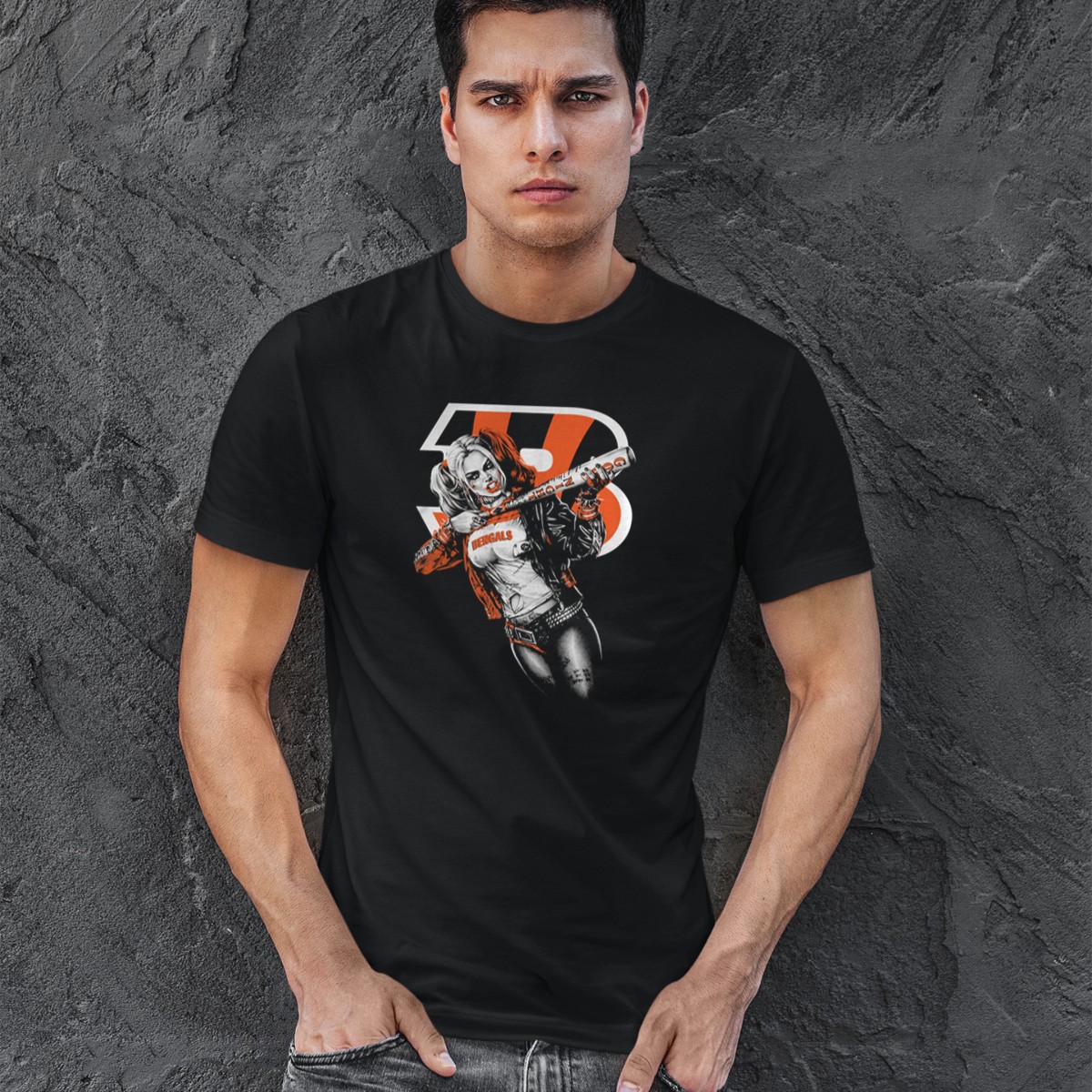 Show off your unique style and love for the Cincinnati Bengals with this fan-made Harley Quinn graphic T-shirt! Perfect for die-hard fans and casual wearers alike, this shirt combines quirky design with a classic fit, making it ideal for themed events, game days, or simply lounging around. With its high-quality print made in the USA, this T-shirt is not just a piece of clothing; it’s a statement of fandom and individuality.
