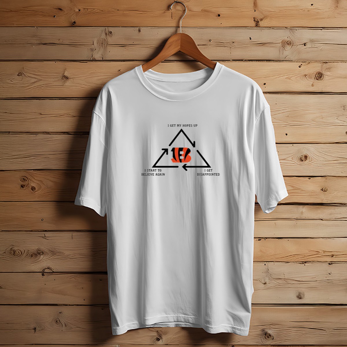 Show your unwavering support for the Cincinnati Bengals with our fan-made “I Get My Hopes Up, I Get Disappointed, I Start to Believe Again” graphic T-shirt. Perfect for die-hard fans who ride the emotional rollercoaster of each game, this shirt is ideal for casual wear, themed events, or just hanging out with friends. Made with a unique design printed in the USA, it captures the spirit of fandom with humor and style.