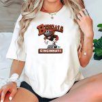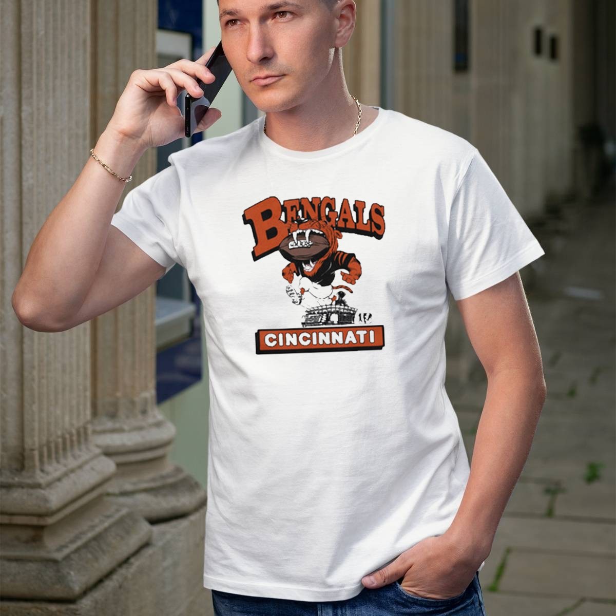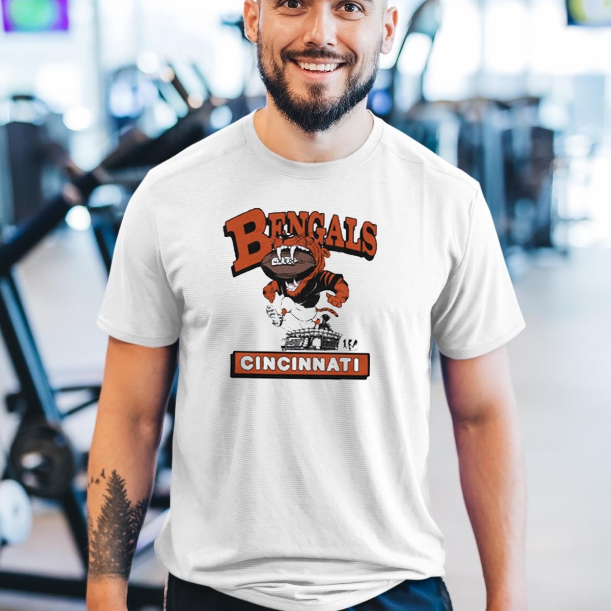 Show your unwavering support for the Cincinnati Bengals with this eye-catching T-shirt featuring the iconic mascot jumping over the stadium! Perfect for die-hard fans and casual wearers alike, this shirt is ideal for game days, themed events, or simply lounging around. Its unique design showcases your team spirit while providing comfort and style, making it a must-have addition to any Bengals fan’s wardrobe.