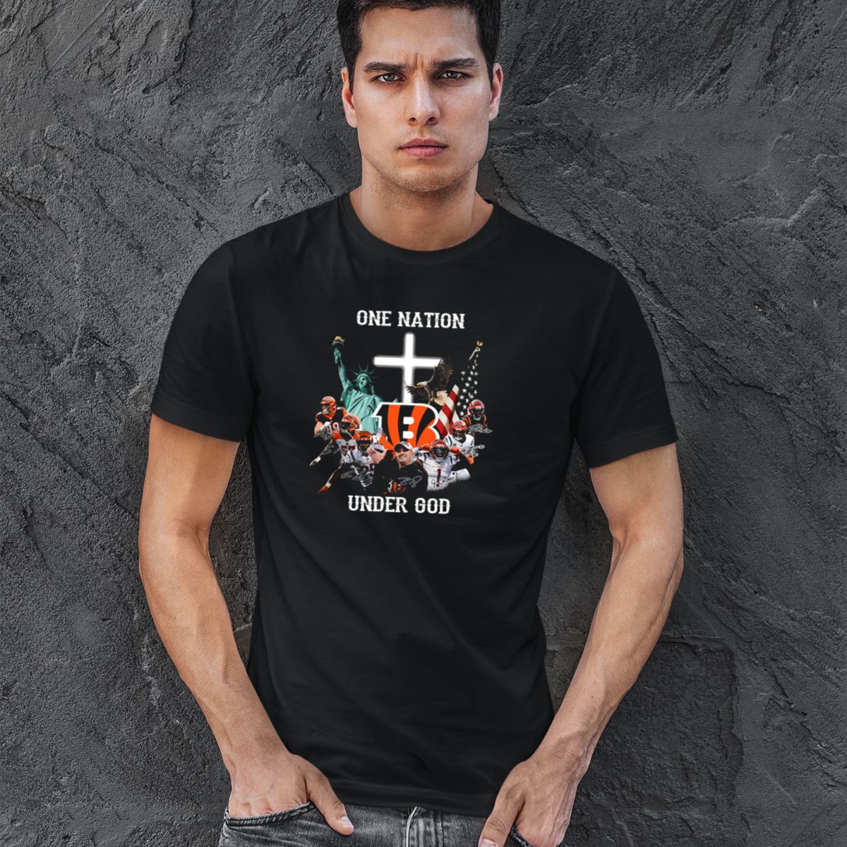 Show your unwavering support for the Cincinnati Bengals with our exclusive “One Nation Under God” T-shirt, featuring a striking design of the Statue of Liberty, American flag, and football players. This fan-made graphic tee is perfect for die-hard fans who want to showcase their team pride at casual gatherings, themed events, or everyday outings. Crafted for comfort and style, this shirt is a must-have addition to your game day wardrobe!