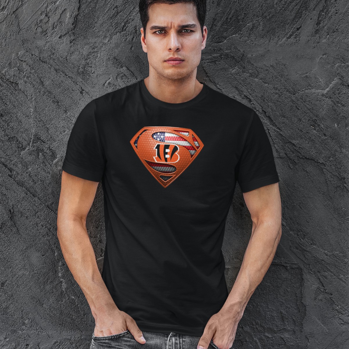 Show your team spirit with our Cincinnati Bengals Superman Shield American Flag T-Shirt! This fan-made design is perfect for die-hard Bengals fans who want to showcase their love for the team while celebrating their patriotic side. Ideal for casual outings, themed events, or daily wear, this unique shirt combines comfort and style, making it an essential addition to your wardrobe. Proudly printed in the USA, it’s not just a T-shirt; it’s a statement!