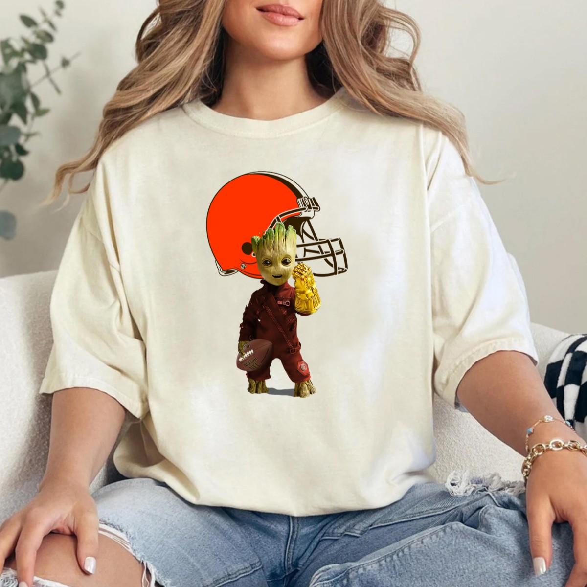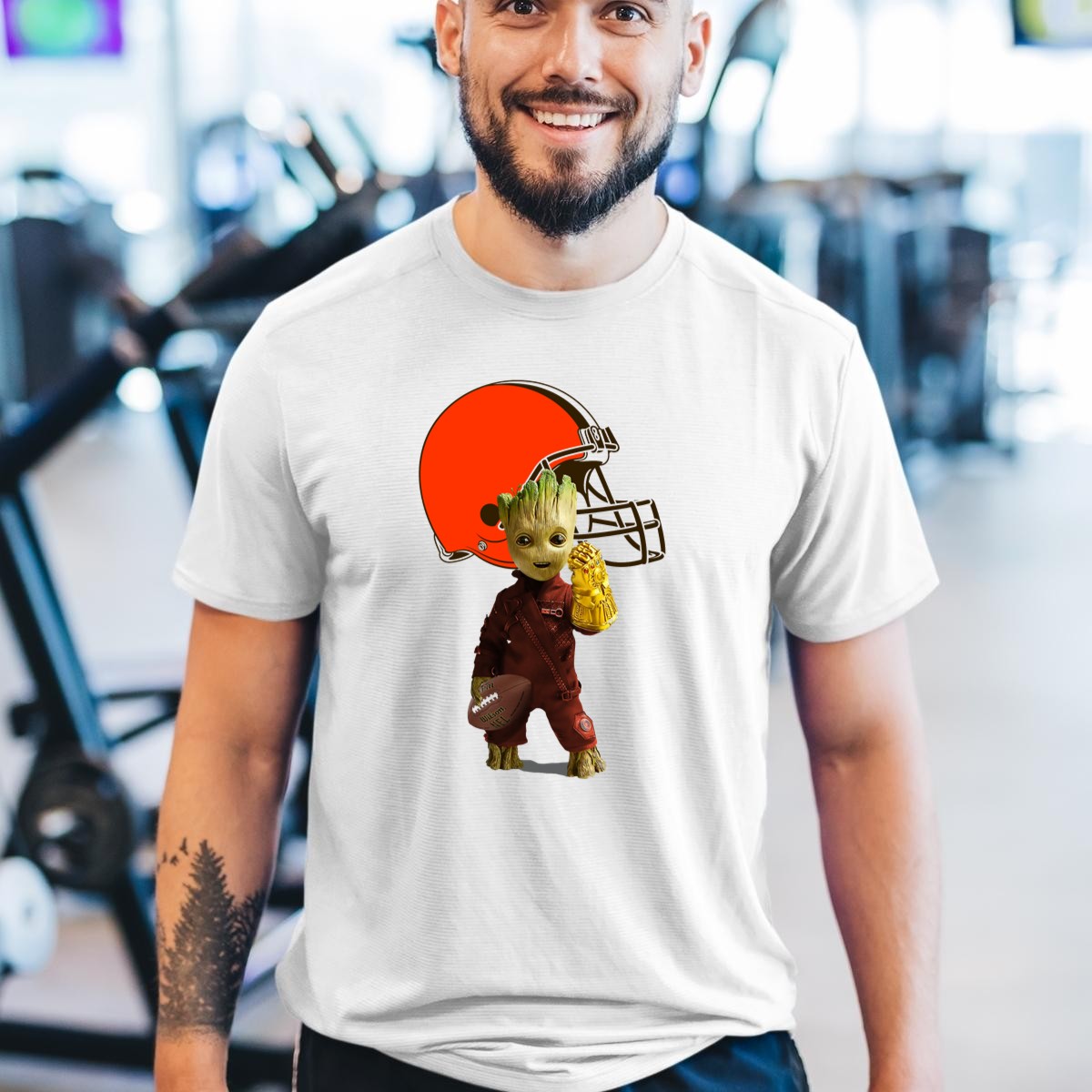 Show off your love for the Cleveland Browns with our fan-made Groot and Infinity Gauntlet T-shirt! This eye-catching graphic tee blends the excitement of football with a playful twist on pop culture, making it perfect for die-hard fans and casual wearers alike. Whether you’re cheering from the stands, hosting a themed event, or just enjoying a laid-back day, this classic fit T-shirt is sure to turn heads and spark conversations.