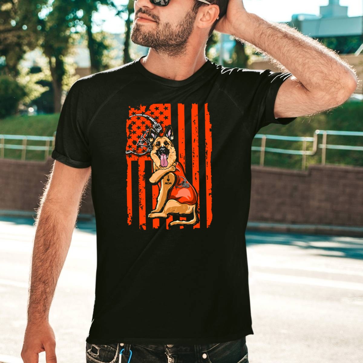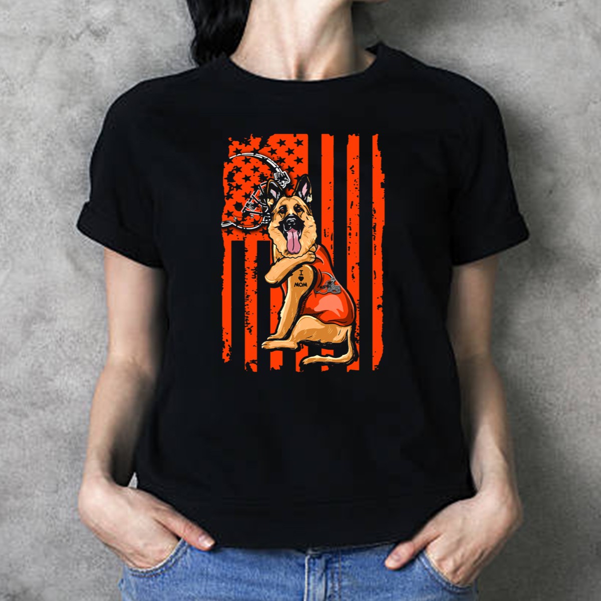 Show your love for the Cleveland Browns and your four-legged friend with this unique fan-made T-shirt featuring a German Shepherd dog alongside a football helmet, all set against an eye-catching orange flag background. Perfect for dog lovers and football fans alike, this shirt is ideal for casual outings, themed events, or simply showing off your team spirit on game day. Made for comfort and style, it’s a must-have addition to any sports enthusiast’s wardrobe.