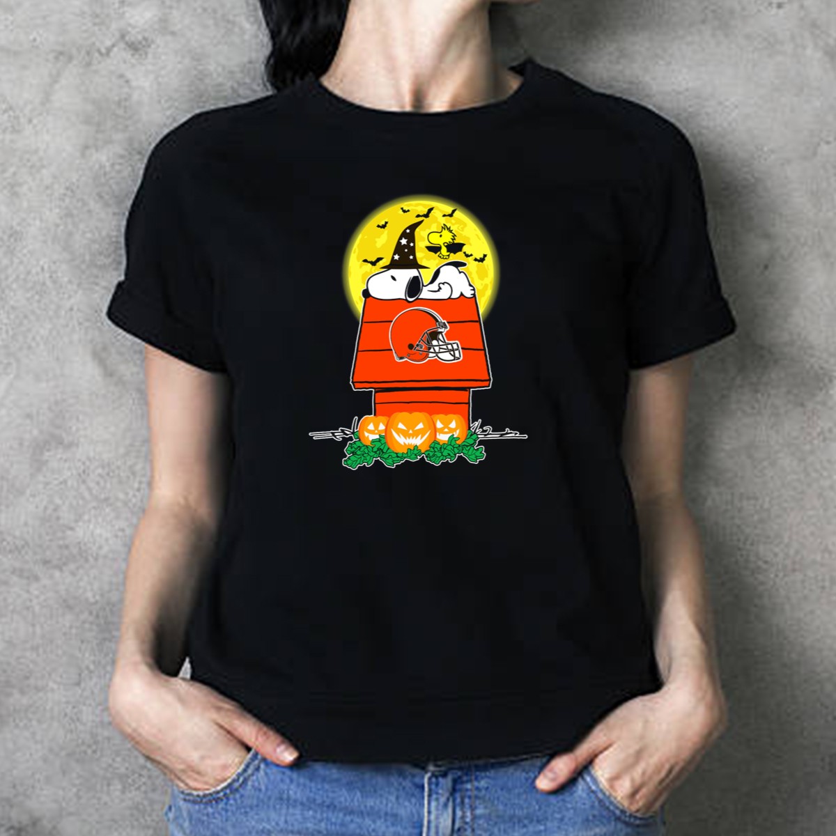Celebrate your love for the Cleveland Browns and Halloween with our unique graphic T-shirt featuring Snoopy and Woodstock surrounded by pumpkins and a spooky moonlit backdrop. Perfect for fans of all ages, this tee is ideal for casual outings, themed events, or simply showing off your team spirit during the fall season. Made with care in the USA, this fan-made design combines comfort and style, making it a must-have addition to your wardrobe.