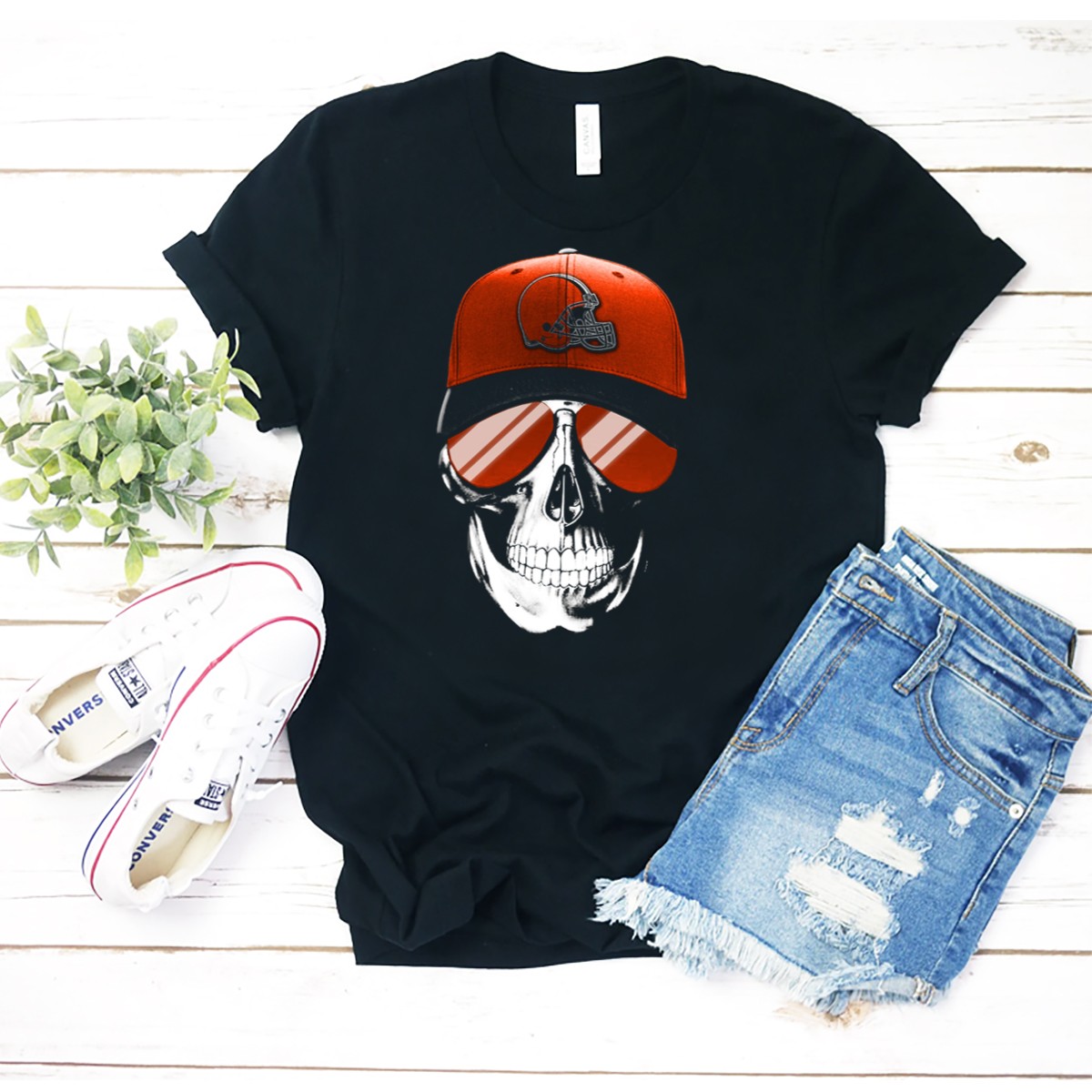Show your unwavering support for the Cleveland Browns with our fan-made graphic T-shirt featuring a bold skull design wearing a football helmet and sunglasses. Perfect for die-hard fans, this shirt is ideal for casual outings, themed events, or simply lounging at home while cheering on your team. Made with quality materials and printed in the USA, this unique design combines style and spirit, making it a must-have for any Browns enthusiast.