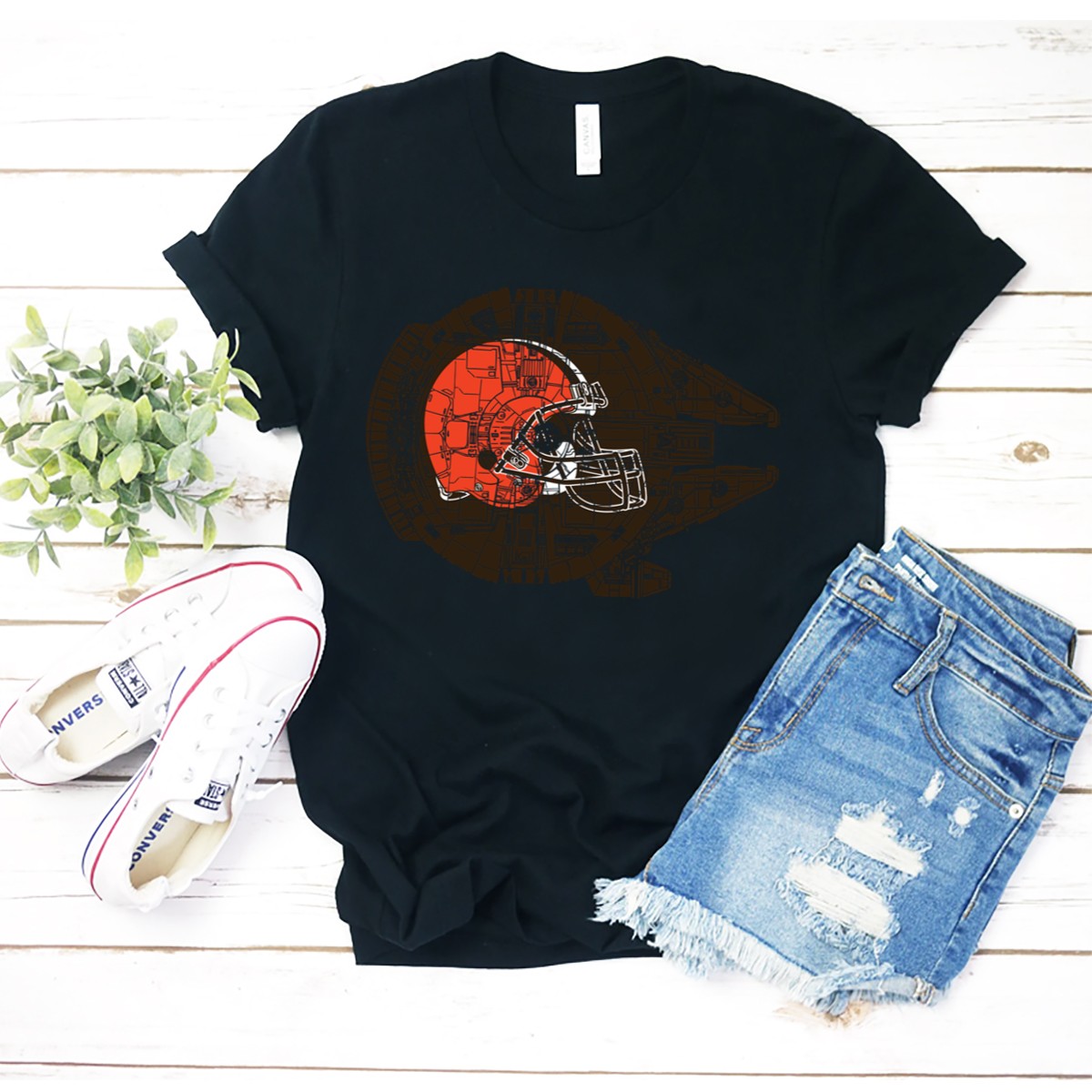 Show off your love for the Cleveland Browns and the iconic Millennium Falcon with this unique fan-made T-shirt! Perfect for die-hard fans and casual wearers alike, this shirt seamlessly blends sports enthusiasm with a touch of sci-fi adventure. Ideal for game days, themed events, or just lounging around, it’s a standout piece that celebrates both your team spirit and your love for the galaxy far, far away. Printed in the USA, it’s not just a shirt; it’s a statement!