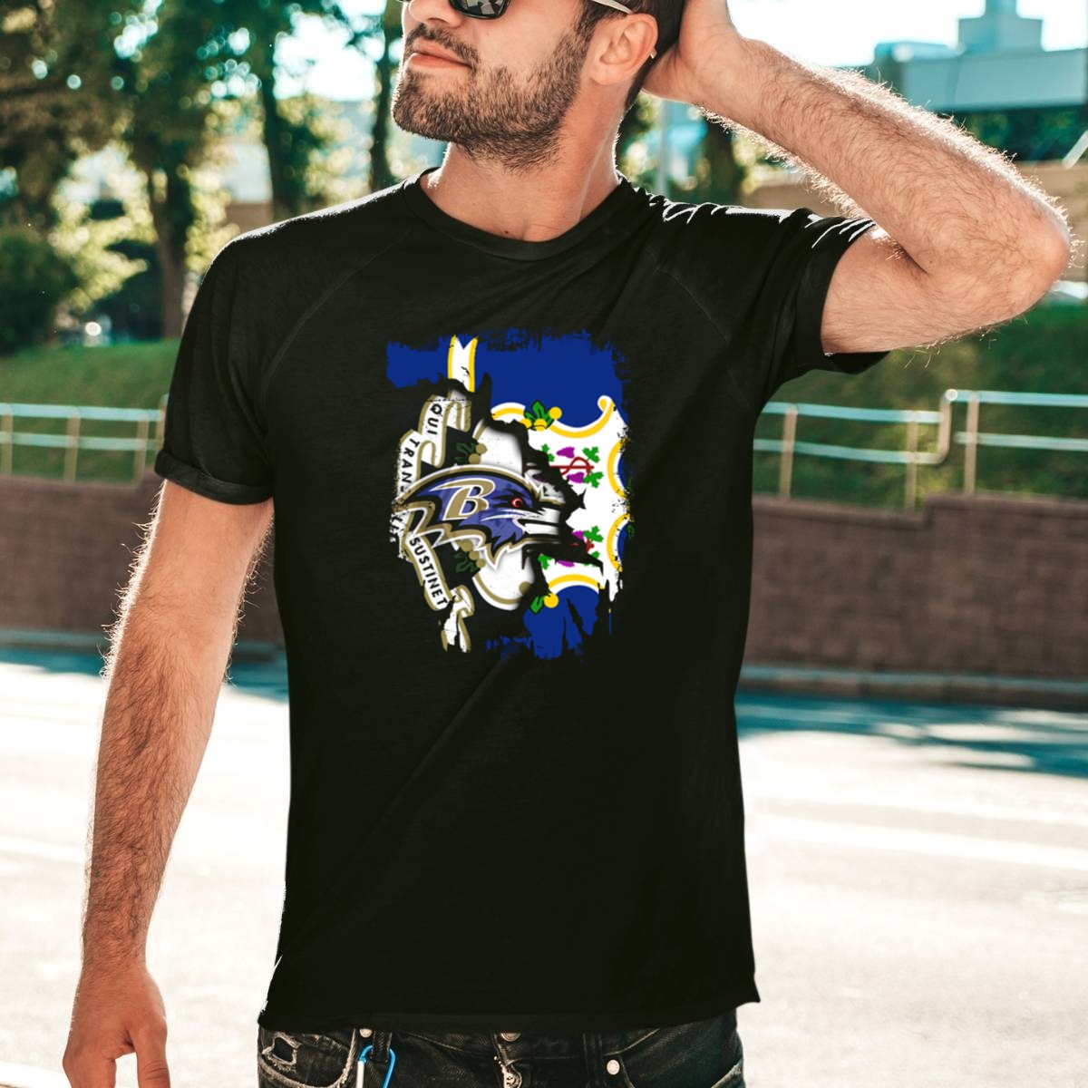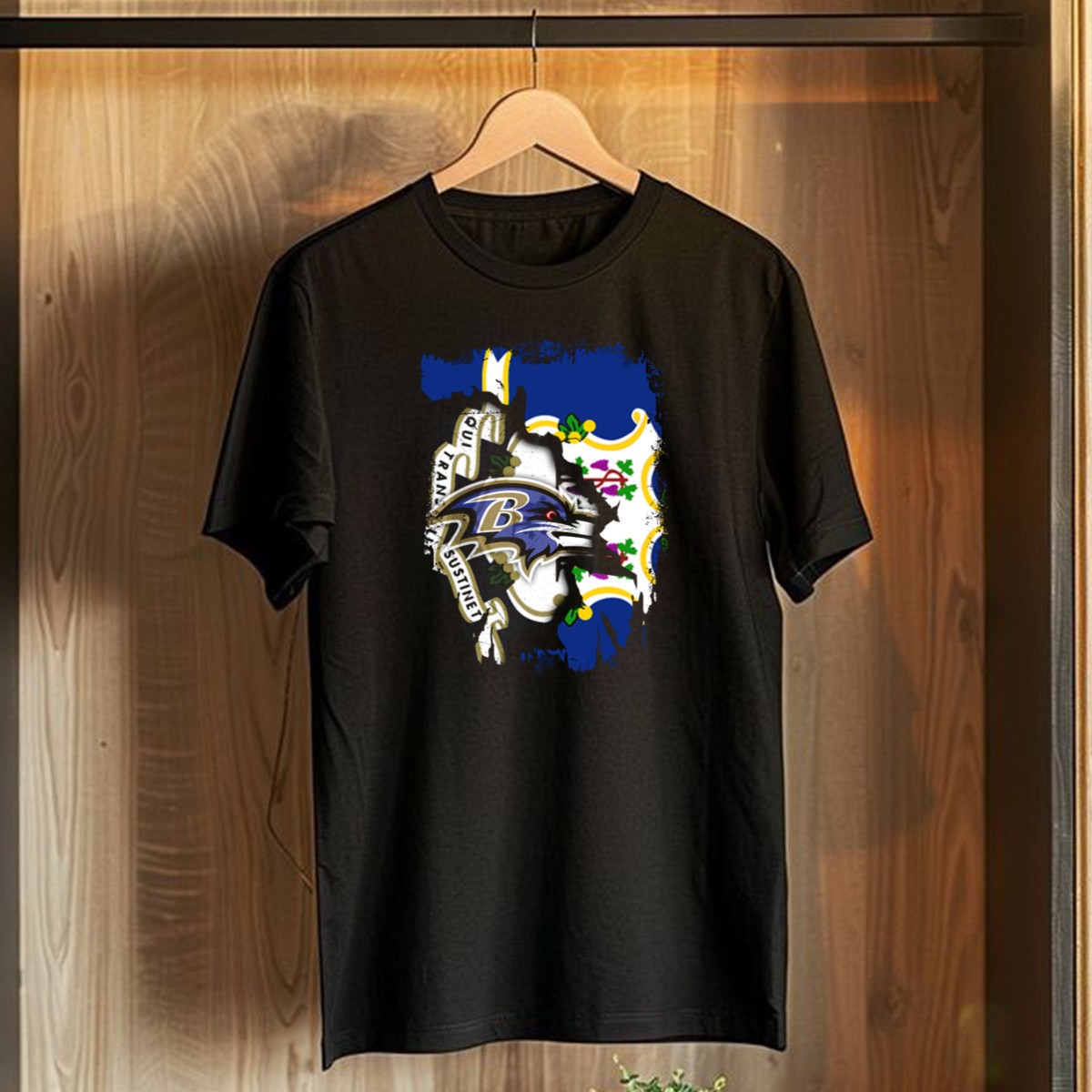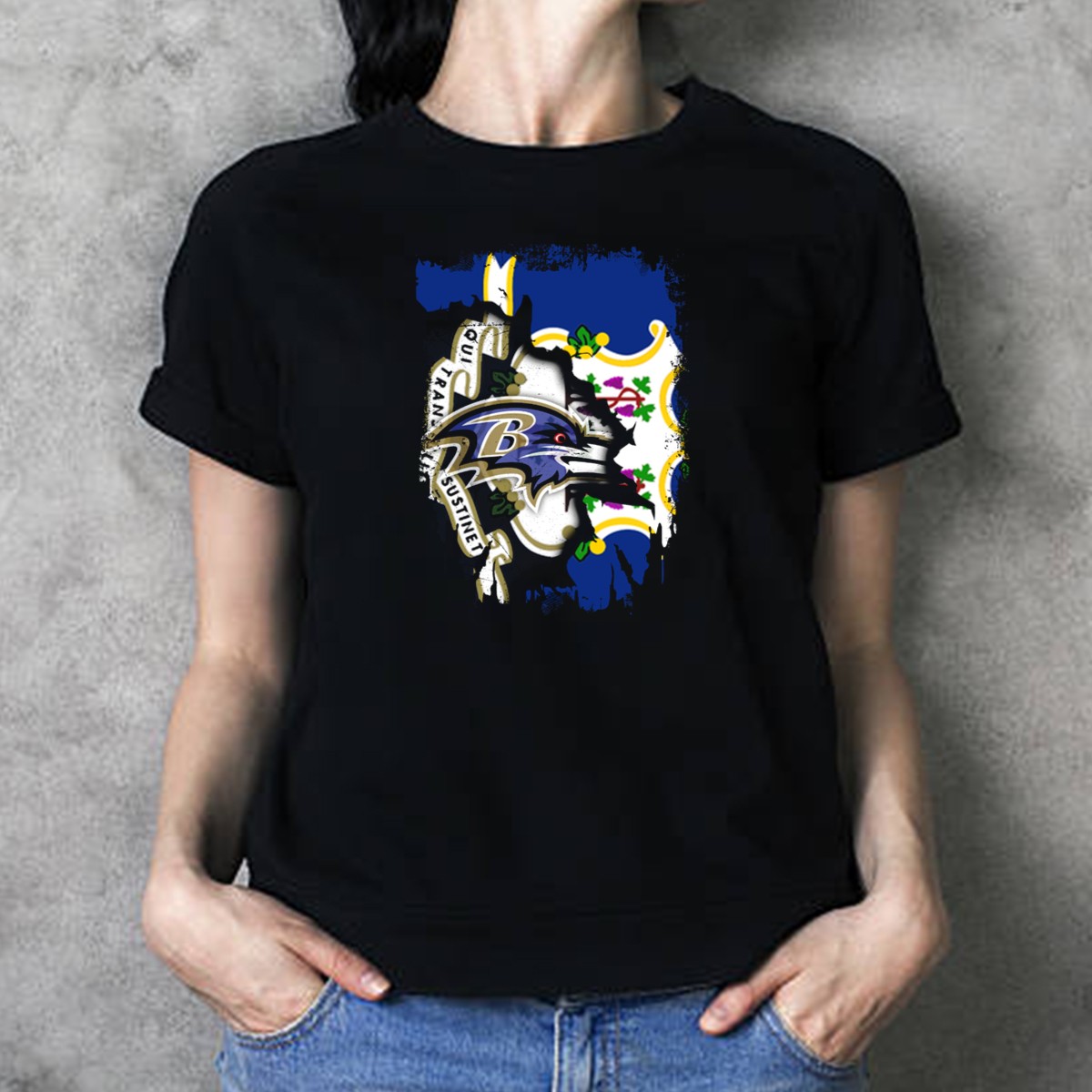 Show your pride for the Constitution State and your love for the Baltimore Ravens with our Connecticut State Flag and Baltimore Ravens Logo Fusion T-Shirt! This unique fan-made design is perfect for passionate sports enthusiasts and anyone looking to celebrate their roots. Whether you’re heading to a game, a casual outing, or a themed event, this shirt combines comfort and style, making it a must-have addition to your wardrobe.