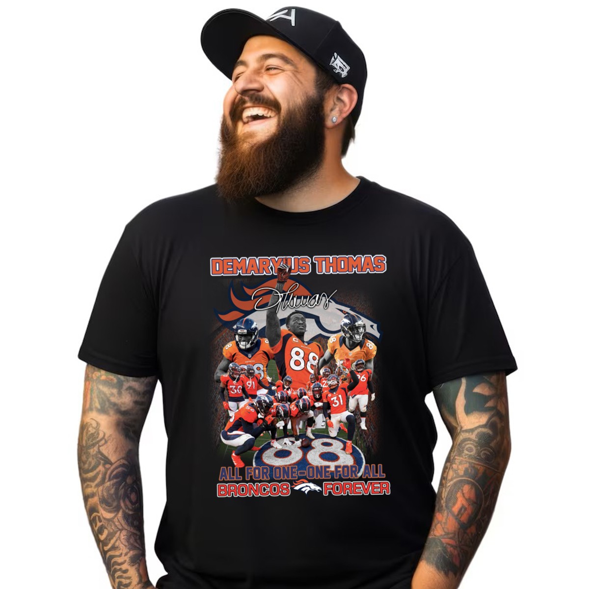 Celebrate the spirit of teamwork and dedication with the Demaryius Thomas Denver Broncos “All For One One For All” T-shirt. Perfect for die-hard Broncos fans and supporters, this shirt embodies the camaraderie and passion of the game. Whether you’re at a tailgate, watching the game with friends, or simply enjoying a casual day out, this fan-made design, printed in the USA, will make you stand out while showcasing your unwavering support for your favorite team.