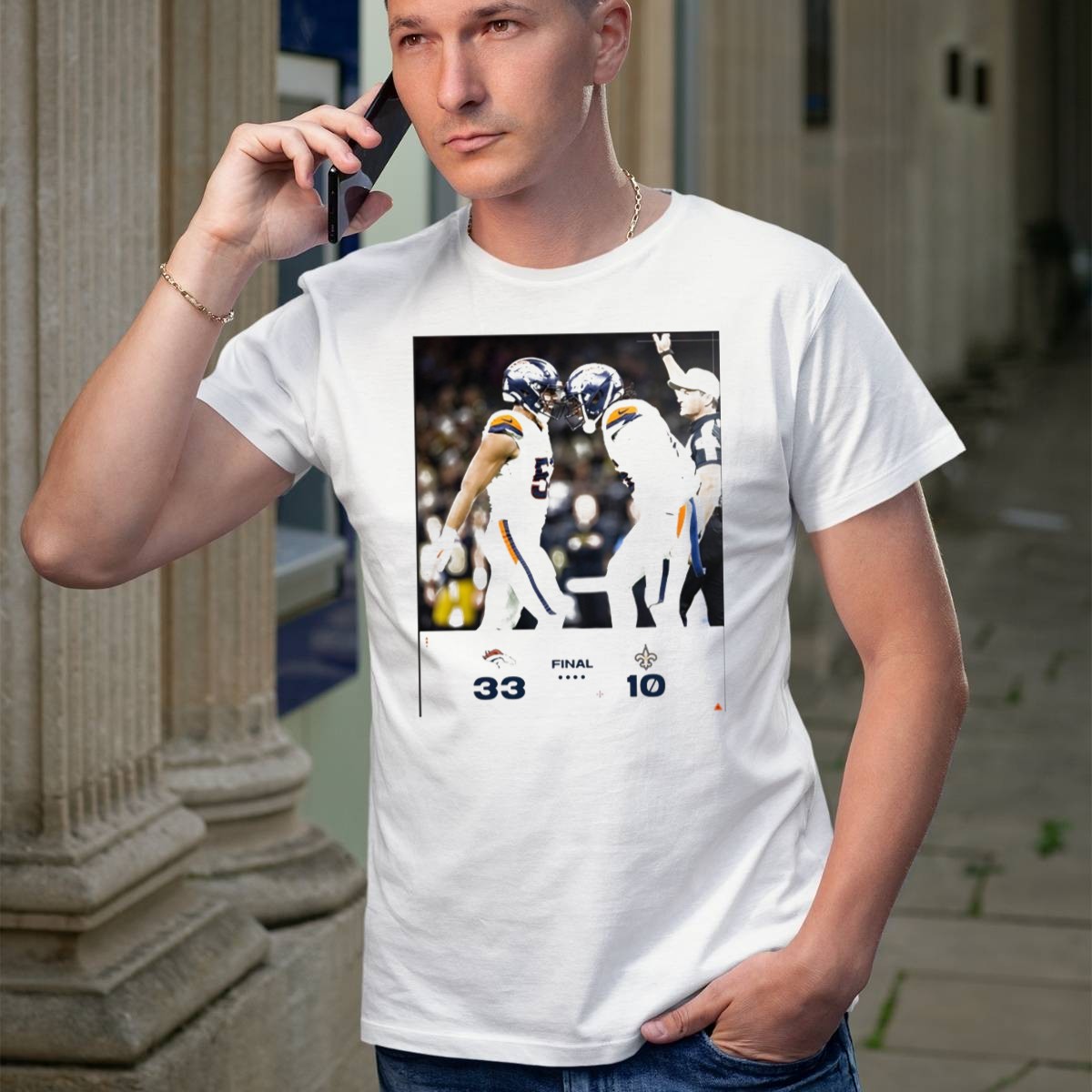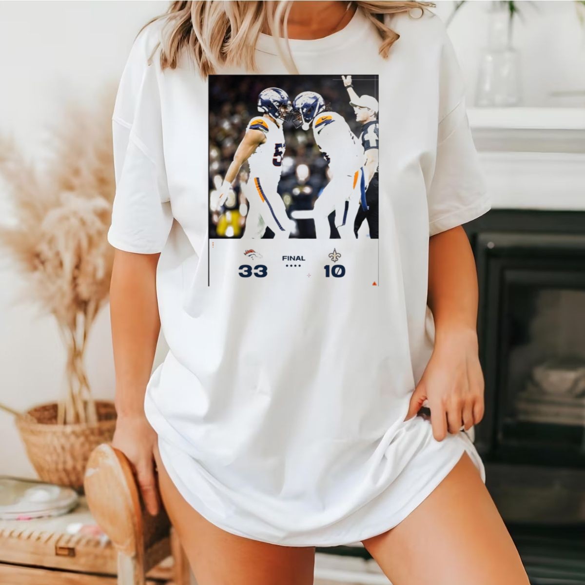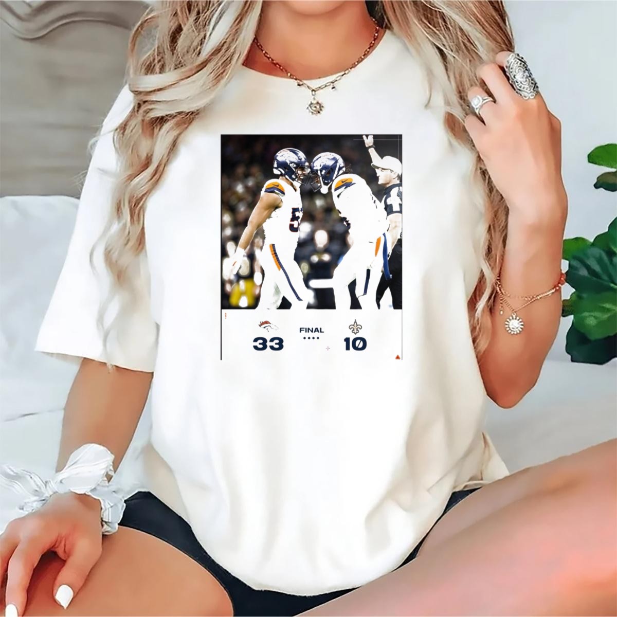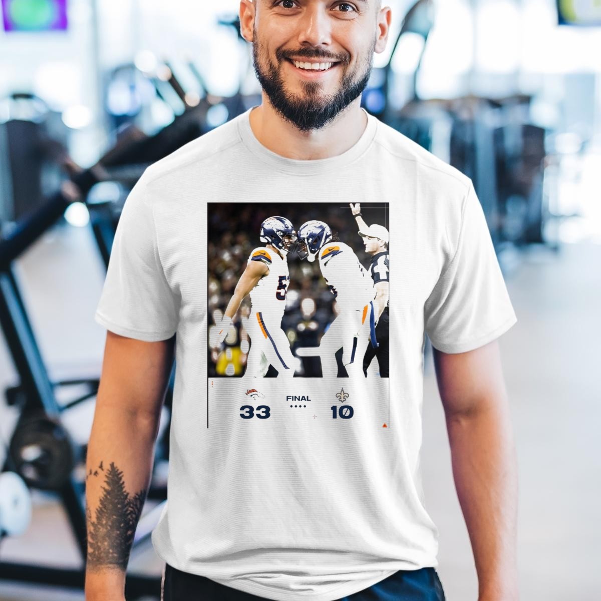 Show your unwavering support for the Denver Broncos with this fan-made graphic T-shirt, featuring the epic final score of 33 to 10 against the New Orleans Saints. Perfect for die-hard fans, this shirt is ideal for casual outings, game days, or themed events where you want to represent your team in style. Made from 100% cotton, it offers a soft and breathable feel, ensuring comfort whether you’re cheering from the stands or hanging out with friends.