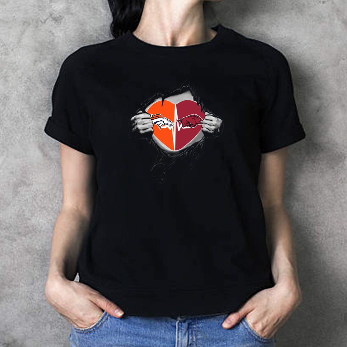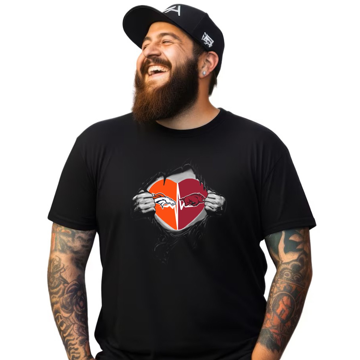 Show your love for both the Denver Broncos and Arkansas Razorbacks with our Heart Logo Fusion T-Shirt. This fan-made design is perfect for sports enthusiasts who appreciate the thrill of game day or casual outings. Made for all occasions, whether you’re cheering from the stands or enjoying a laid-back weekend, this shirt combines comfort and style effortlessly. Proudly printed in the USA, it’s a must-have for any dedicated fan!