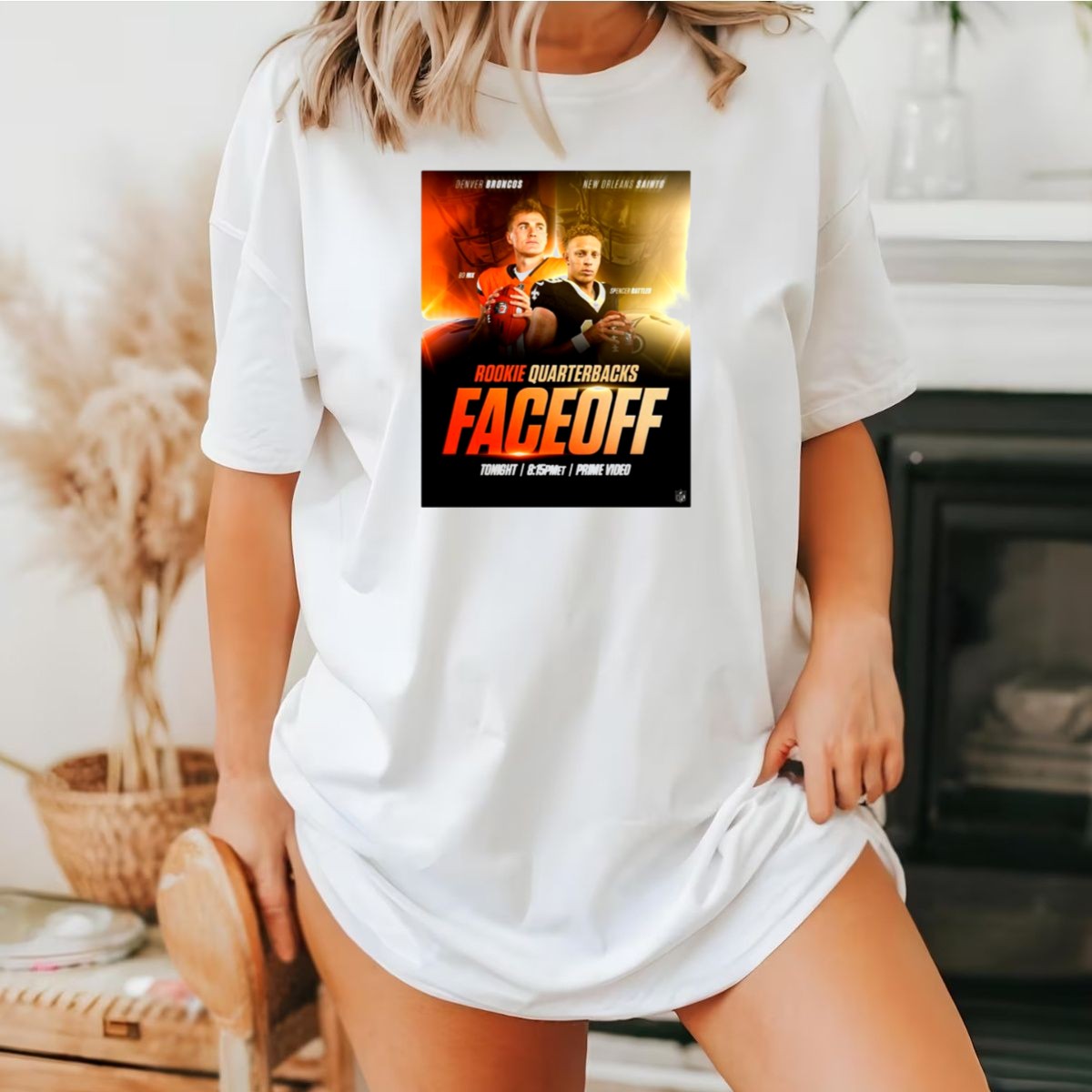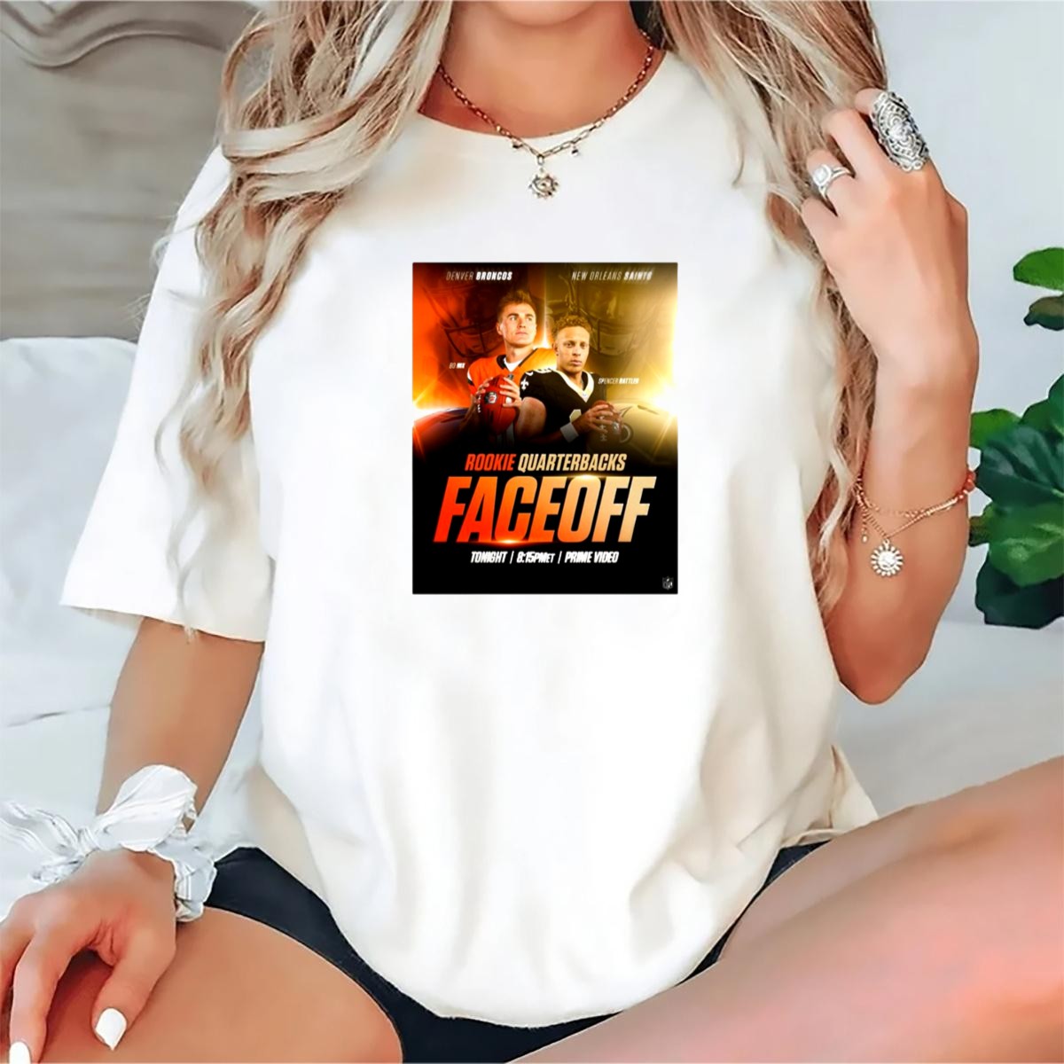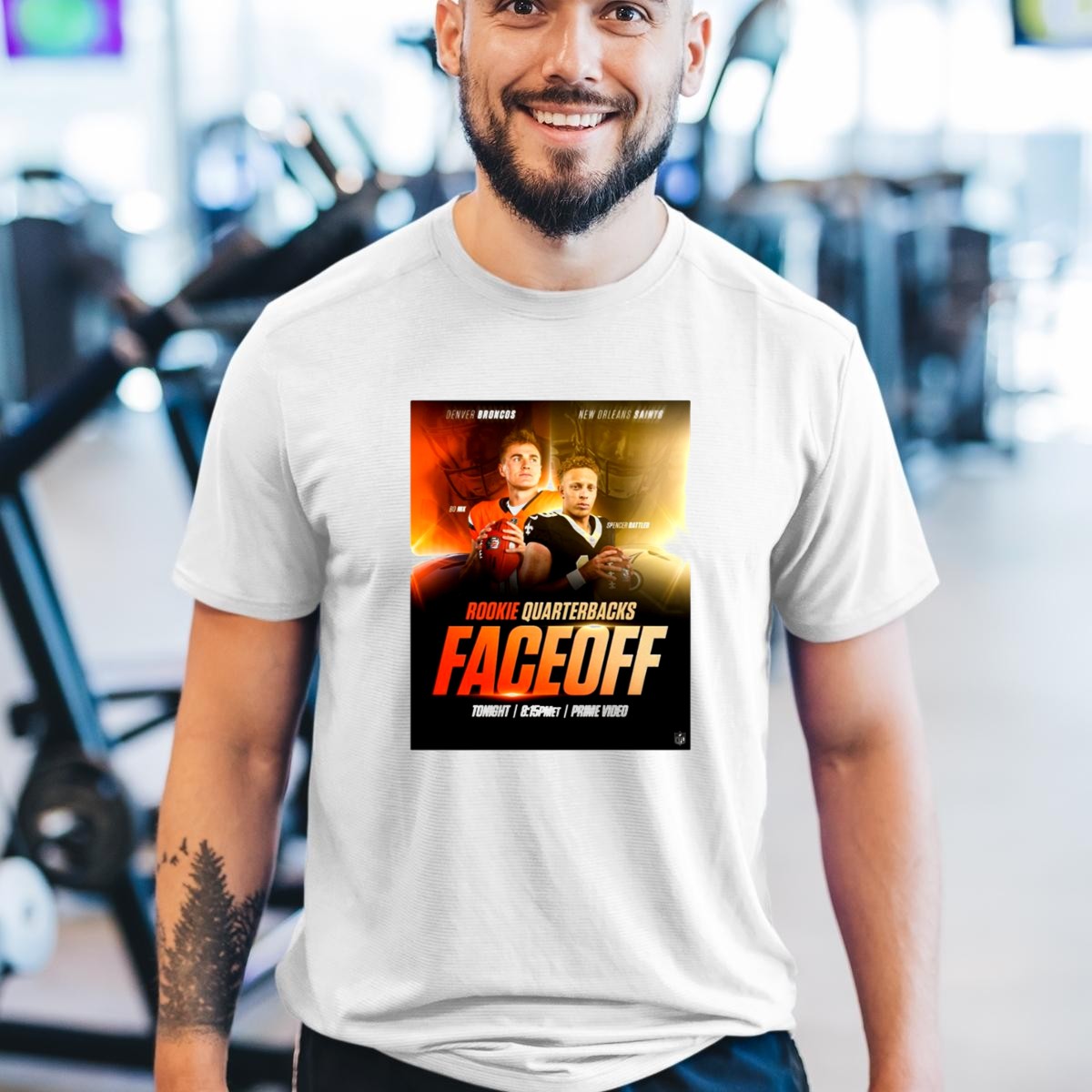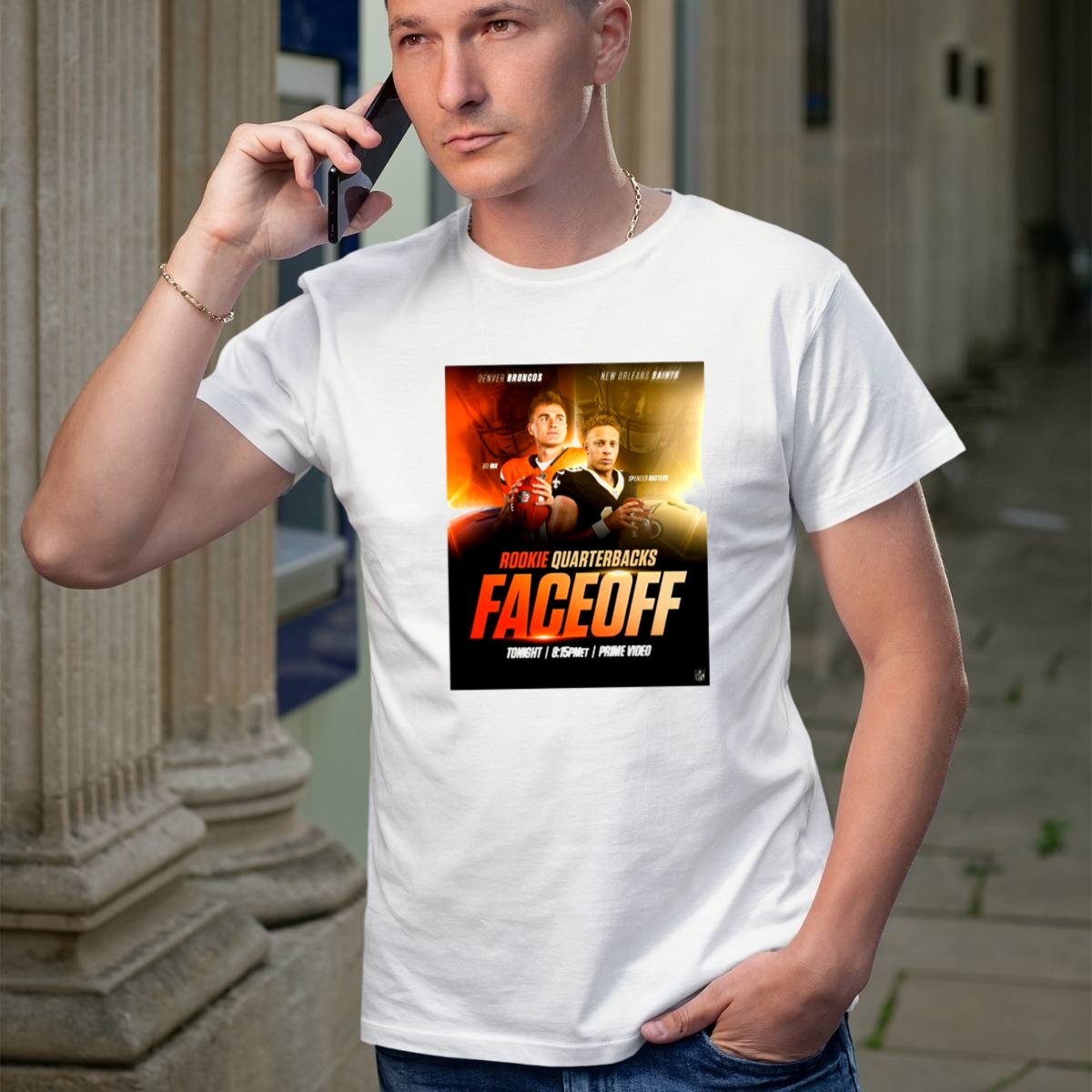 Show your support for the ultimate faceoff between rookie quarterbacks Bo Nix and Spencer Rattler with this exclusive fan-made graphic T-shirt. Perfect for die-hard Denver Broncos and New Orleans Saints fans, this shirt is designed for casual wear, whether you’re watching the game from home or attending a themed event. Made in the USA, this unique design captures the excitement of the match-up and lets you wear your fandom with pride.