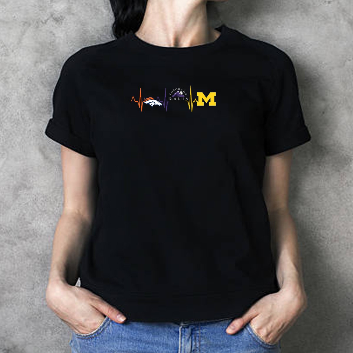 Show your spirit with our Denver Broncos Colorado Rockies Michigan Wolverines Heartbeat T-Shirt! Perfect for fans who bleed their team’s colors, this shirt combines passion with comfort, making it an ideal choice for casual outings, themed events, or just daily wear. Crafted with a unique fan-made design printed right here in the USA, this tee will keep you stylish and connected to your favorite teams all season long.