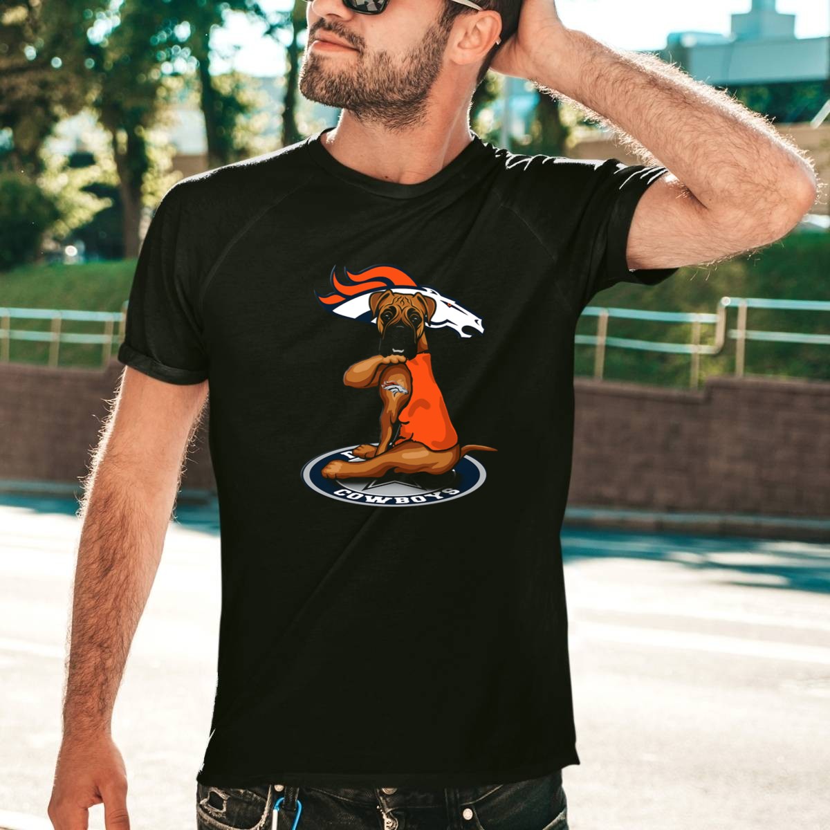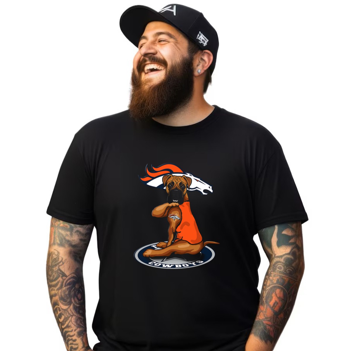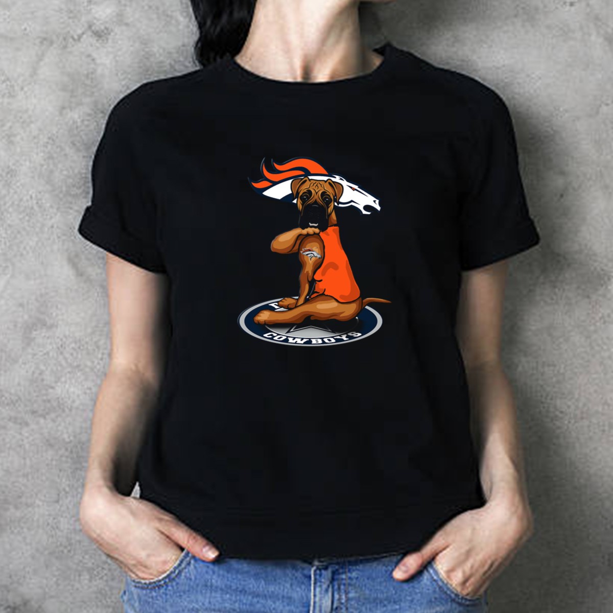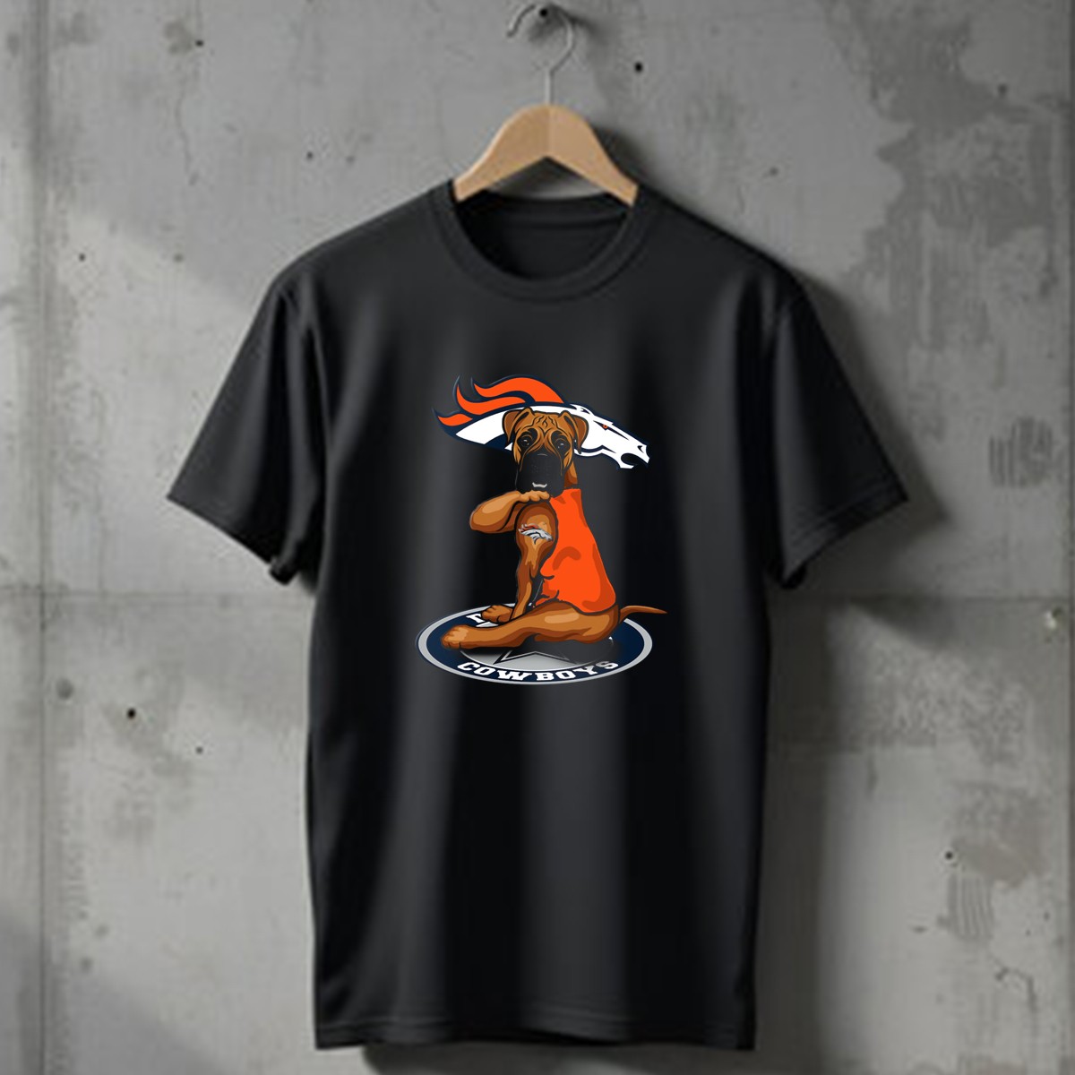 Celebrate your love for football with our Denver Broncos Dog Sitting On Dallas Cowboys T-Shirt! This fan-made design is perfect for die-hard Denver Broncos enthusiasts who enjoy showing off their team spirit in a fun and unique way. Ideal for casual outings, themed events, or just lounging at home, this shirt combines comfort with a playful twist, making it a must-have for any football fan’s wardrobe.