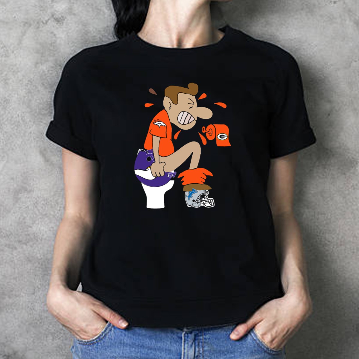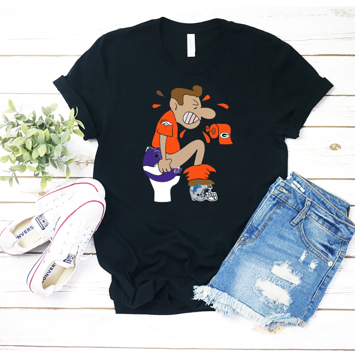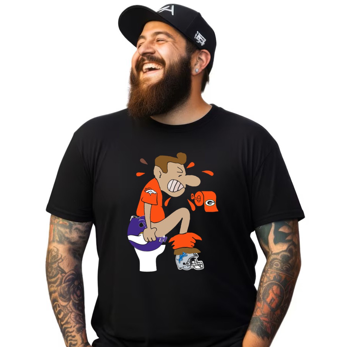 Show off your love for football and a good laugh with our Denver Broncos Fan Toilet Humor T-Shirt! This unique design brings together iconic logos from the Detroit Lions, Green Bay Packers, and Minnesota Vikings, making it the perfect conversation starter at any game day gathering or casual outing. Crafted for comfort and style, this shirt is ideal for die-hard fans and anyone who appreciates a clever twist on team spirit. Whether you’re tailgating, watching from home, or attending a themed event, this tee ensures you stand out while keeping it lighthearted.