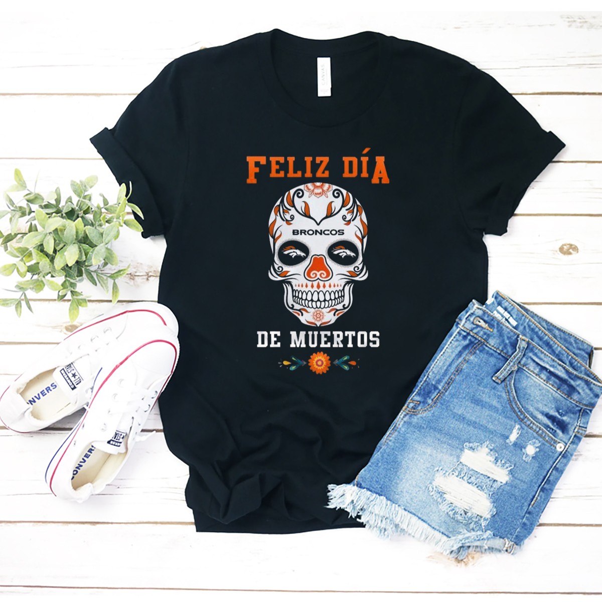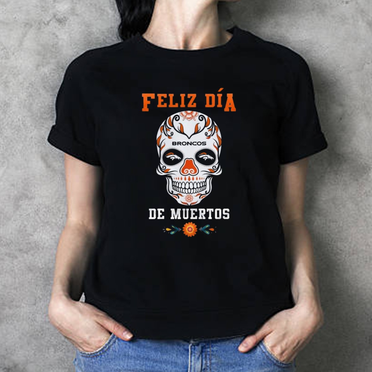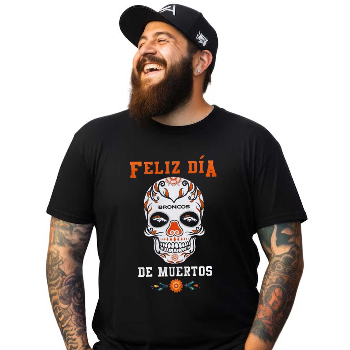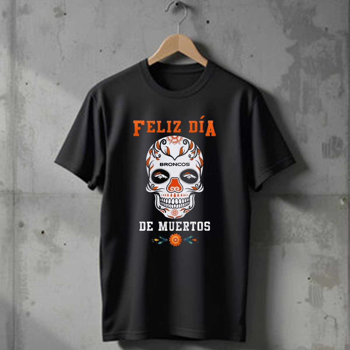 Celebrate your passion for the Denver Broncos with our Feliz Dia De Los Muertos Skull T-Shirt! This unique fan-made design combines the vibrant spirit of the Day of the Dead with your love for football, making it perfect for casual outings, themed events, or daily wear. Crafted from soft and breathable cotton, this shirt ensures you stay comfortable while showcasing your team pride in a distinct and festive way.