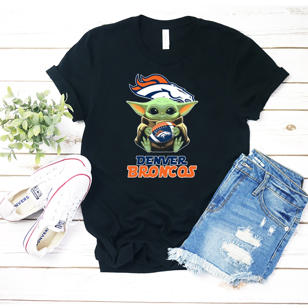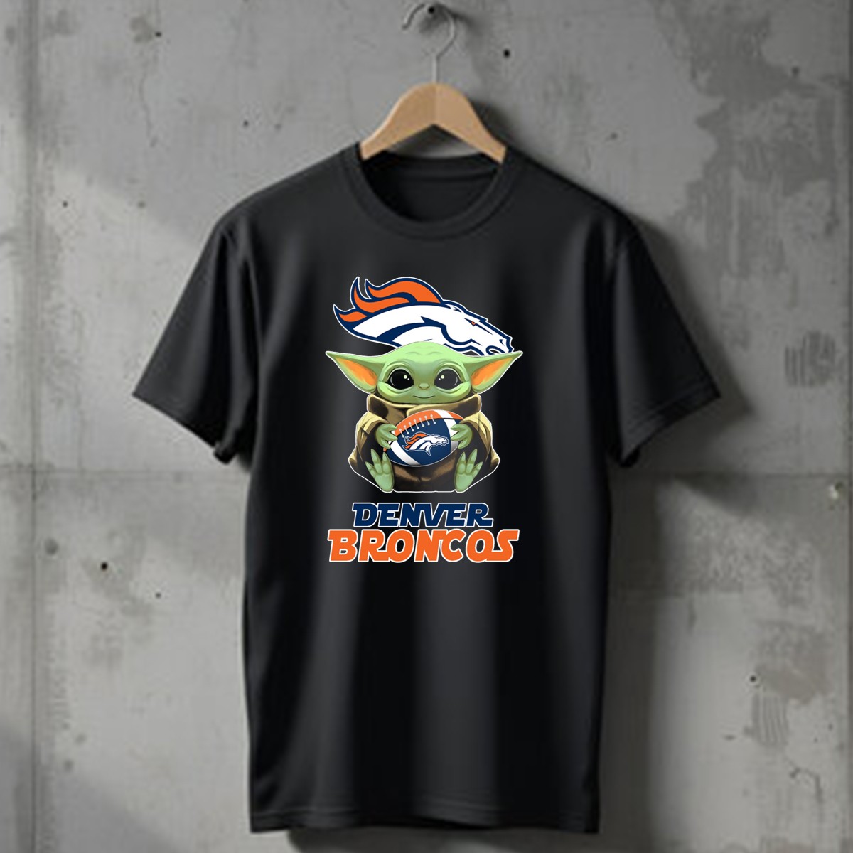 Show your love for both the Denver Broncos and the galaxy far, far away with this unique fan-made T-shirt featuring Grogu holding a football! Perfect for die-hard fans and casual wear enthusiasts alike, this shirt is your go-to choice for game days, themed events, or just lounging at home. Crafted for comfort and style, it’s sure to turn heads and spark conversations wherever you go.