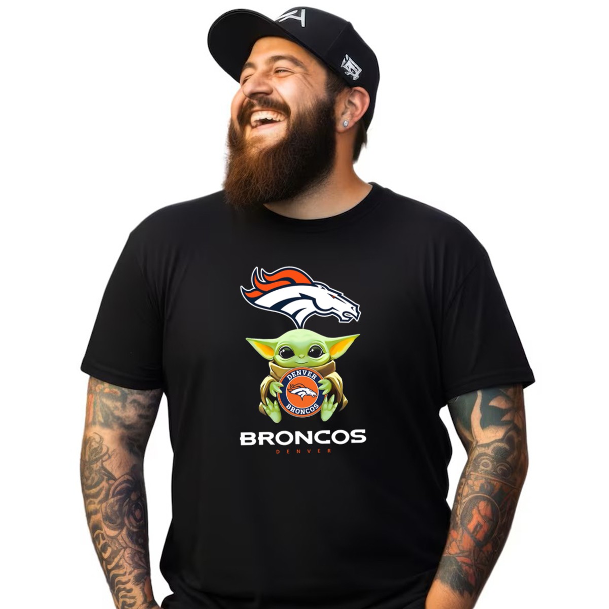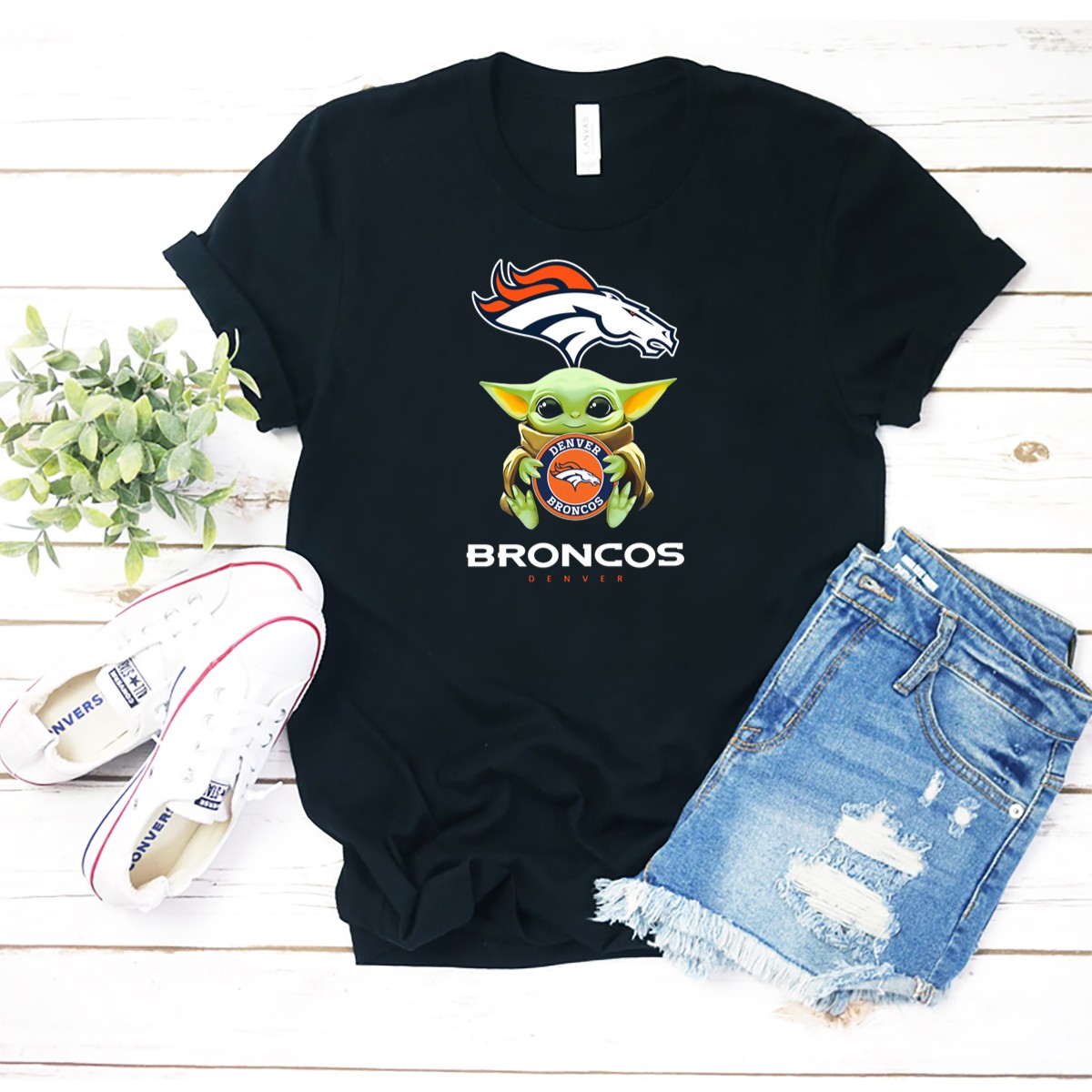 Denver Broncos Grogu Holding Team Emblem T-Shirt