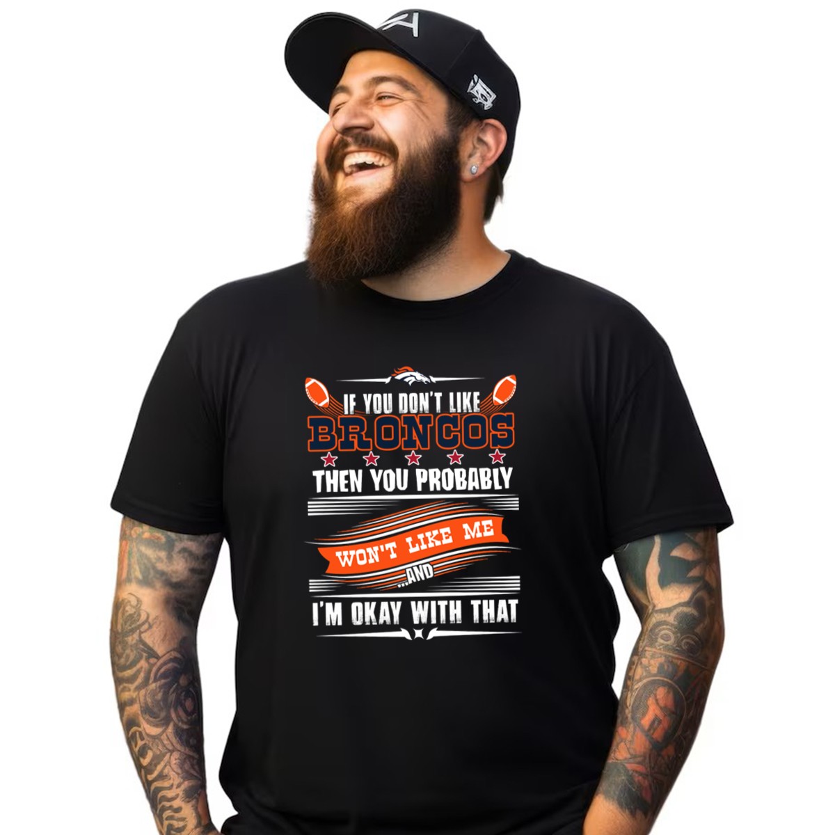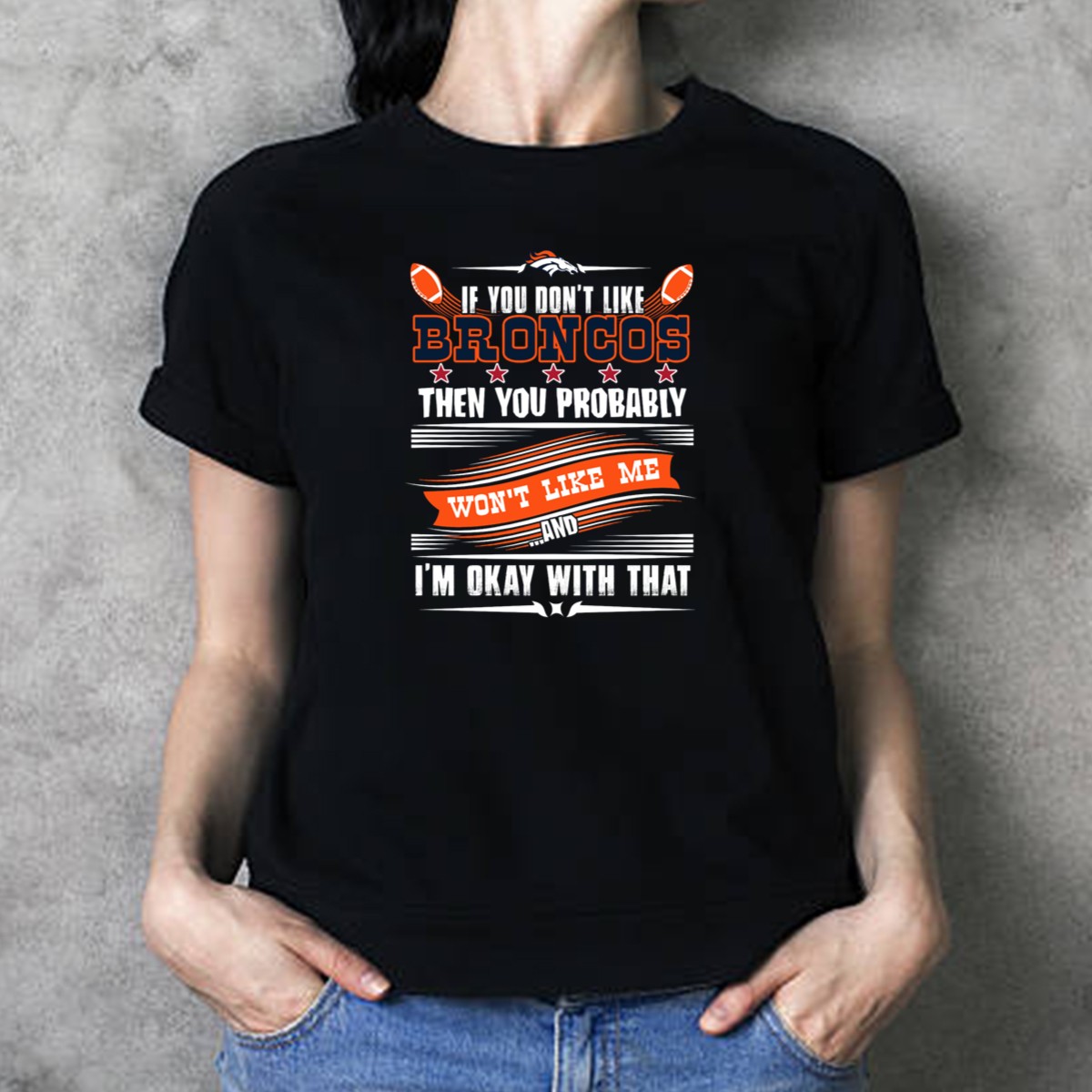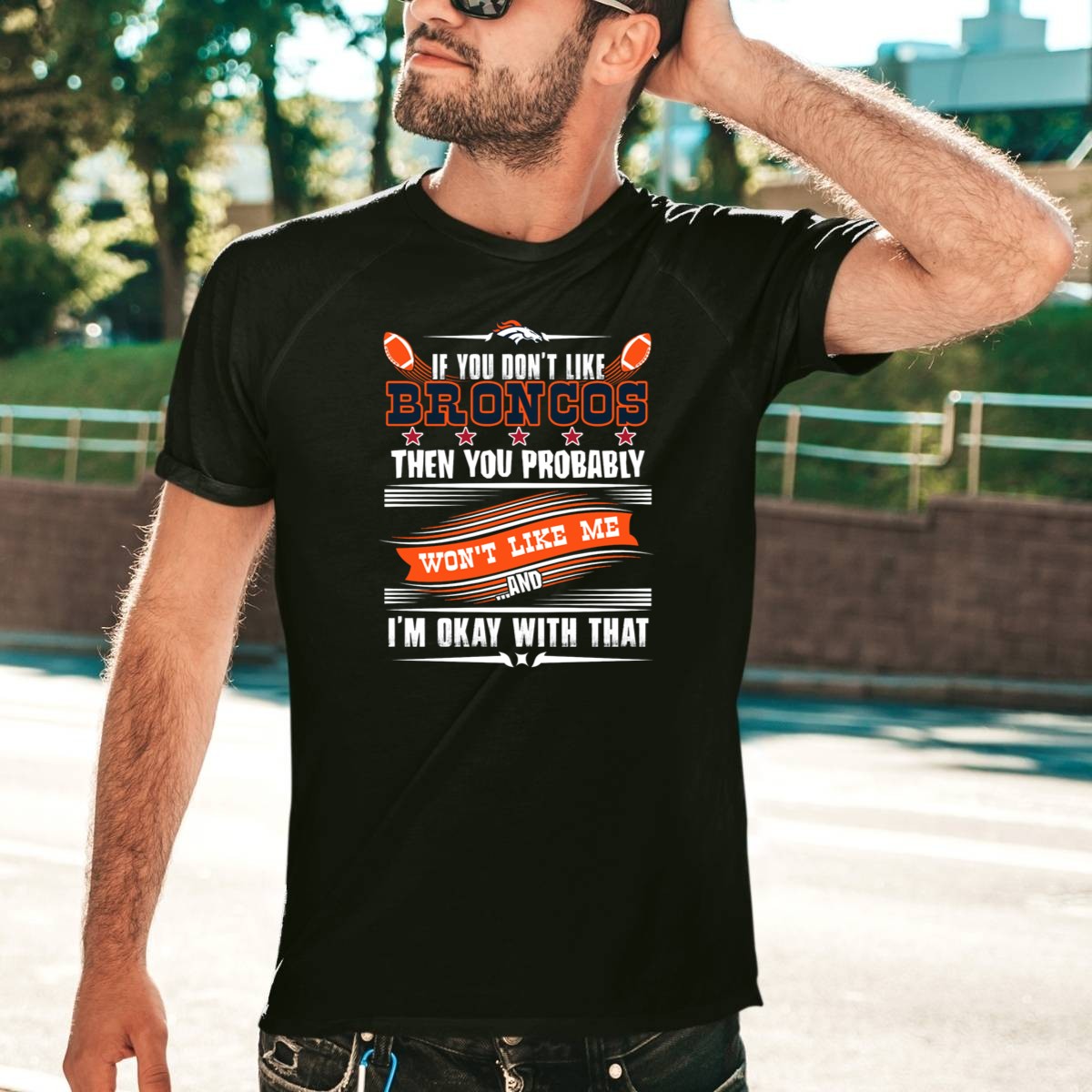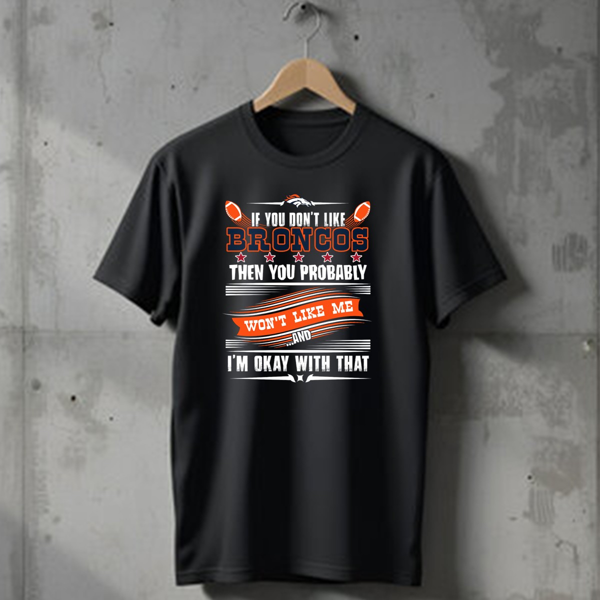Show your unwavering support for the Denver Broncos with this fun and bold “If You Don’t Like Broncos Then You Probably Won’t Like Me And I’m Okay With That” T-shirt! Designed for true fans, this shirt is perfect for game days, casual outings, or themed events where you want to showcase your team spirit. Made with a fan-made design printed right here in the USA, it’s not just a shirt; it’s a statement about your loyalty and love for the Broncos!