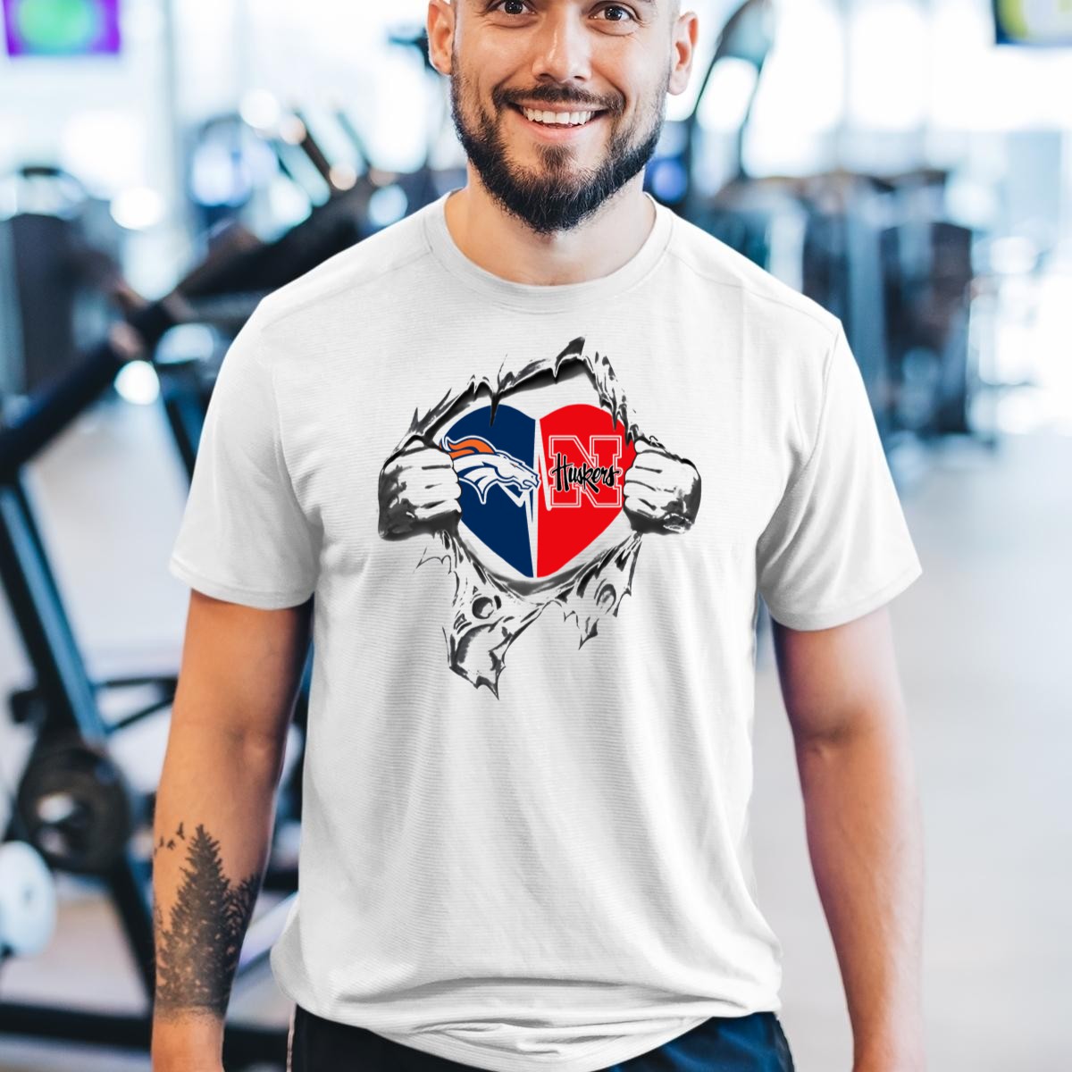 Denver Broncos Nebraska Cornhuskers Heart Symbol With Logo And Hands Peeling T-Shirt