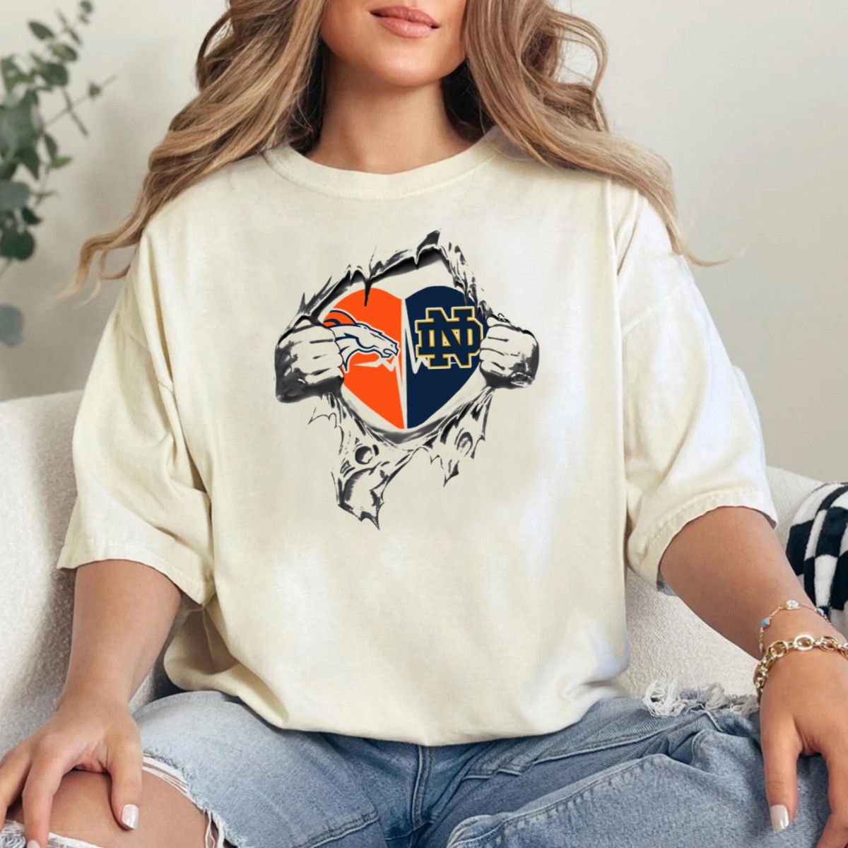 Show your love for both the Denver Broncos and the Notre Dame Fighting Irish with this unique Heart Rip T-Shirt! Designed for fans who appreciate the passion of sports, this shirt is perfect for game days, casual outings, or themed events. Made in the USA, the striking graphic showcases your team spirit in a stylish and comfortable way, making it a must-have for any dedicated supporter.