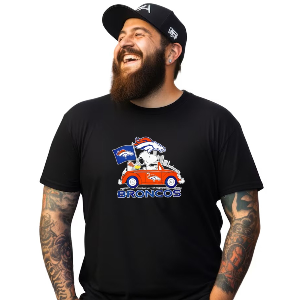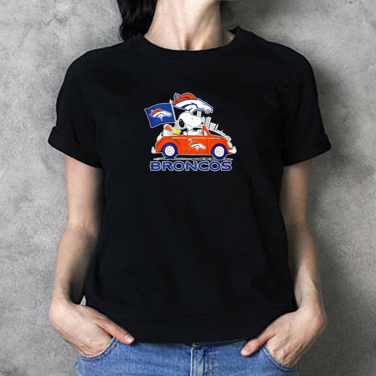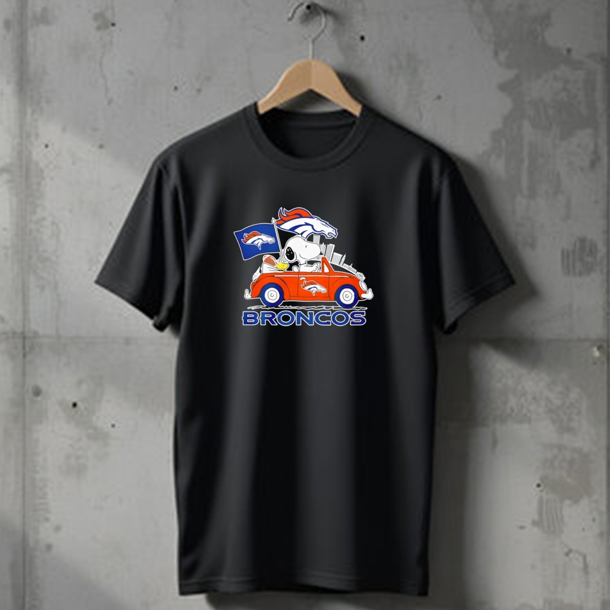 Denver Broncos Snoopy Woodstock Driving Car NFL Peanuts Crossover T-Shirt