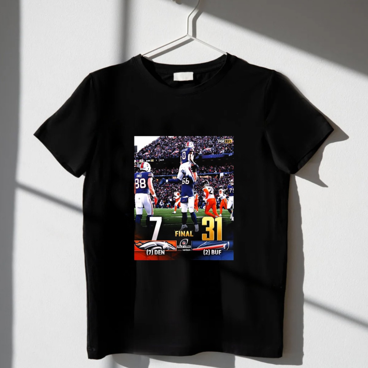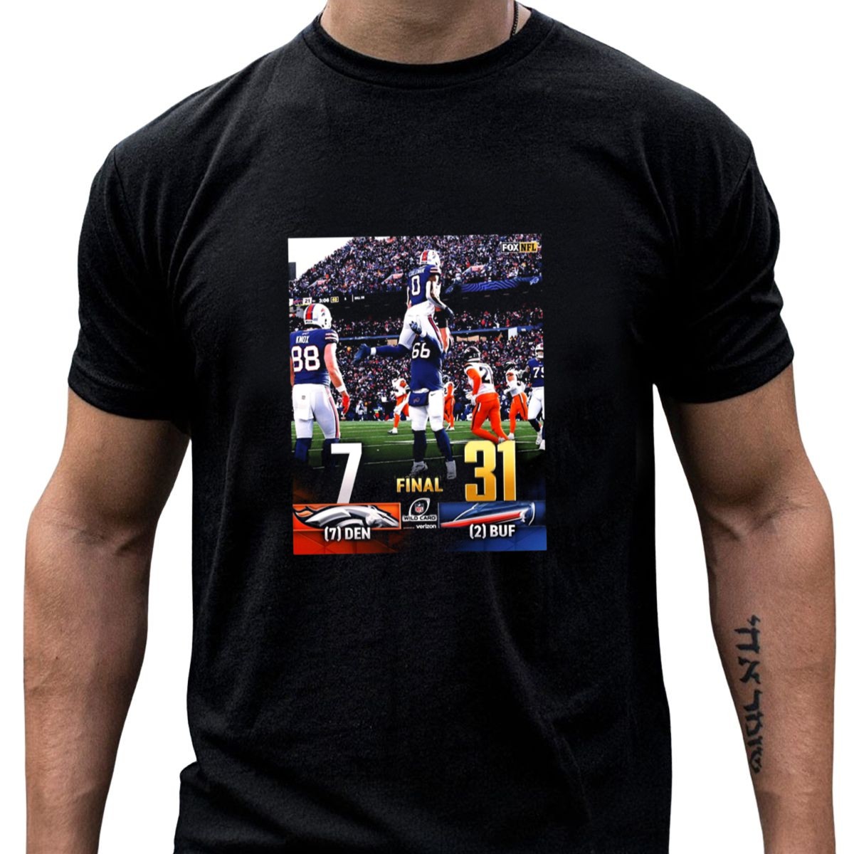 Show your support for the Denver Broncos and Buffalo Bills with this fan-made graphic T-shirt, featuring a bold print commemorating the thrilling NFL Wild Card Round matchup. Perfect for die-hard football fans, this shirt is designed for casual wear, themed events, or just lounging around while reliving the excitement of the game. Made with soft and durable cotton, this tee combines comfort and style, making it a must-have for any sports enthusiast.