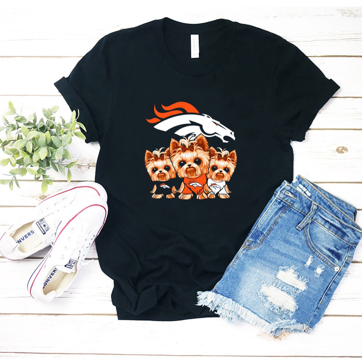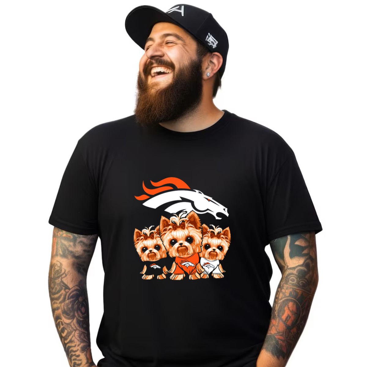 Show off your love for the Denver Broncos and your furry friends with this charming graphic T-shirt featuring three adorable Yorkies decked out in team jerseys. Perfect for dog lovers and Broncos fans alike, this shirt is ideal for casual outings, themed events, or simply lounging at home. Made with a unique fan-made design printed in the USA, it’s a delightful way to celebrate your favorite team while showcasing your passion for pets!