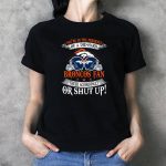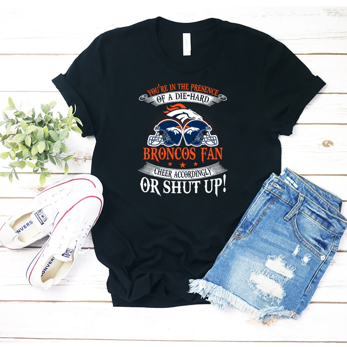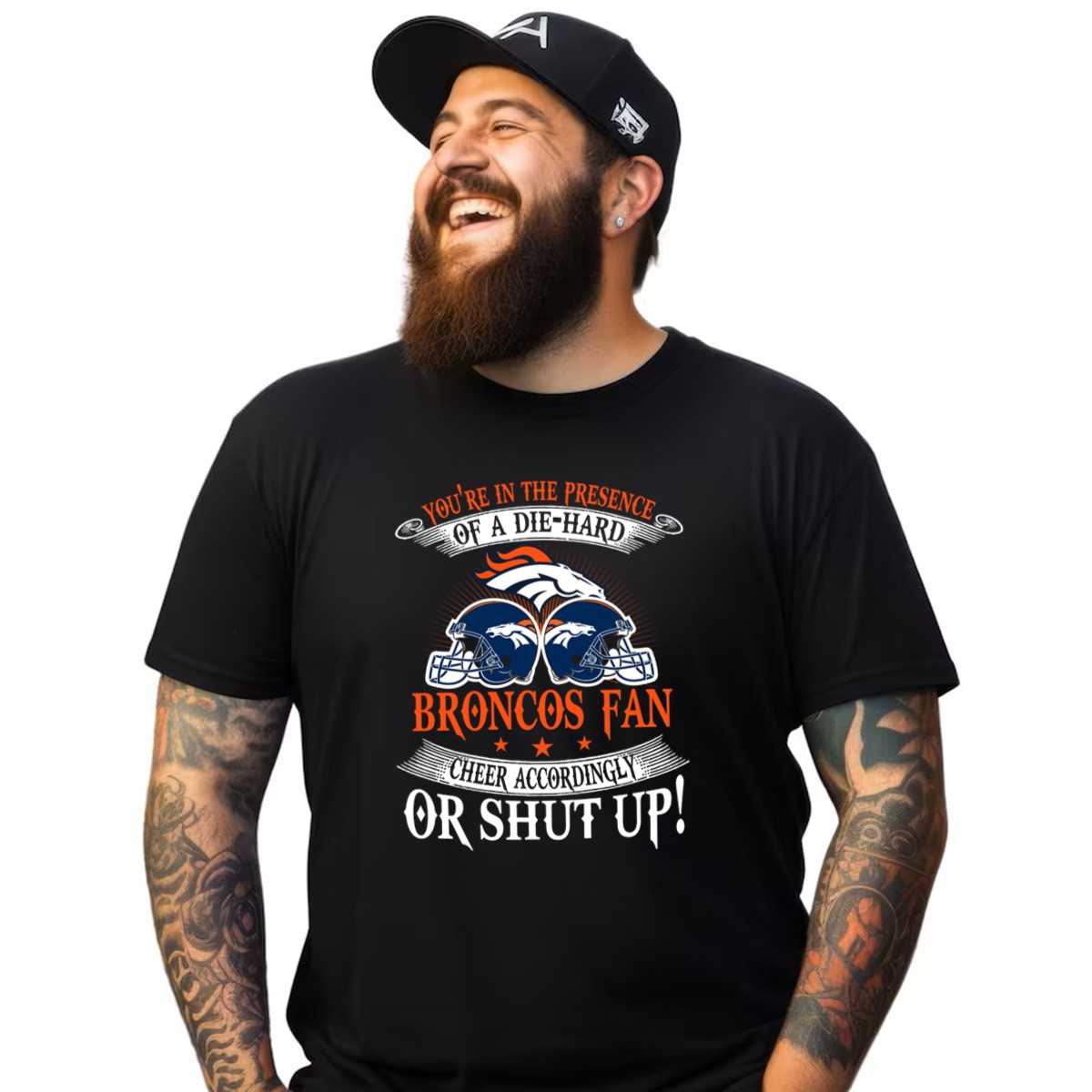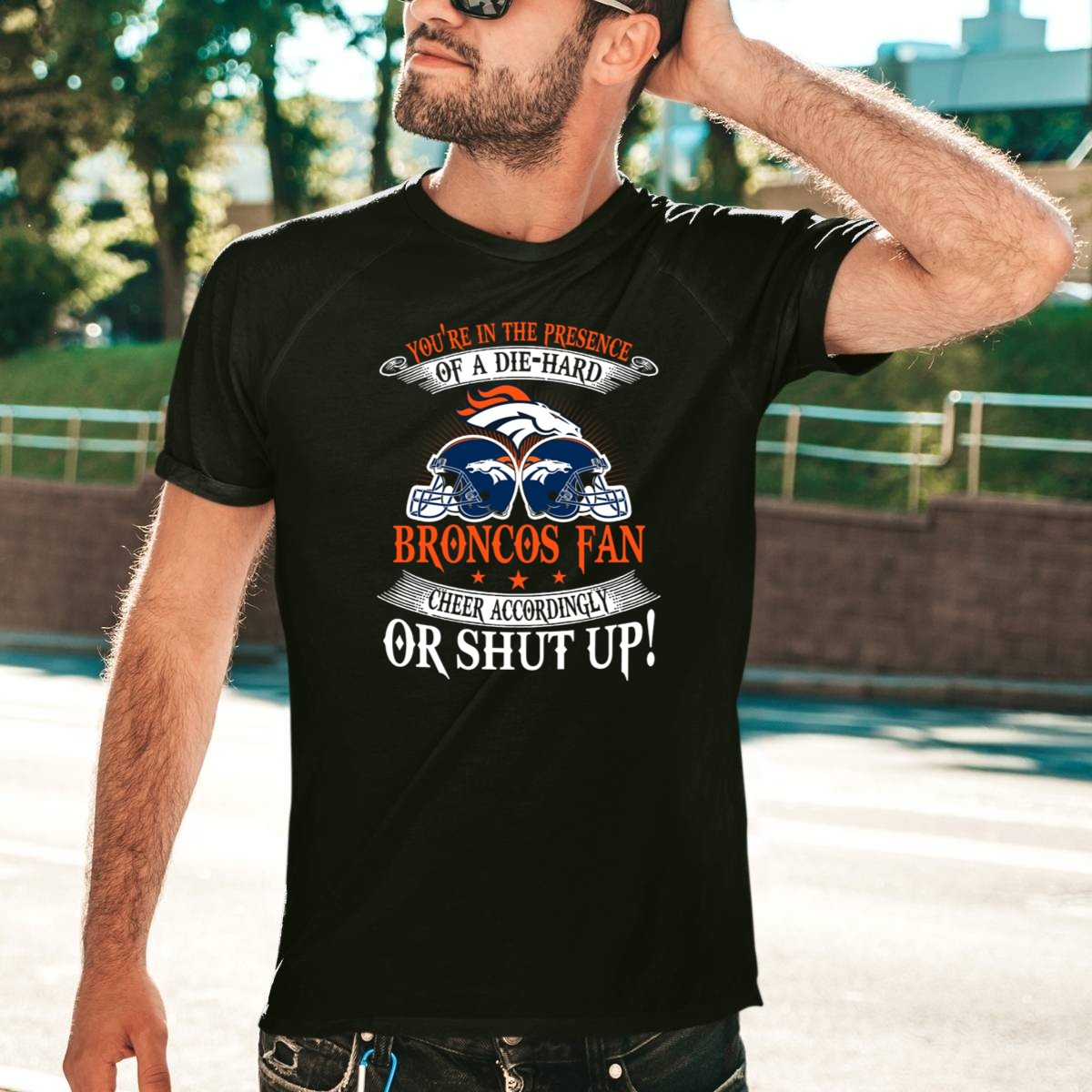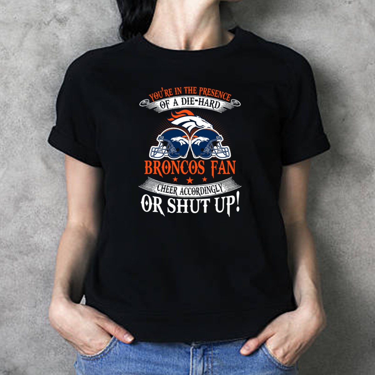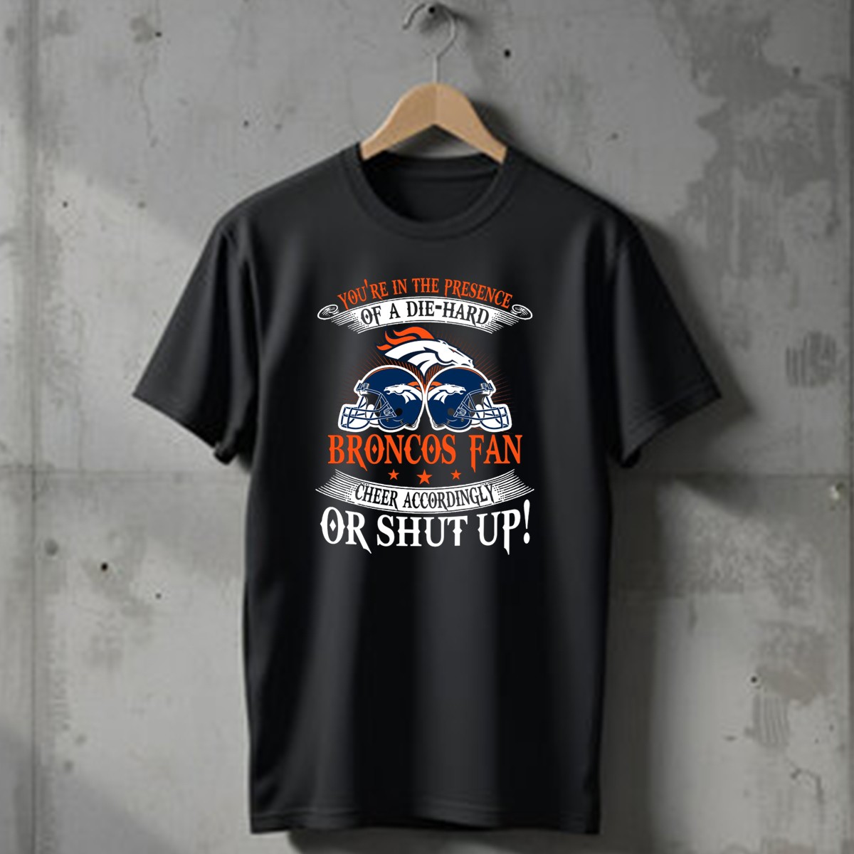Showcase your unwavering loyalty to the Denver Broncos with our “You’re In The Presence Of A Die Hard Fan, Cheer Accordingly Or Shut Up” T-shirt. Perfect for dedicated fans, this shirt is designed for game days, casual outings, or themed events where you want to represent your team with pride. Crafted with a unique fan-made design, this shirt not only expresses your passion but also ensures comfort and durability, making it an essential addition to any Broncos enthusiast’s wardrobe.