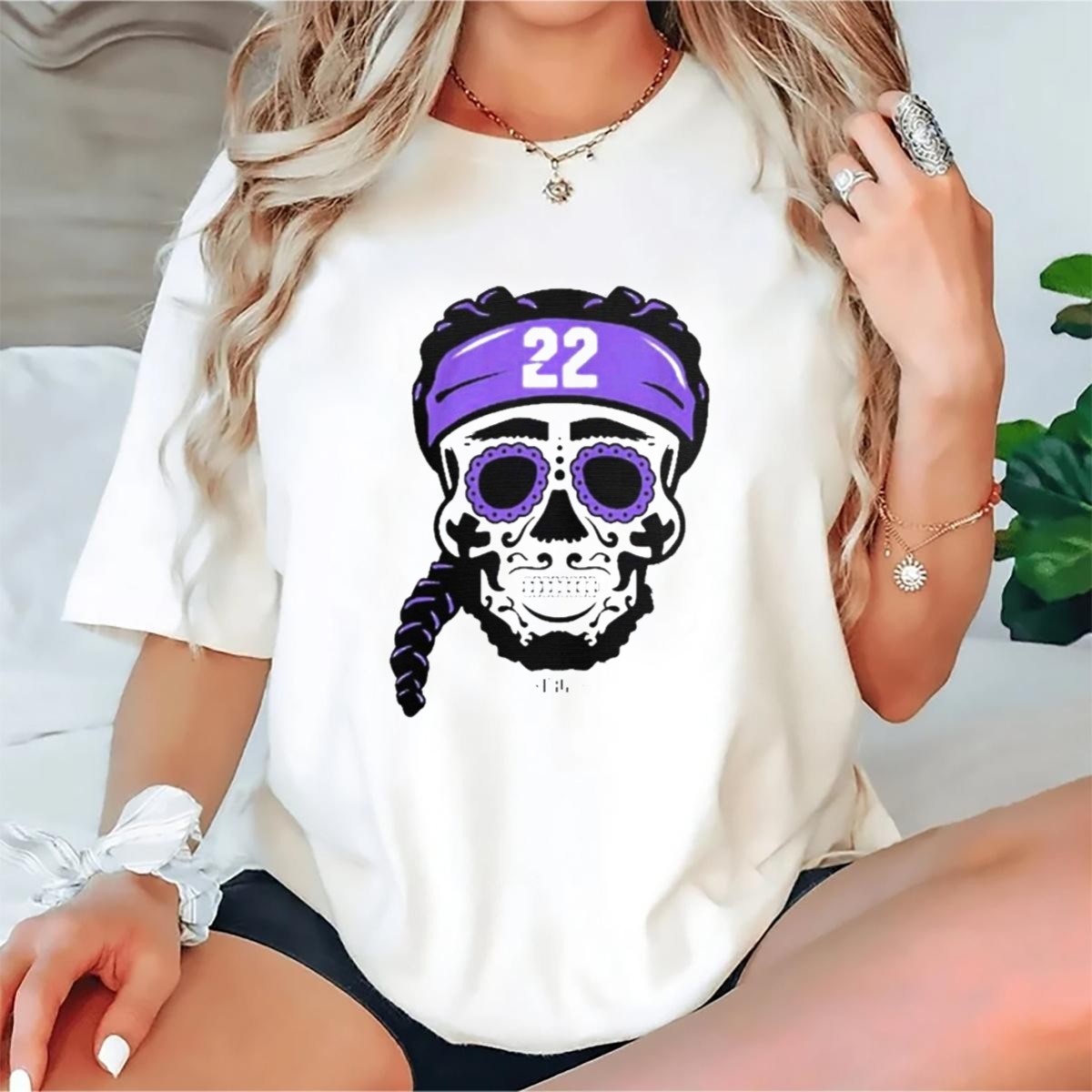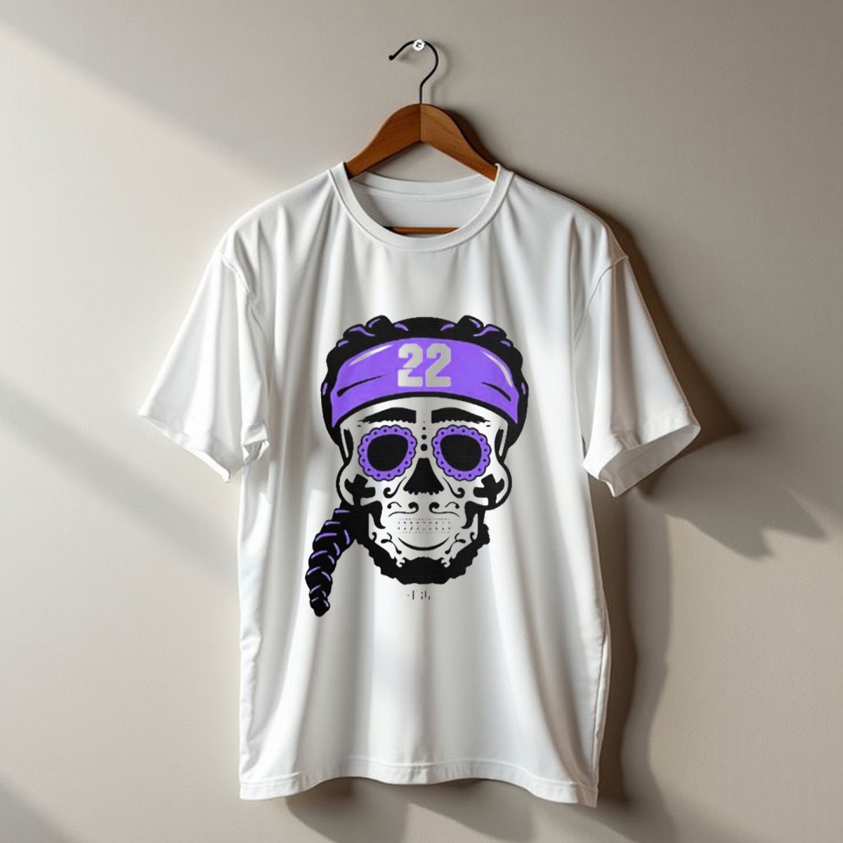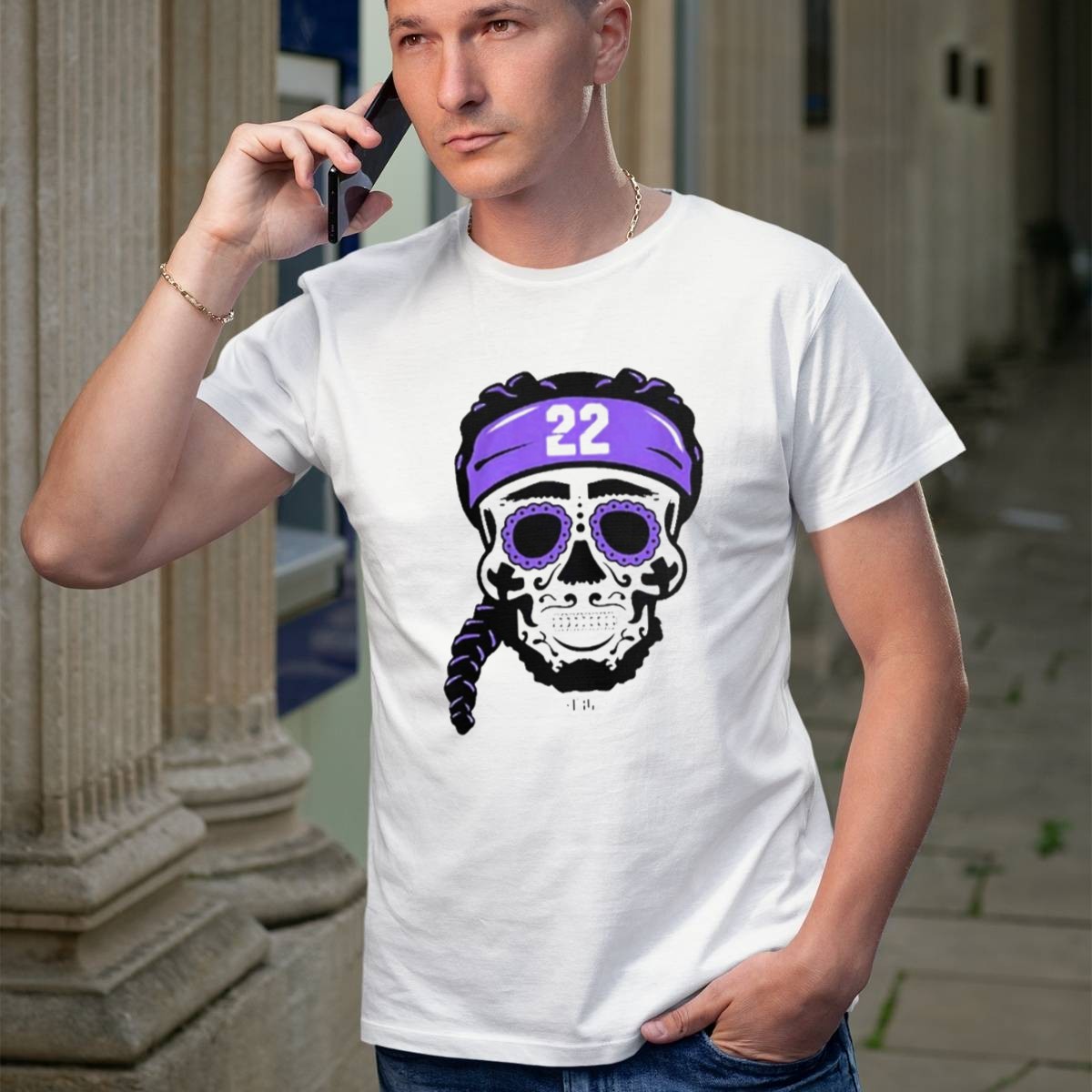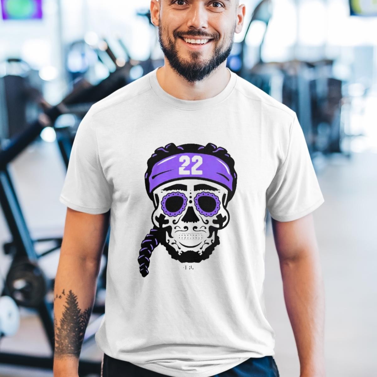 Celebrate your love for the game and showcase your unique style with the Derrick Henry 22 NFLPA Sugar Skull Baltimore Ravens Braids T-Shirt. This eye-catching graphic tee is perfect for passionate fans who want to stand out at casual outings, themed events, or while cheering for their favorite team. Made with a fan-made design printed in the USA, this shirt combines comfort and creativity, ensuring you make a bold statement wherever you go.