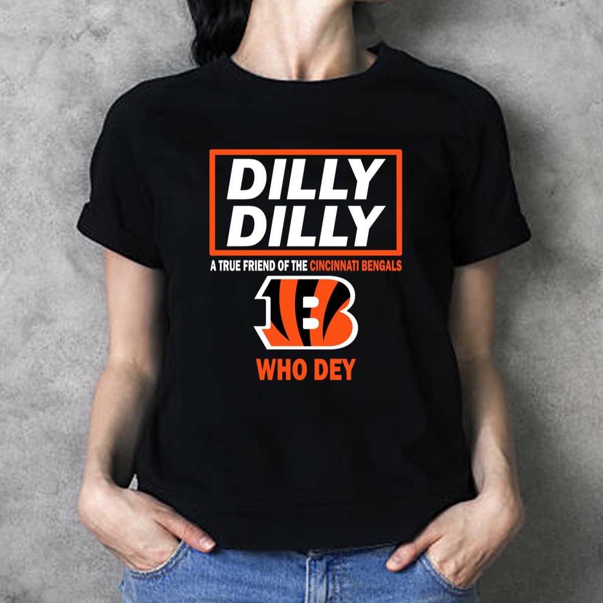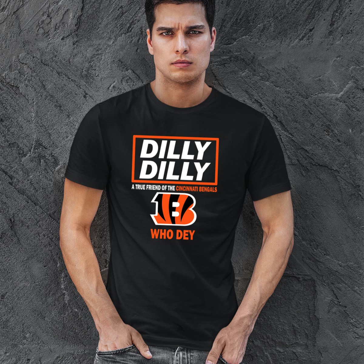 Show your unwavering support for the Cincinnati Bengals with our “Dilly Dilly A True Friend Of The Cincinnati Bengals Who Dey” T-shirt. This fan-made design is perfect for die-hard Bengals fans and is ideal for casual outings, themed events, or just everyday wear. Crafted for comfort and style, this shirt not only showcases your team spirit but also features a unique design that stands out, making it a must-have for any Bengals enthusiast.