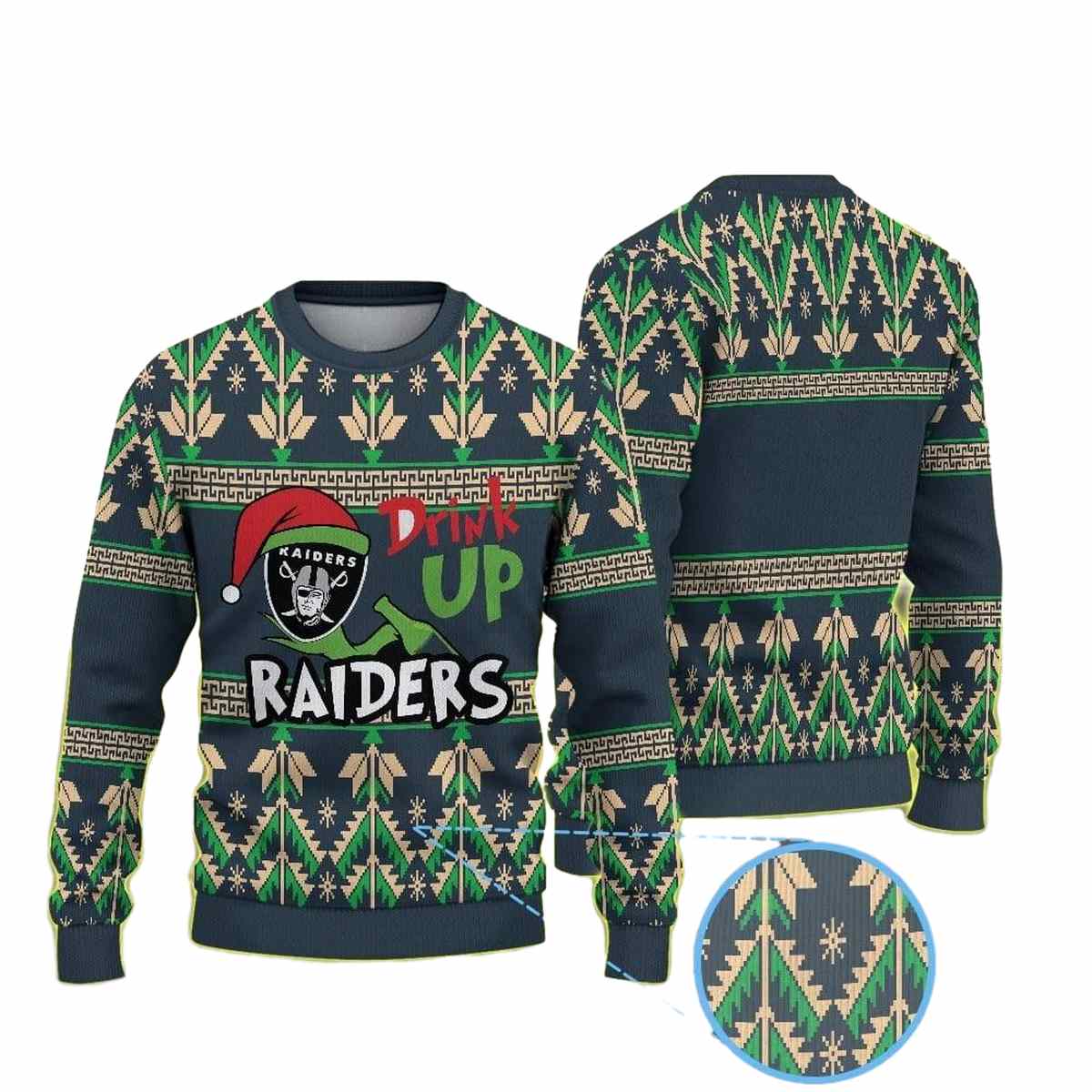 Get ready to elevate your holiday cheer with our Drink Up Raiders Santa Hat And Las Vegas Raiders Ugly Sweater! Perfect for fans who want to showcase their team spirit while celebrating the season, this sweater is ideal for holiday parties, cozy nights in, or game day gatherings. With its eye-catching design, this unique piece ensures you’ll stand out and spread festive vibes wherever you go!