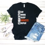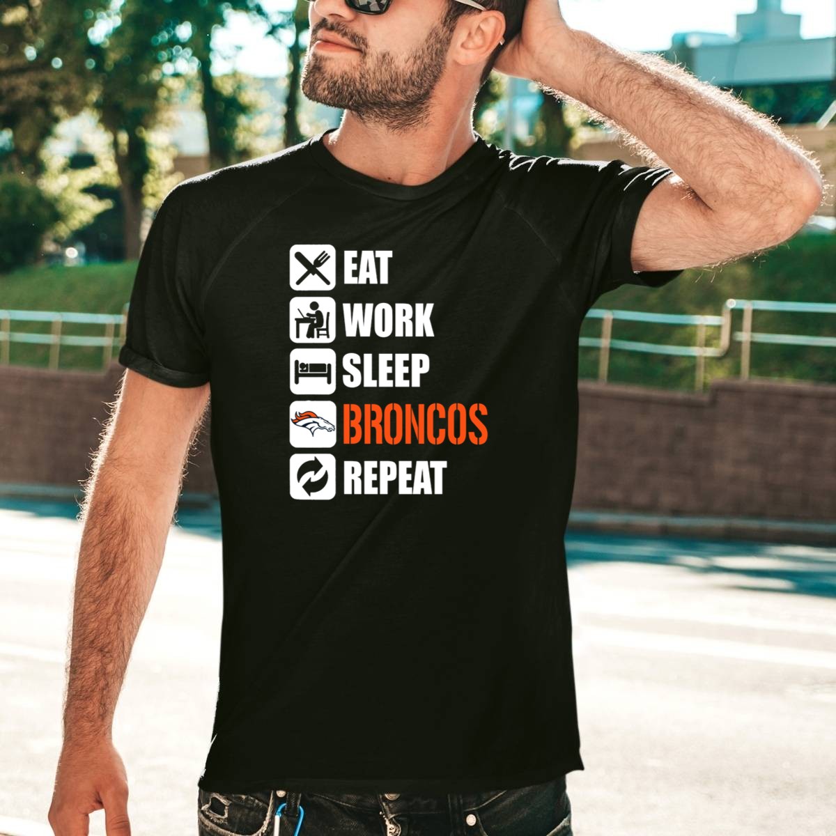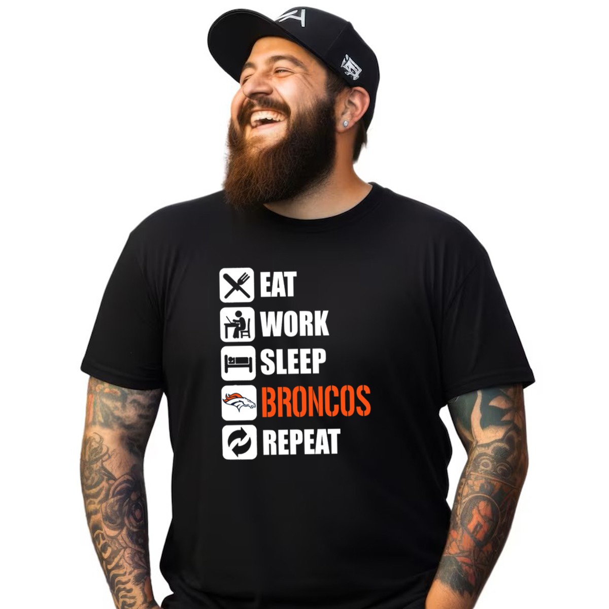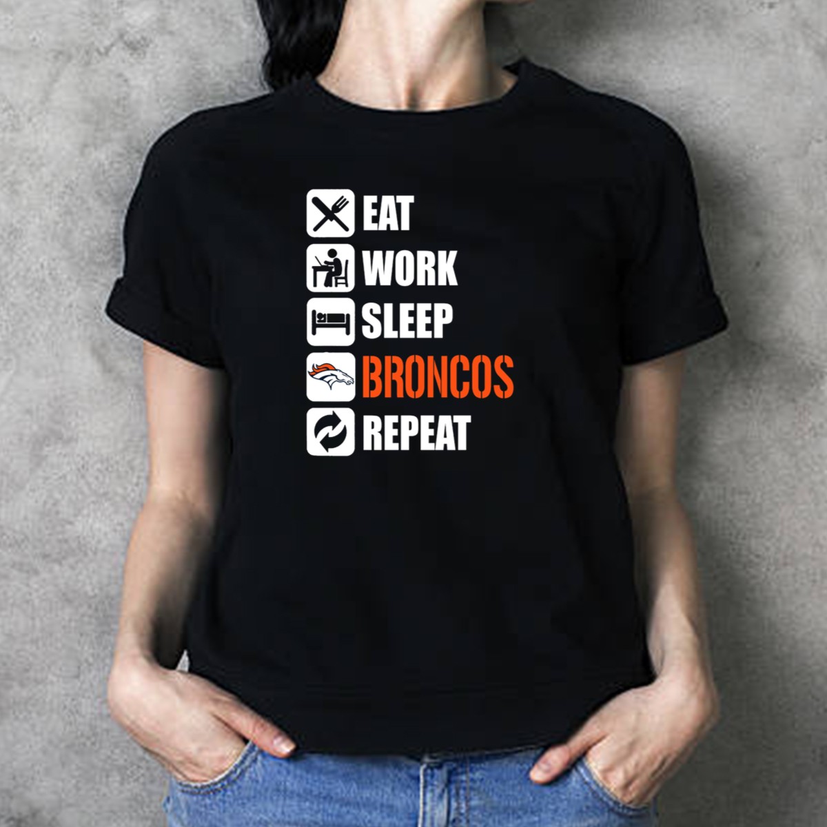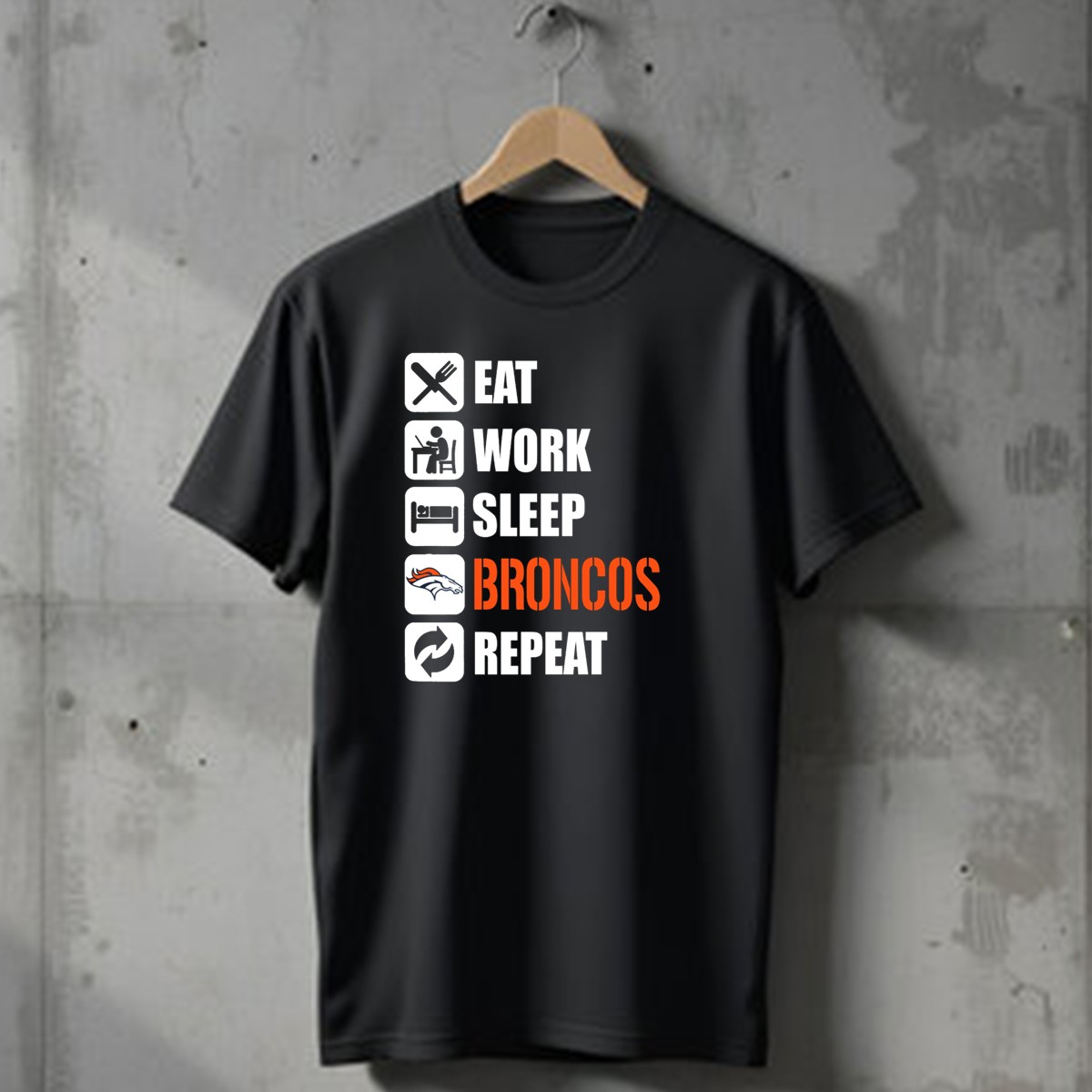 Show your unwavering support for the Denver Broncos with our “Eat Work Sleep Broncos Repeat” T-shirt! Perfect for die-hard fans and casual supporters alike, this shirt is ideal for game days, themed events, or simply lounging around. Crafted with a fan-made design that celebrates your love for the team, this shirt is printed in the USA, ensuring quality and style in every wear.