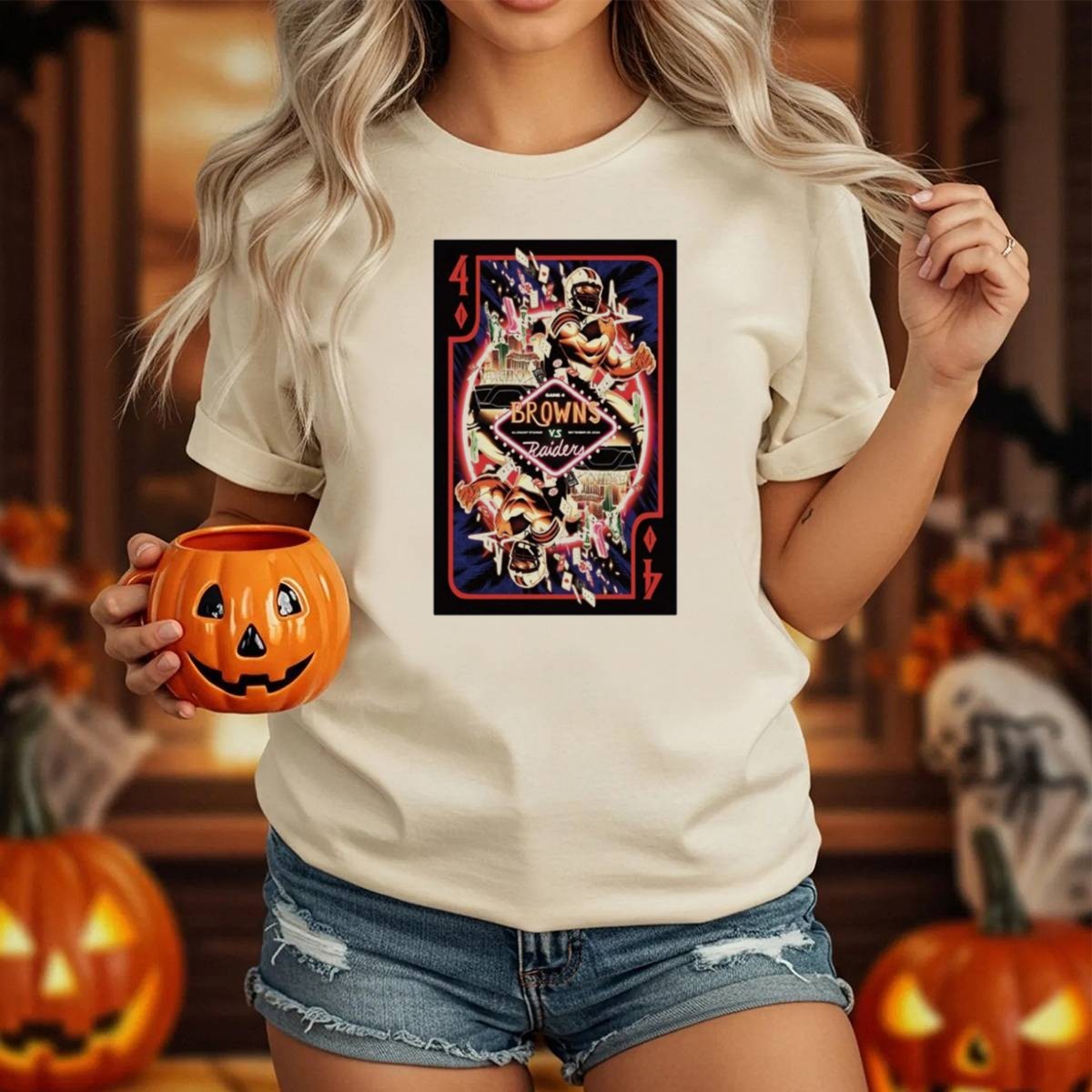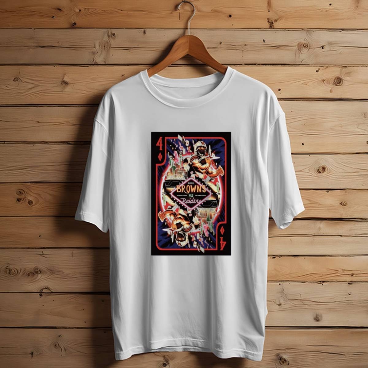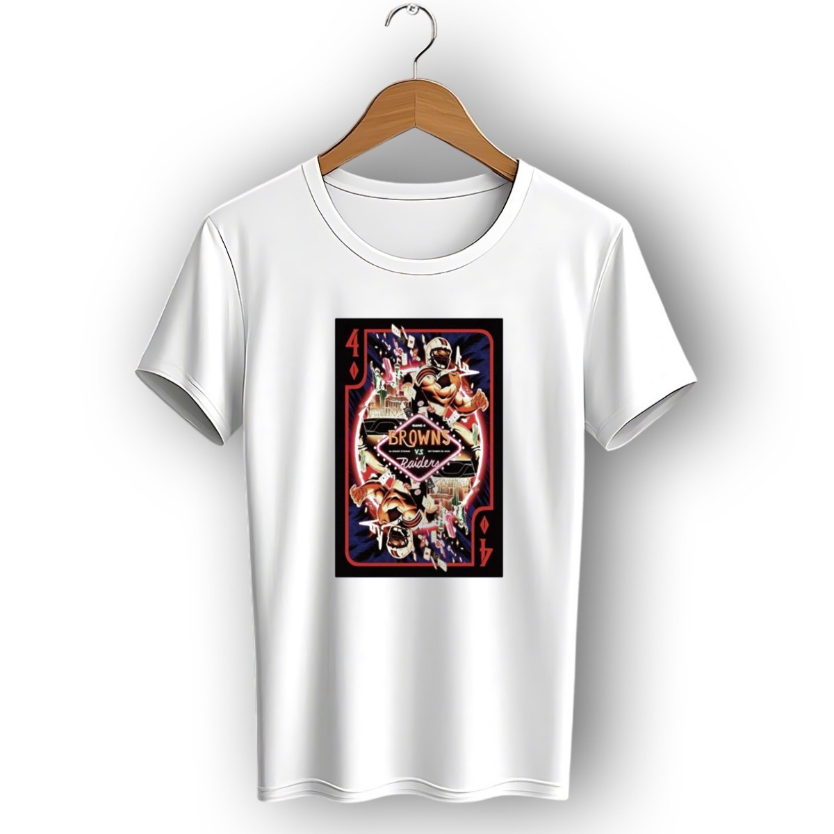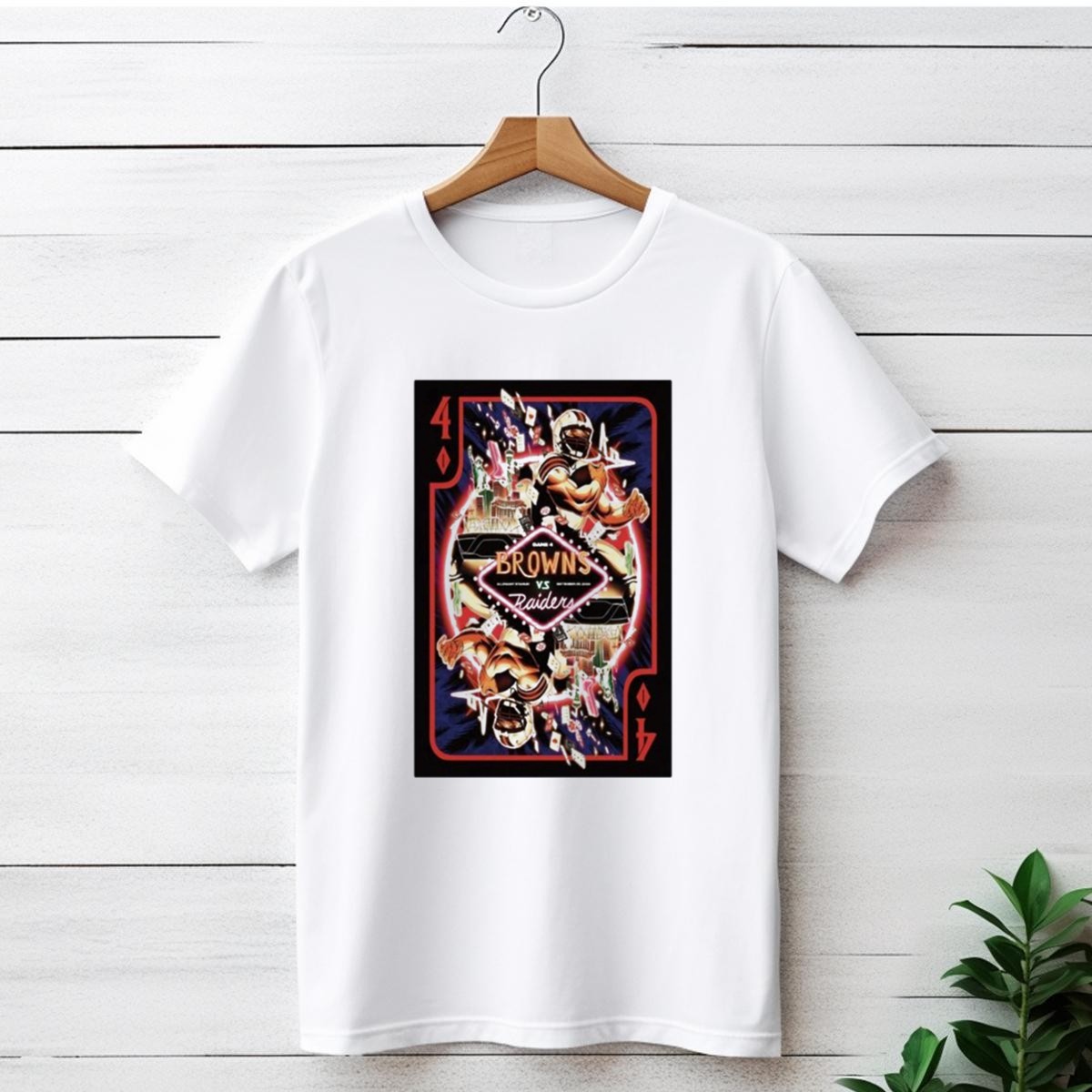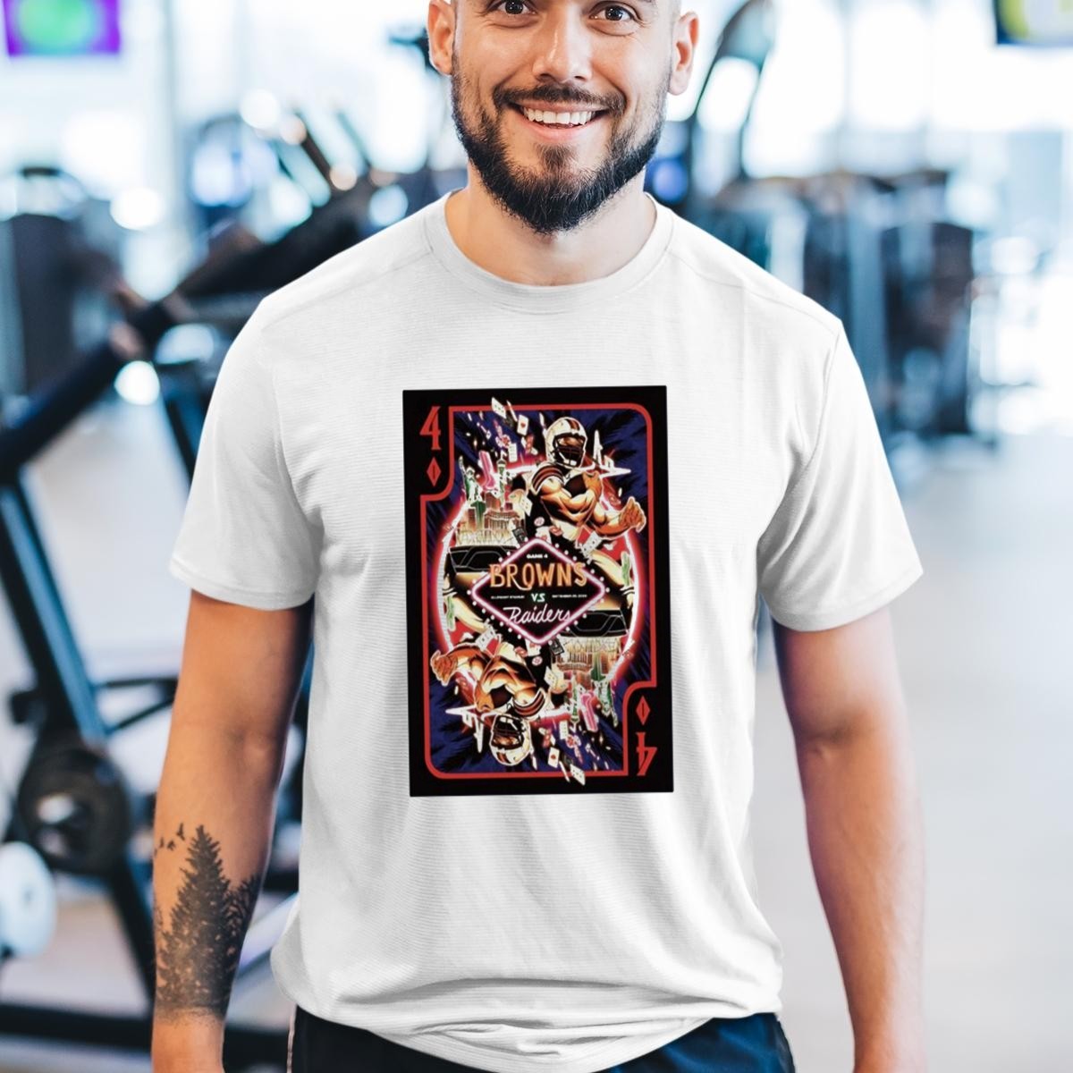 Gear up for the ultimate showdown with our Game 4 Browns Vs Raiders Allegiant Stadium Las Vegas T-Shirt! This fan-made graphic tee is perfect for die-hard football enthusiasts looking to showcase their team spirit. Whether you’re at the game, hosting a watch party, or just enjoying a casual day out, this shirt is designed to keep you comfortable and stylish. Made in the USA, it features a unique playing card design that celebrates this epic matchup, making it a must-have for any fan’s wardrobe.