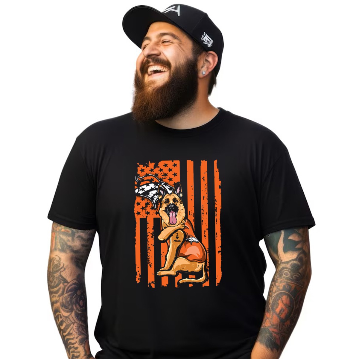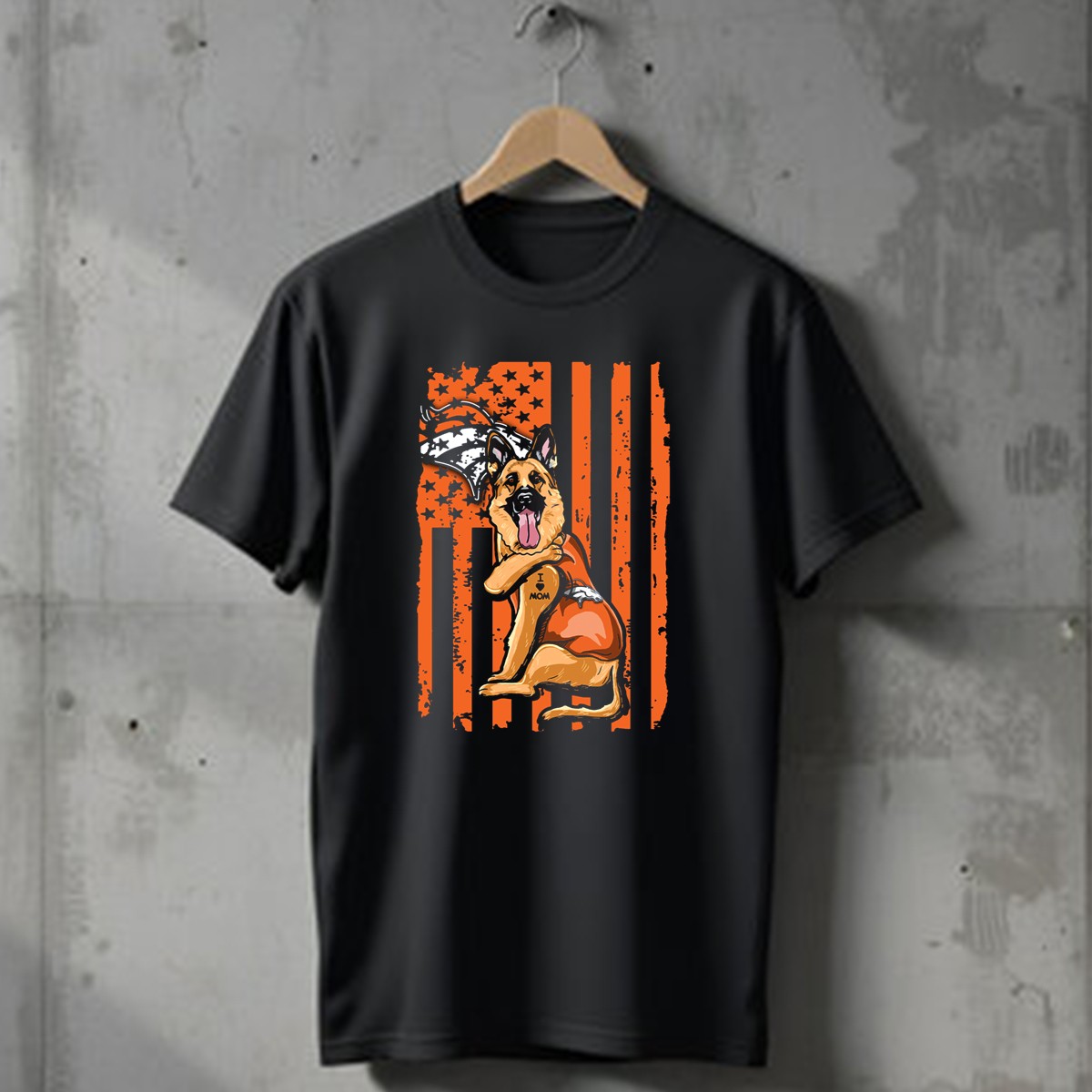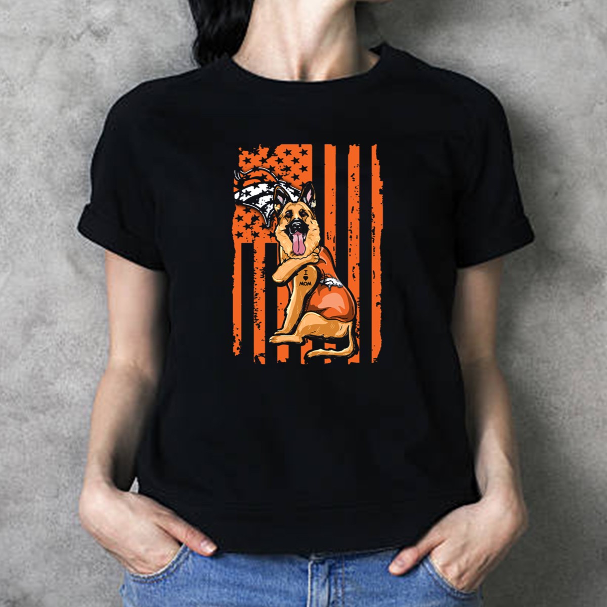 Show off your love for your furry friend and your favorite team with our German Shepherd I Love Mom Denver Broncos Dog USA Flag T-Shirt! This fan-made design is perfect for dog lovers and Denver Broncos enthusiasts alike. Ideal for casual outings, themed events, or just daily wear, this T-shirt combines comfort with style, making it a must-have for any proud dog owner. Proudly printed in the USA, this shirt is a unique way to express your passion for your pup and your team.