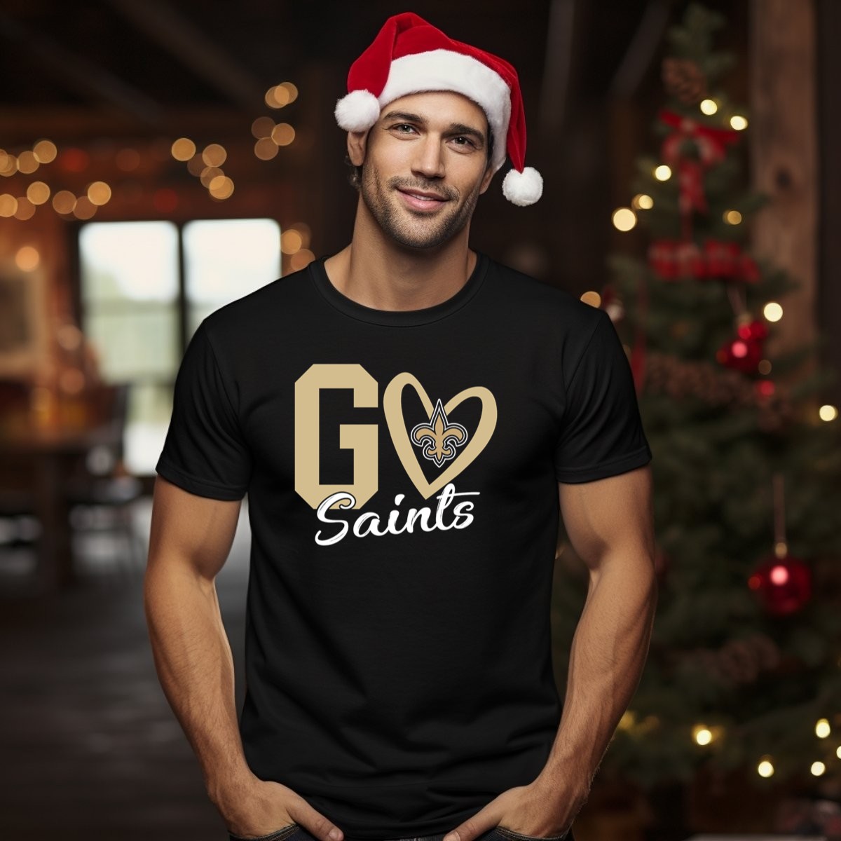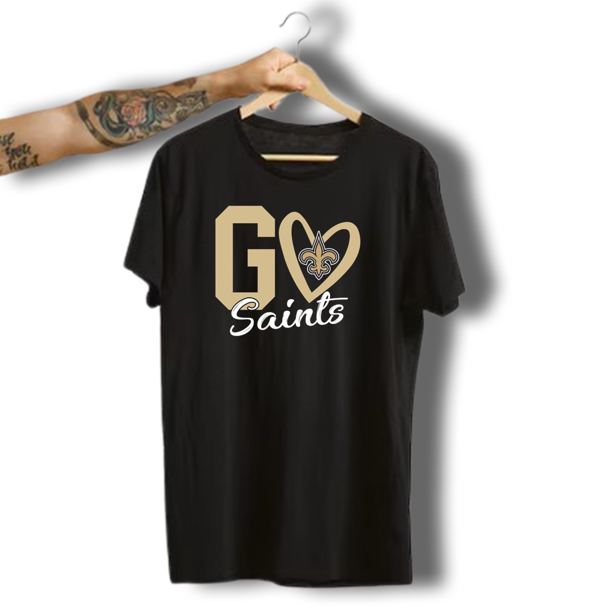 Show your unwavering support for the Saints with our Go Saints Fleur De Lis Heart T-Shirt! Perfect for die-hard fans, this shirt is ideal for casual outings, themed events, or just a day of cheering on your favorite team. The unique fan-made design proudly showcases your team spirit while ensuring comfort and style, making it a must-have addition to your wardrobe.