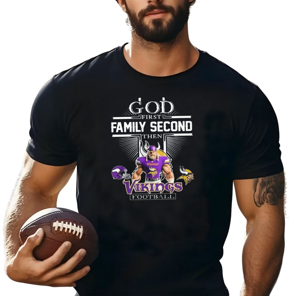 Celebrate your love for family, faith, and Vikings football with our exclusive “God First Family Second Then Vikings Football Mascot 2025” T-Shirt! This fan-made design is perfect for devoted Vikings supporters who want to showcase their passion during casual outings, themed events, or everyday activities. Made with high-quality materials and printed in the USA, this shirt combines comfort and style, making it a must-have for any true fan.