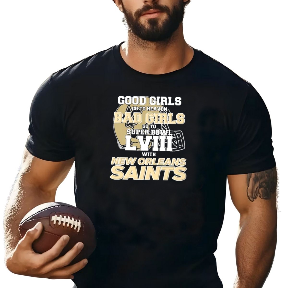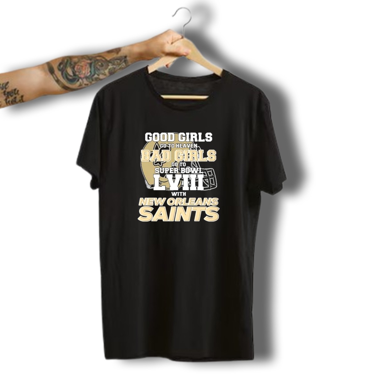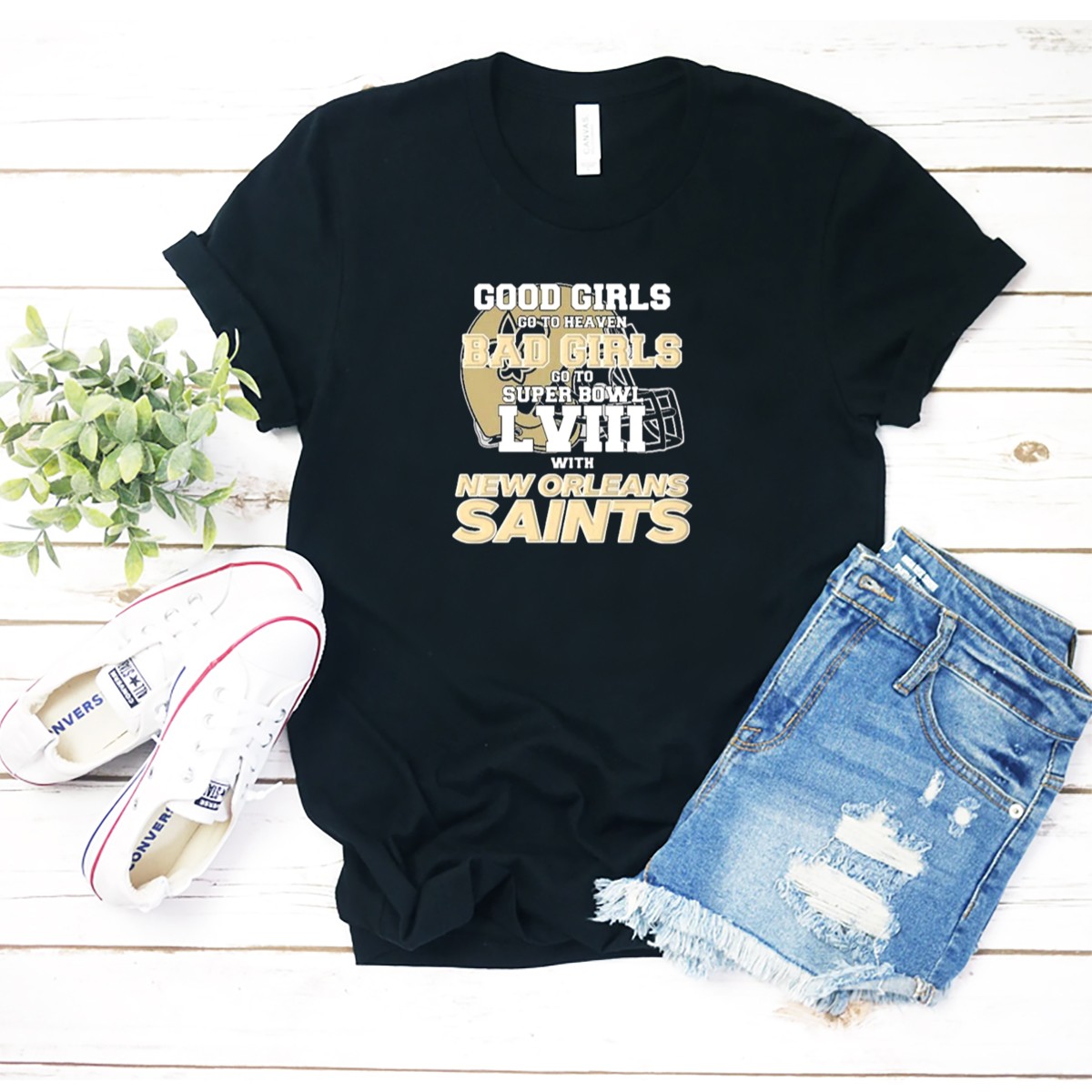 Show off your fun side with this spirited “Good Girls Go To Heaven, Bad Girls Go To Super Bowl LVIII” T-shirt, designed for the ultimate New Orleans Saints fans! Perfect for casual outings, themed events, or just lounging around, this shirt makes a bold statement while keeping you comfortable. Its fan-made design, printed right here in the USA, is sure to turn heads and spark conversations wherever you go.