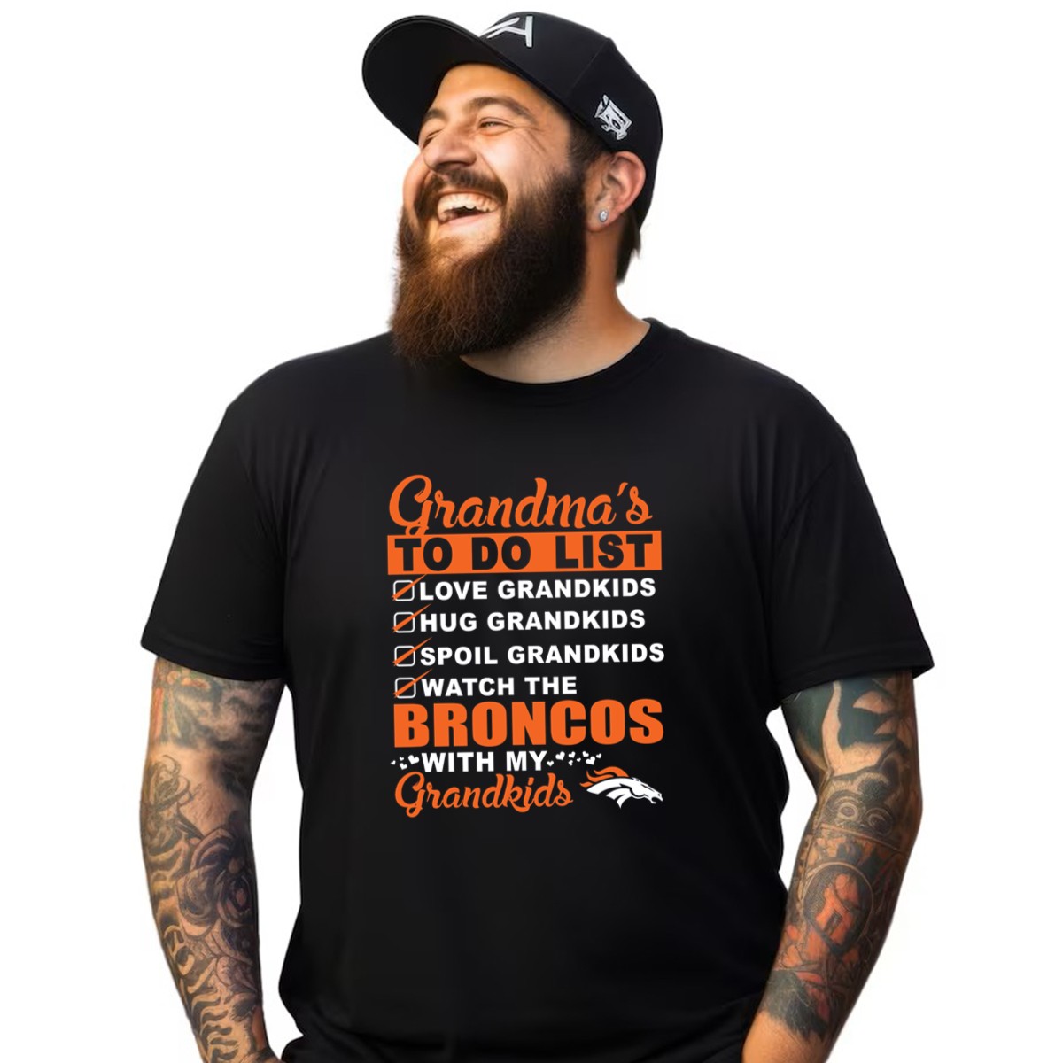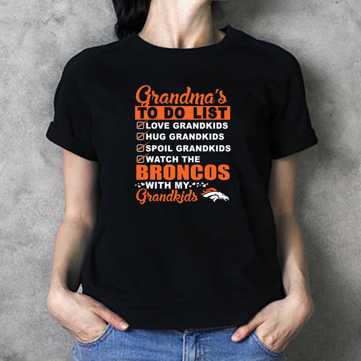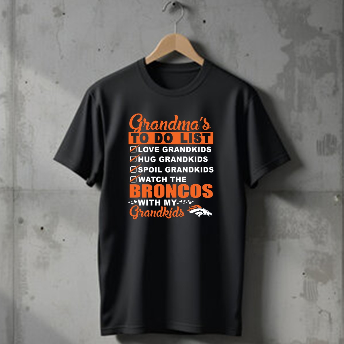 Celebrate the special bond between grandmas and grandkids with our “Grandmas To Do List: Love, Hug, Spoil, Watch Broncos” T-shirt! Perfect for devoted Denver Broncos fans, this shirt is designed for casual wear, themed events, or simply enjoying game days with family. Its fan-made design, proudly printed in the USA, makes it a unique addition to any grandma’s wardrobe, showcasing both her love for her grandkids and her passion for the Broncos.