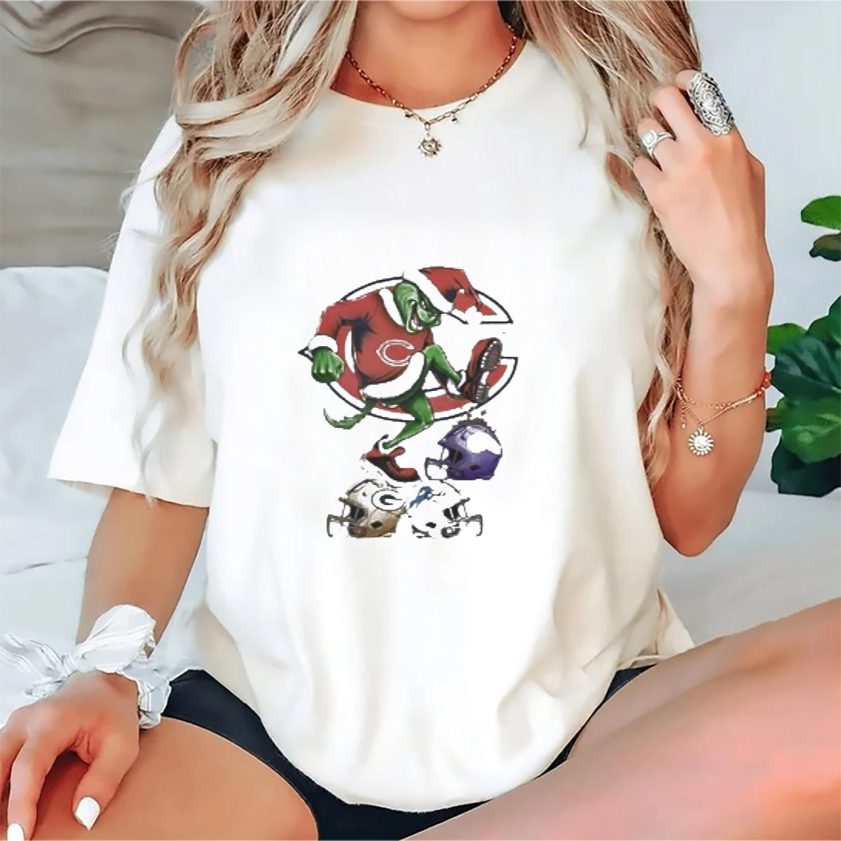 Get into the holiday spirit with our Grinch Christmas Chicago Bears Crush NFC North Rivals Helmets T-Shirt! Perfect for die-hard Bears fans and anyone looking to add a touch of festive fun to their wardrobe, this shirt is ideal for casual outings, themed events, or simply lounging around during the holiday season. With a unique fan-made design printed in the USA, it showcases your love for the Bears while embracing the whimsical charm of the Grinch, making it a standout piece for any fan.