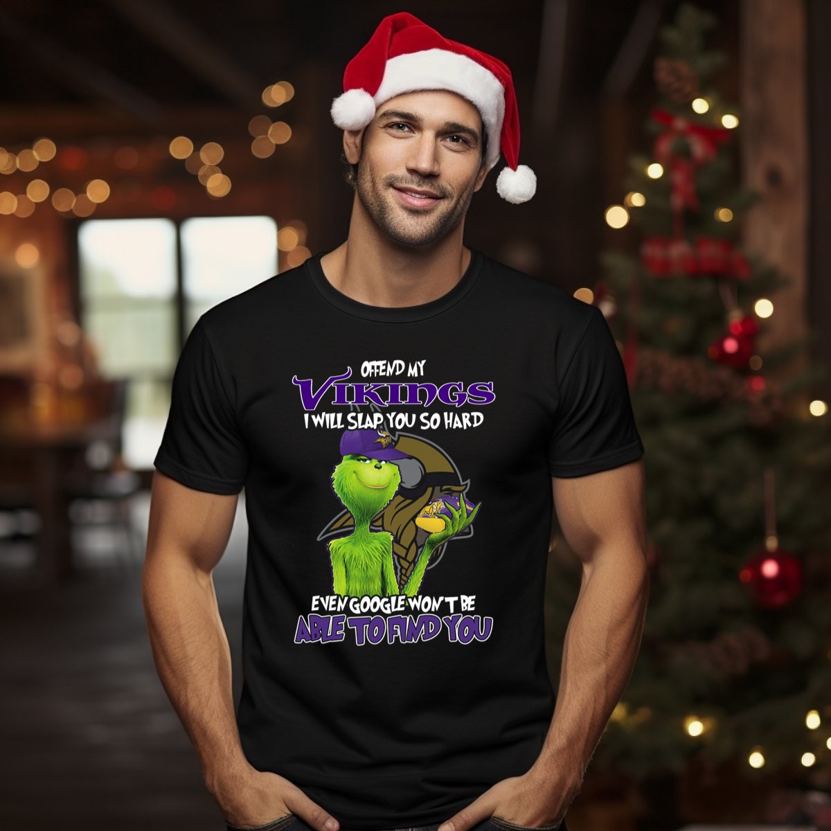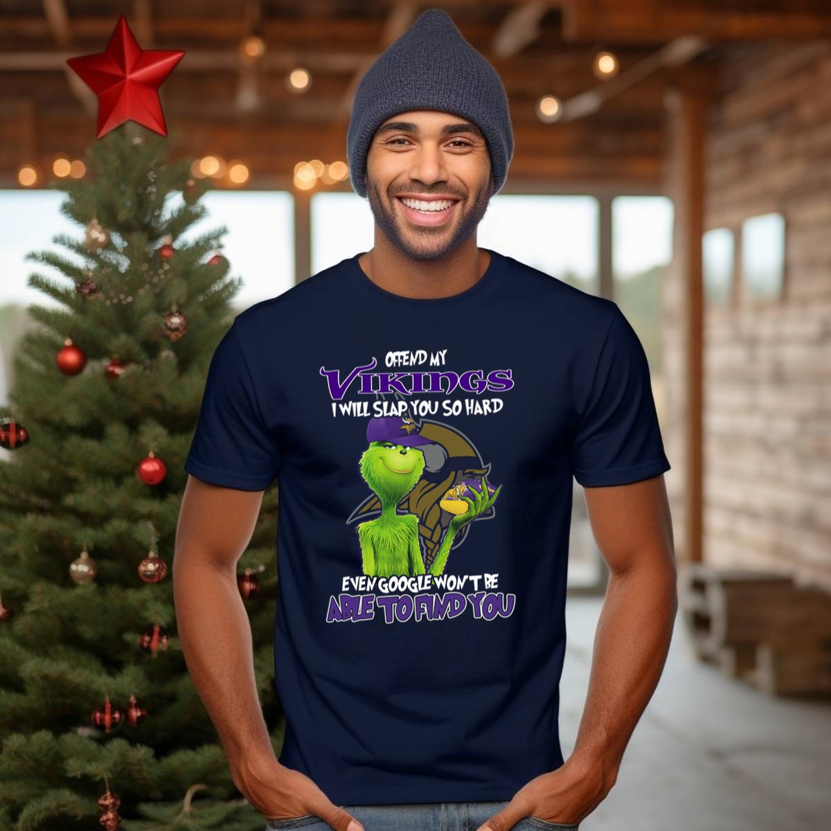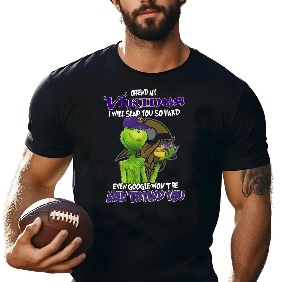Show off your quirky sense of humor with our “Grinch Offend My Vikings Even Google Won’t Be Able To Find You” T-shirt! Perfect for fans of both the Grinch and Vikings, this shirt is designed for those who love to stand out at casual outings, themed events, or just lounging around at home. Made with a fan-made design printed in the USA, it combines comfort and style, making it an essential addition to your wardrobe.